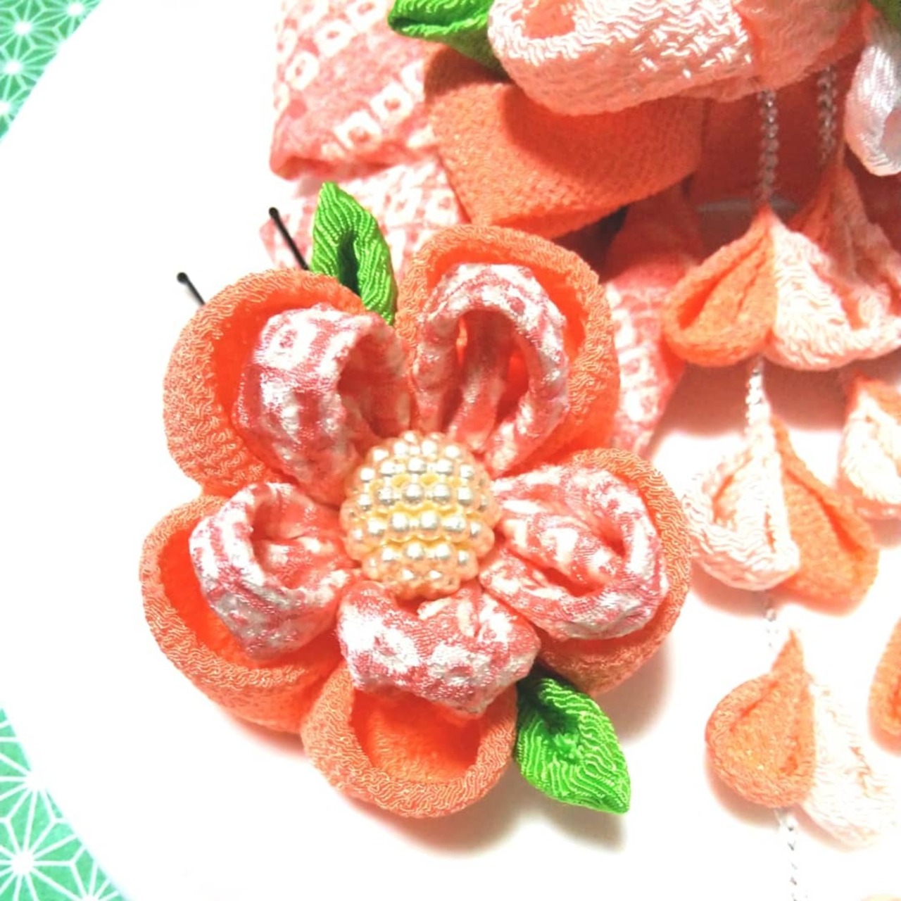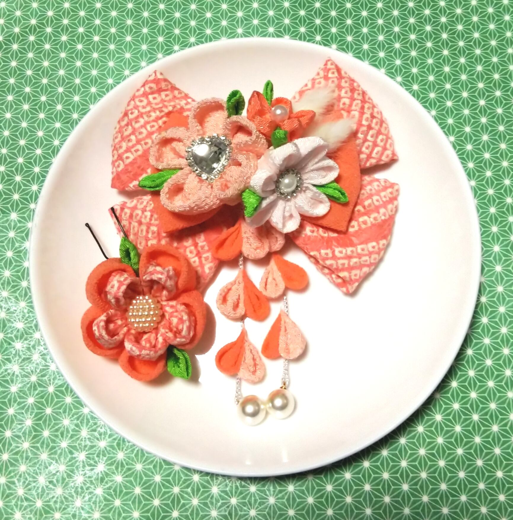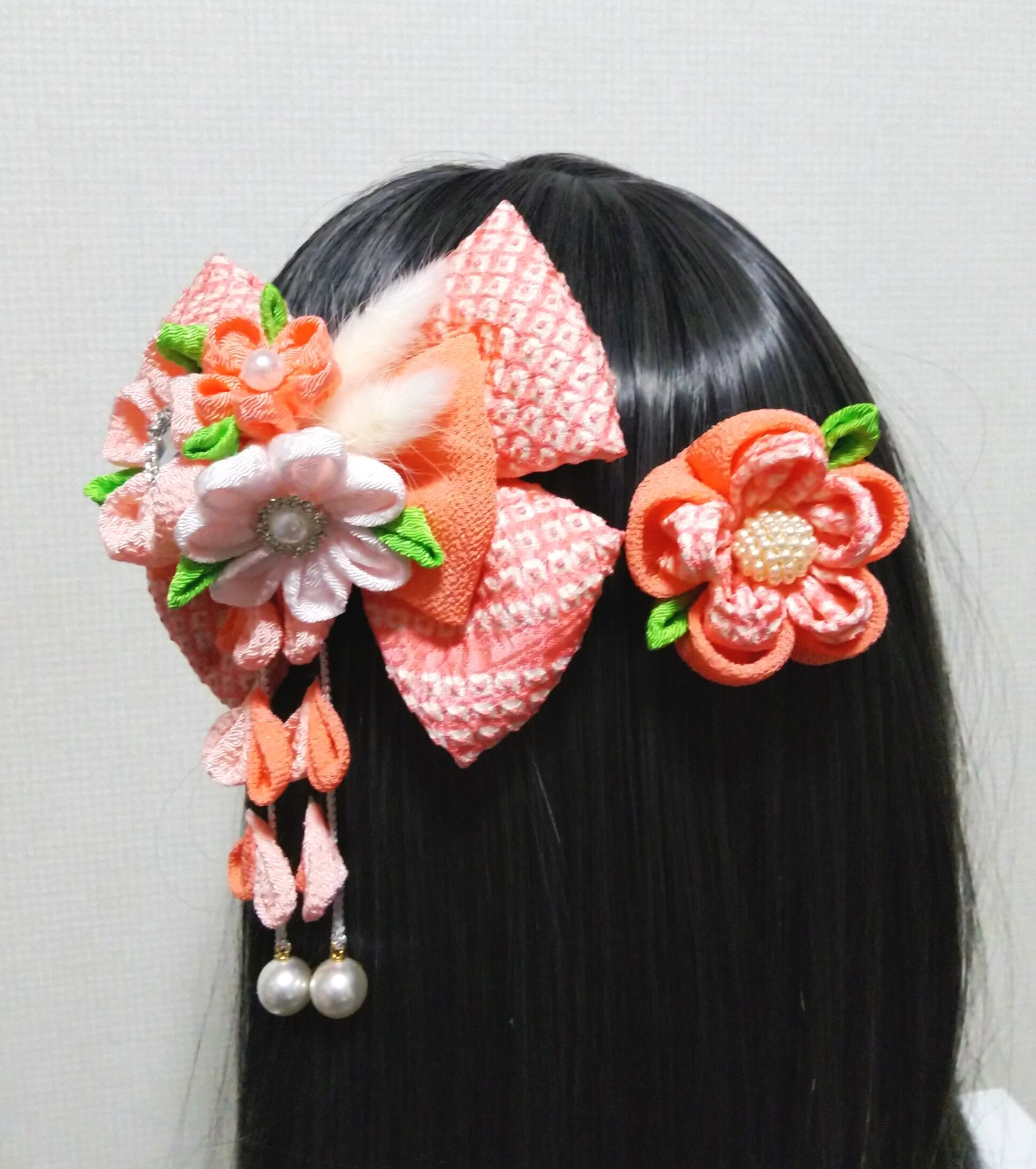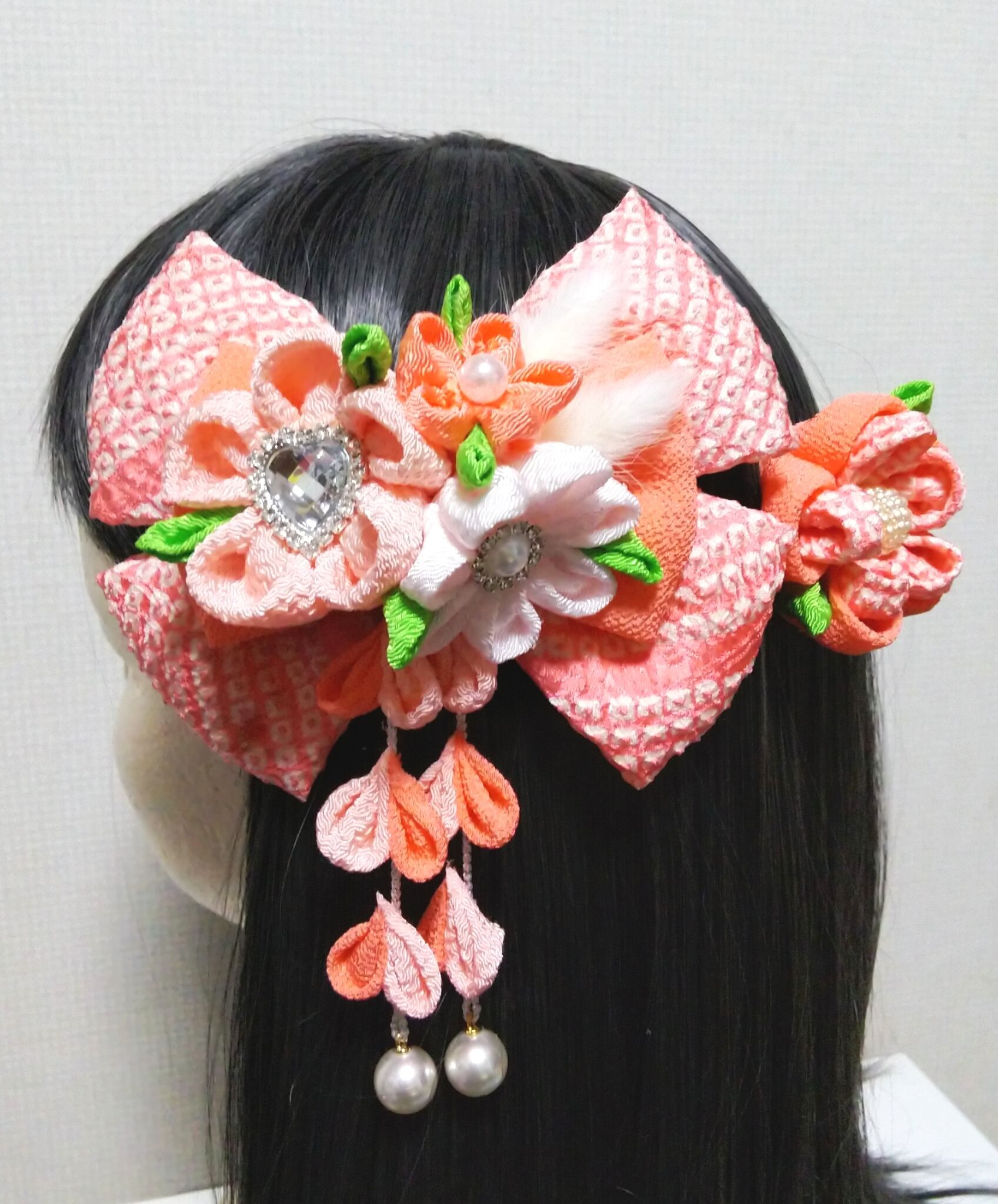 髪飾り 髪飾りサーモンピンク 髪飾りコーラルピンク リボン 成人式髪飾り 卒業式髪飾り 七五三髪飾り 浴衣髪飾り つまみ細工髪飾り
