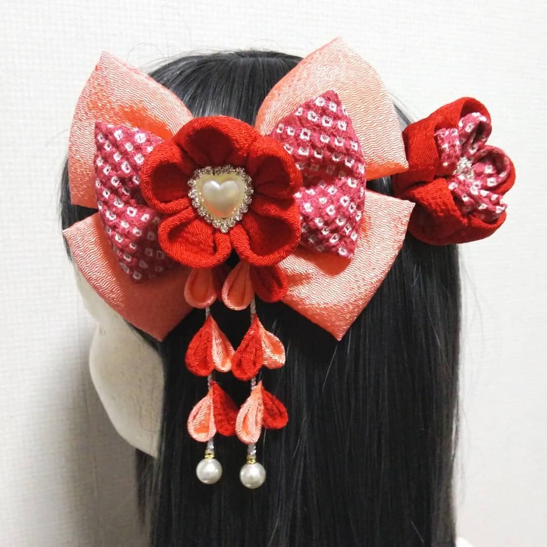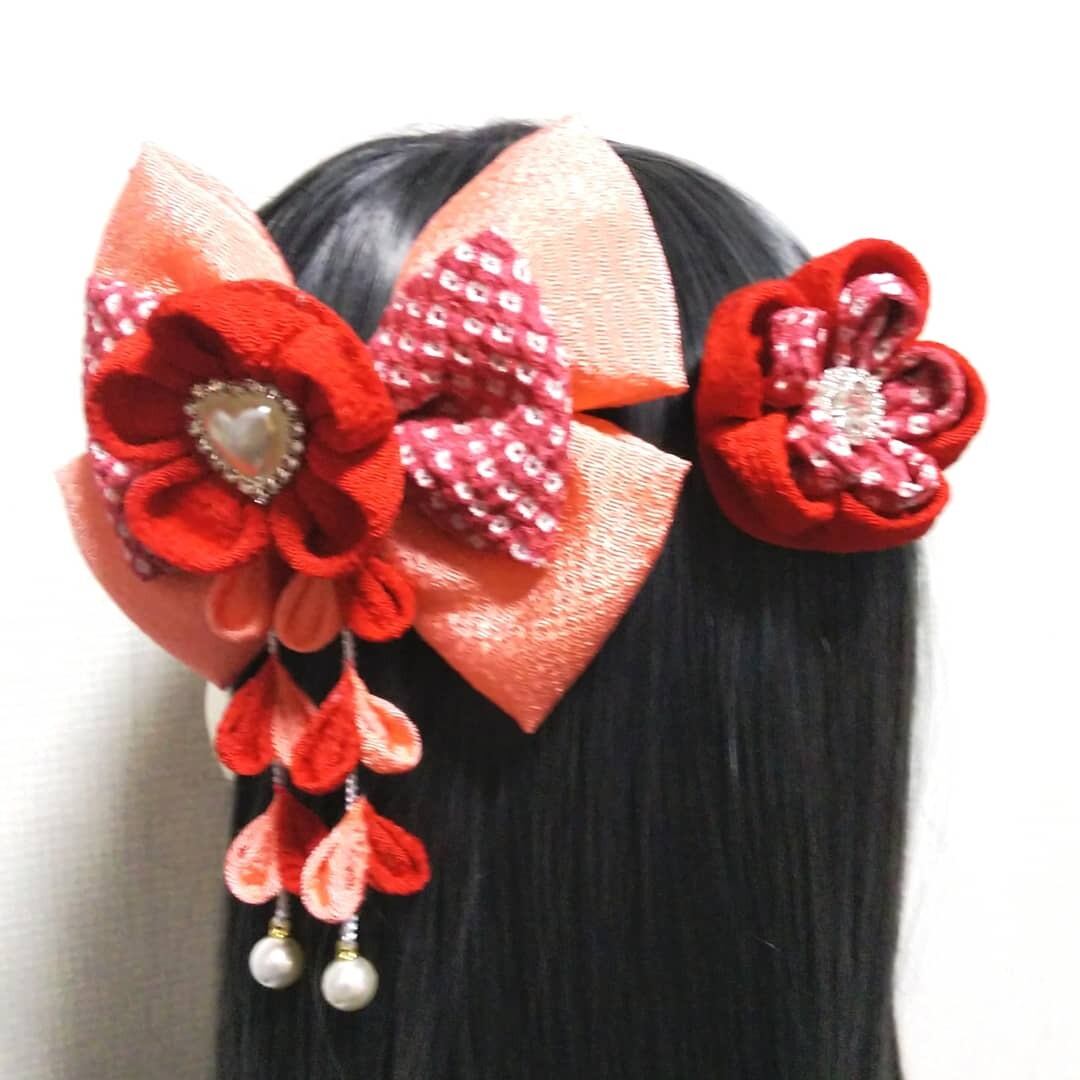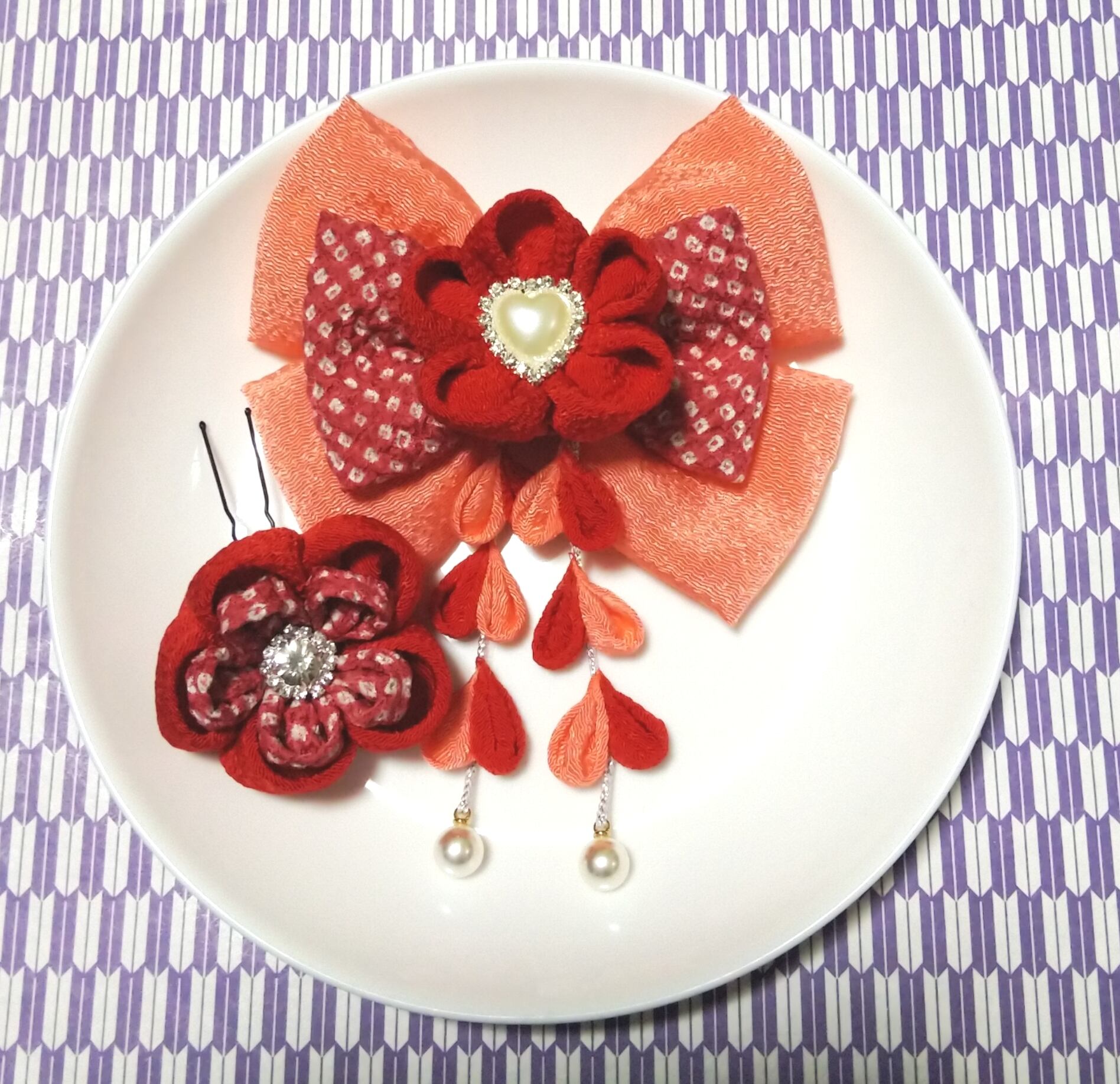 髪飾り 髪飾りサーモンピンク リボンサーモンピンク 成人式髪飾り 卒業式髪飾り 七五三髪飾り つまみ細工髪飾り