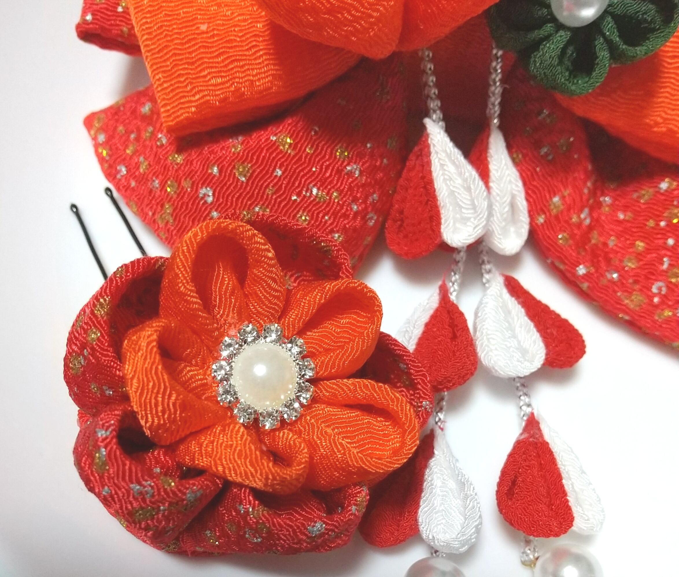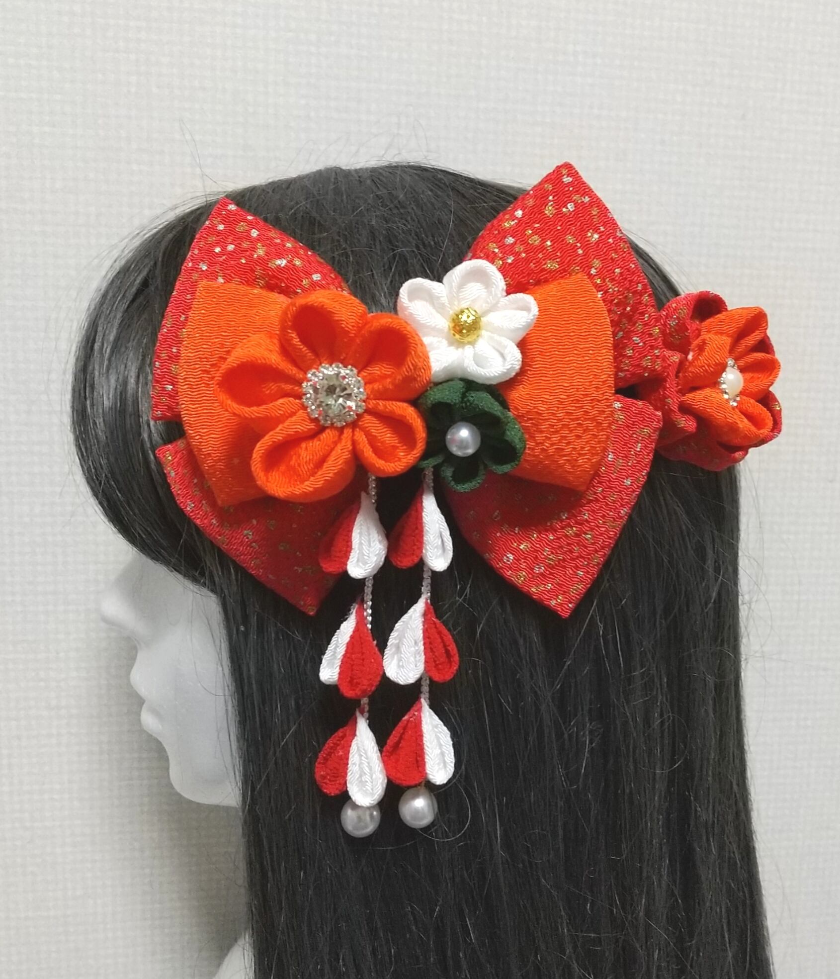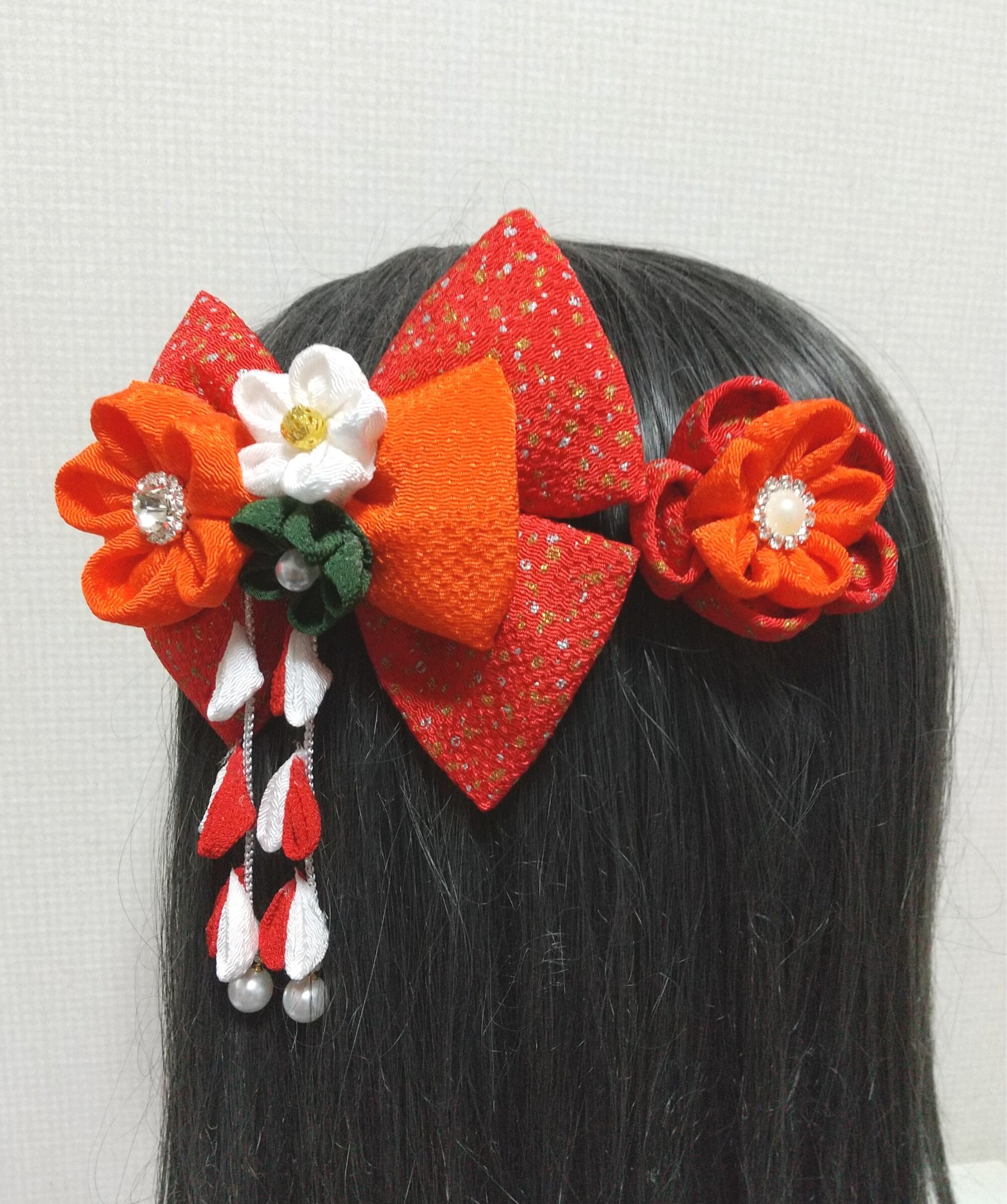 髪飾り 髪飾り赤 髪飾りオレンジ リボン 成人式 卒業式 七五三 つまみ細工