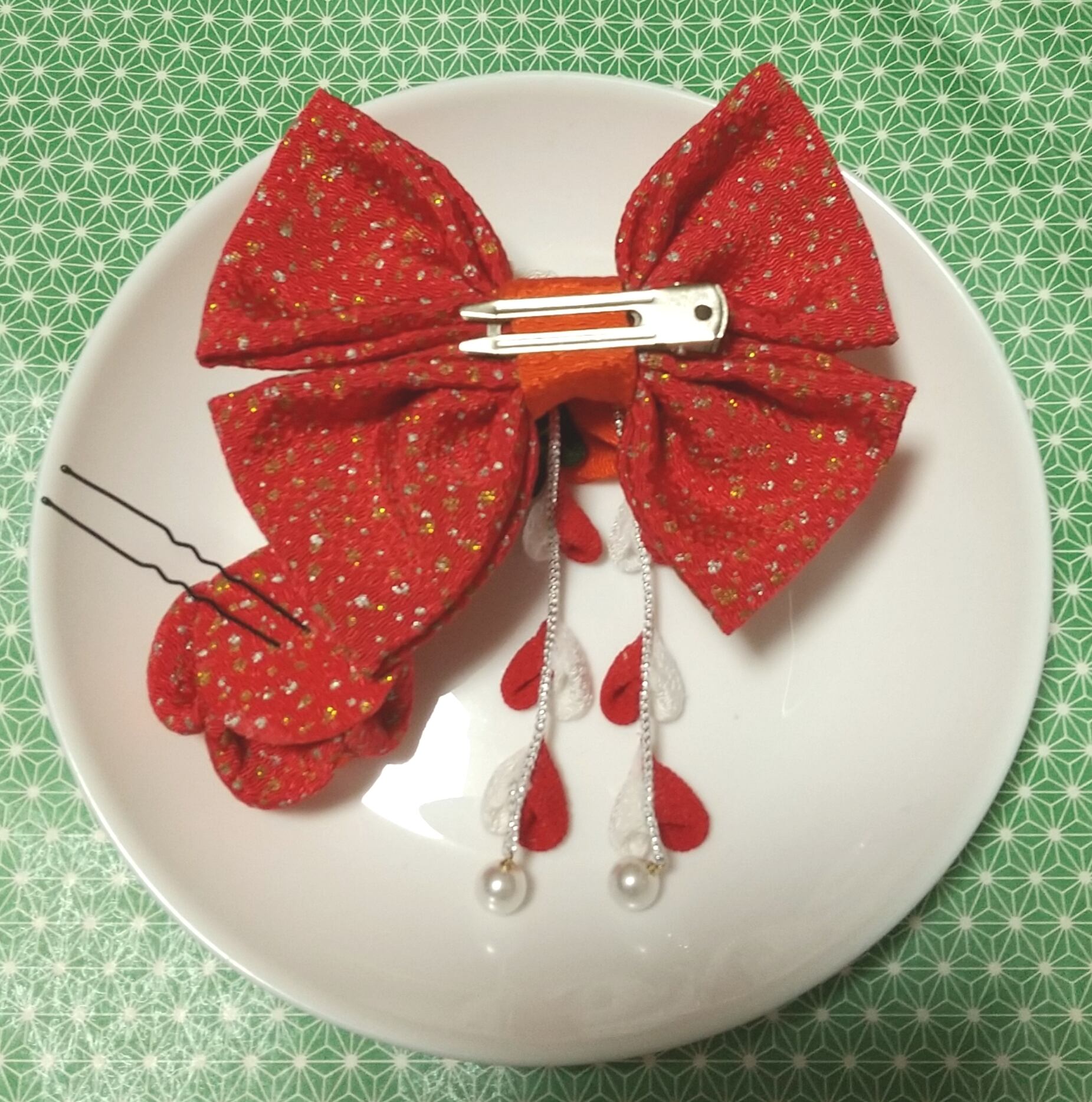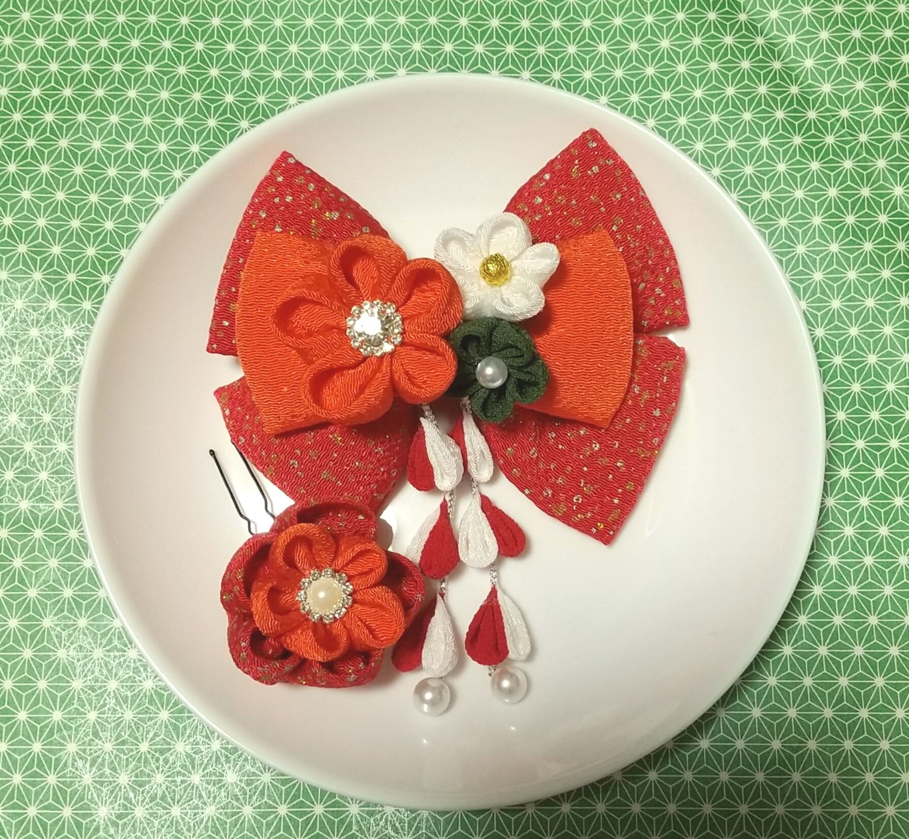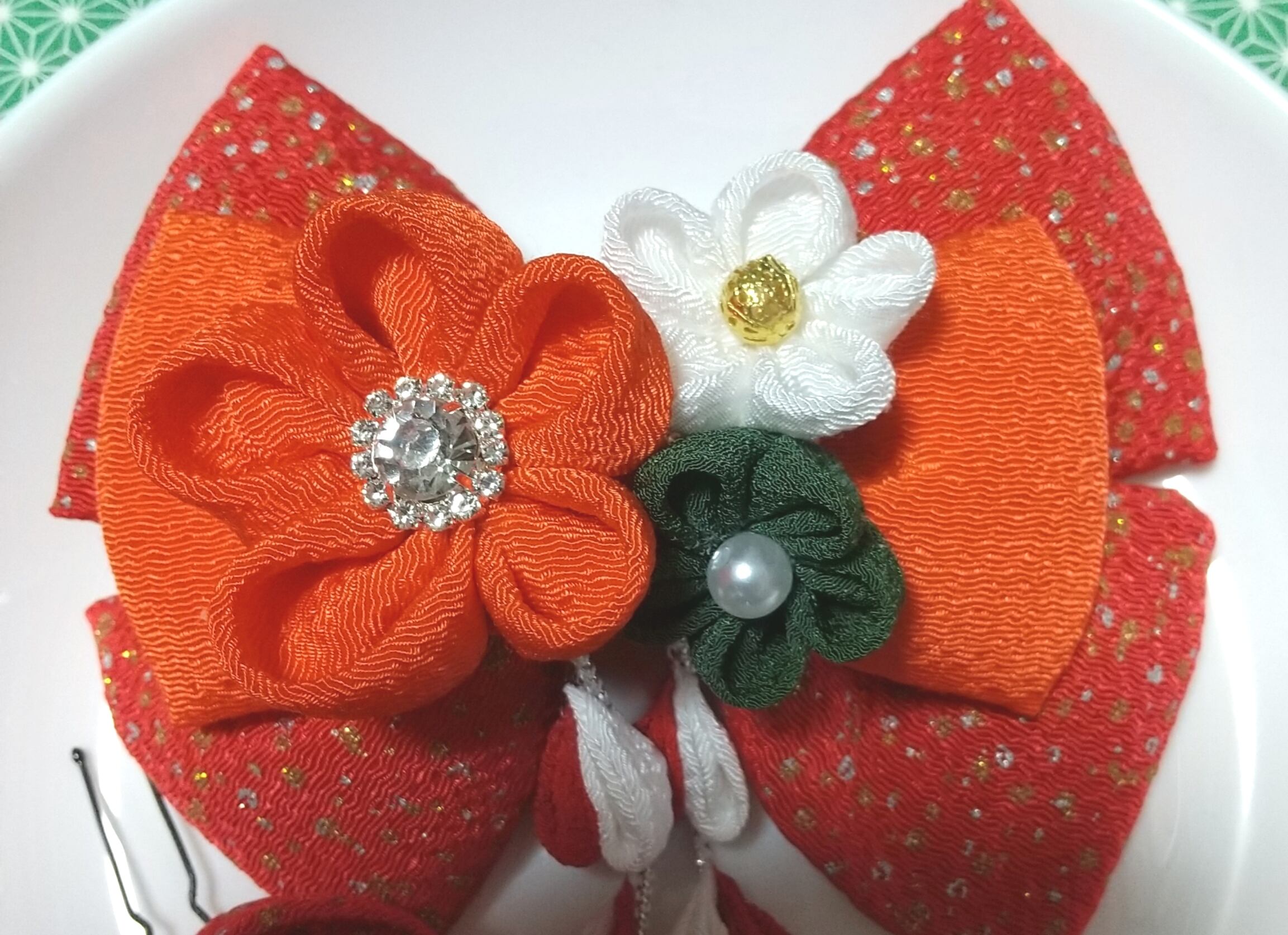 髪飾り 髪飾り赤 髪飾りオレンジ リボン 成人式 卒業式 七五三 つまみ細工