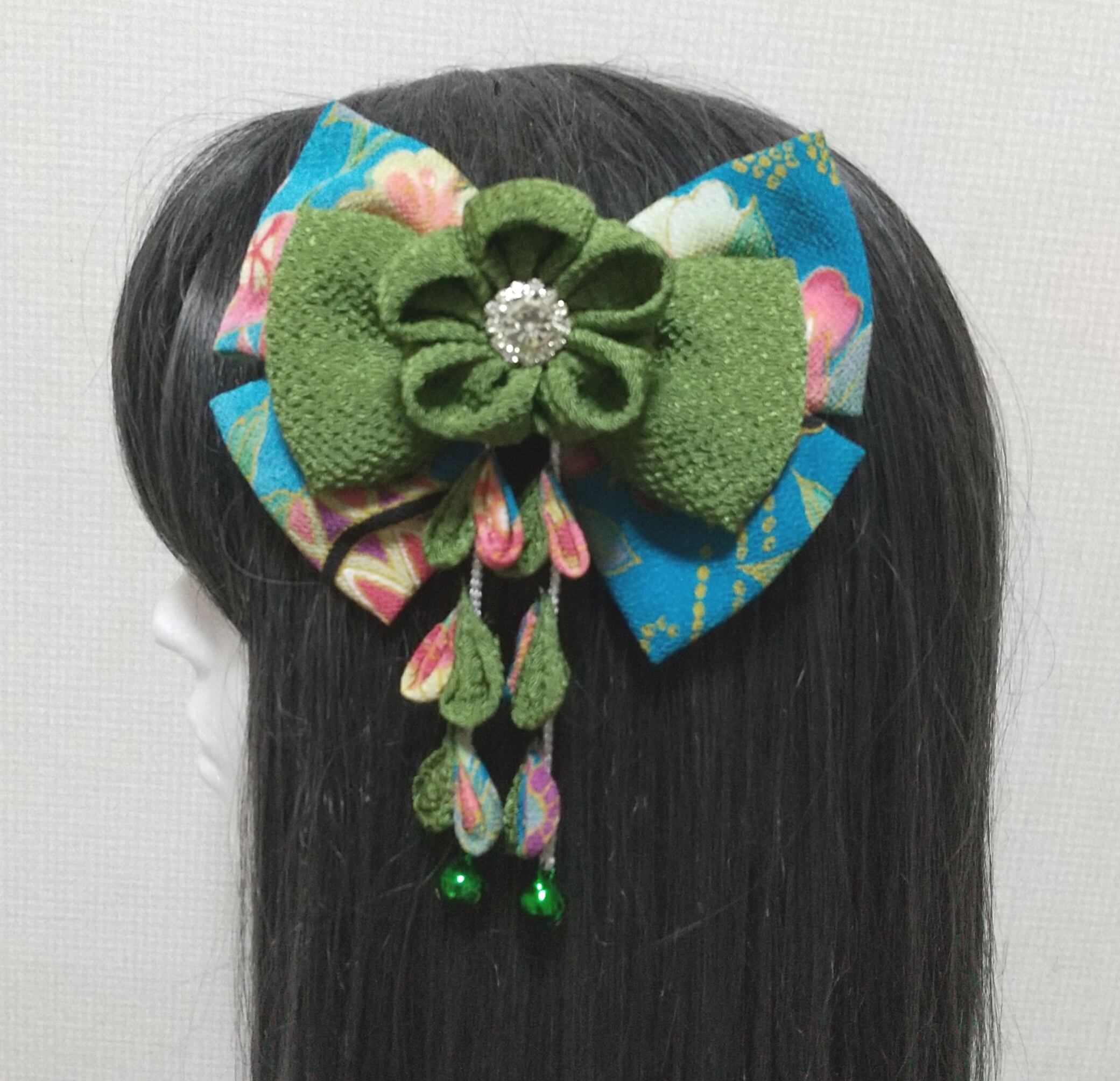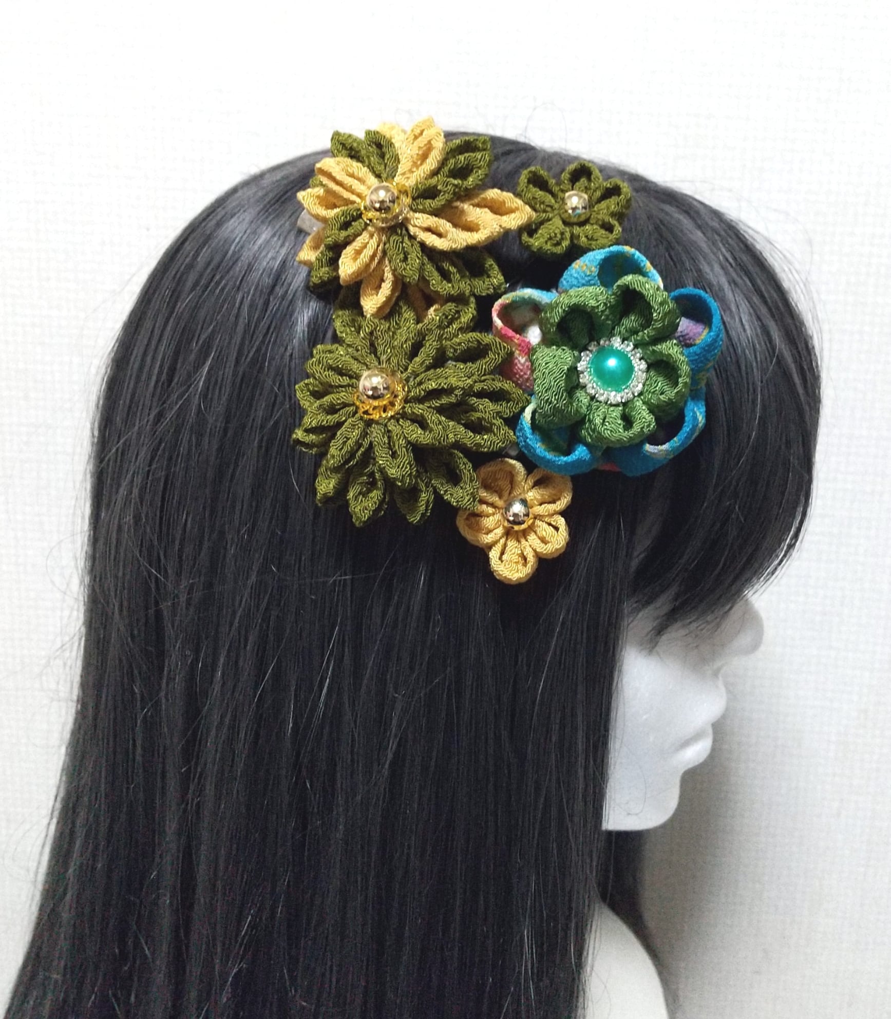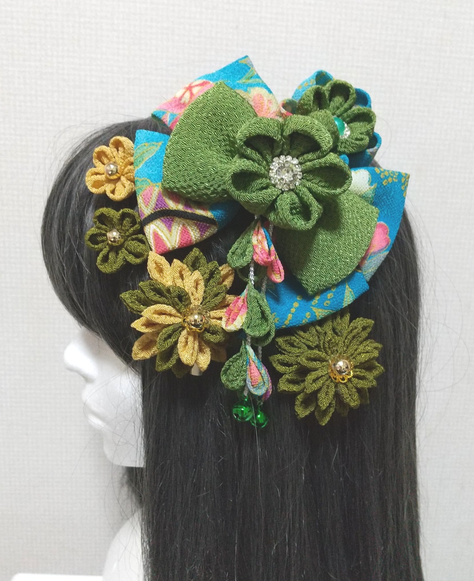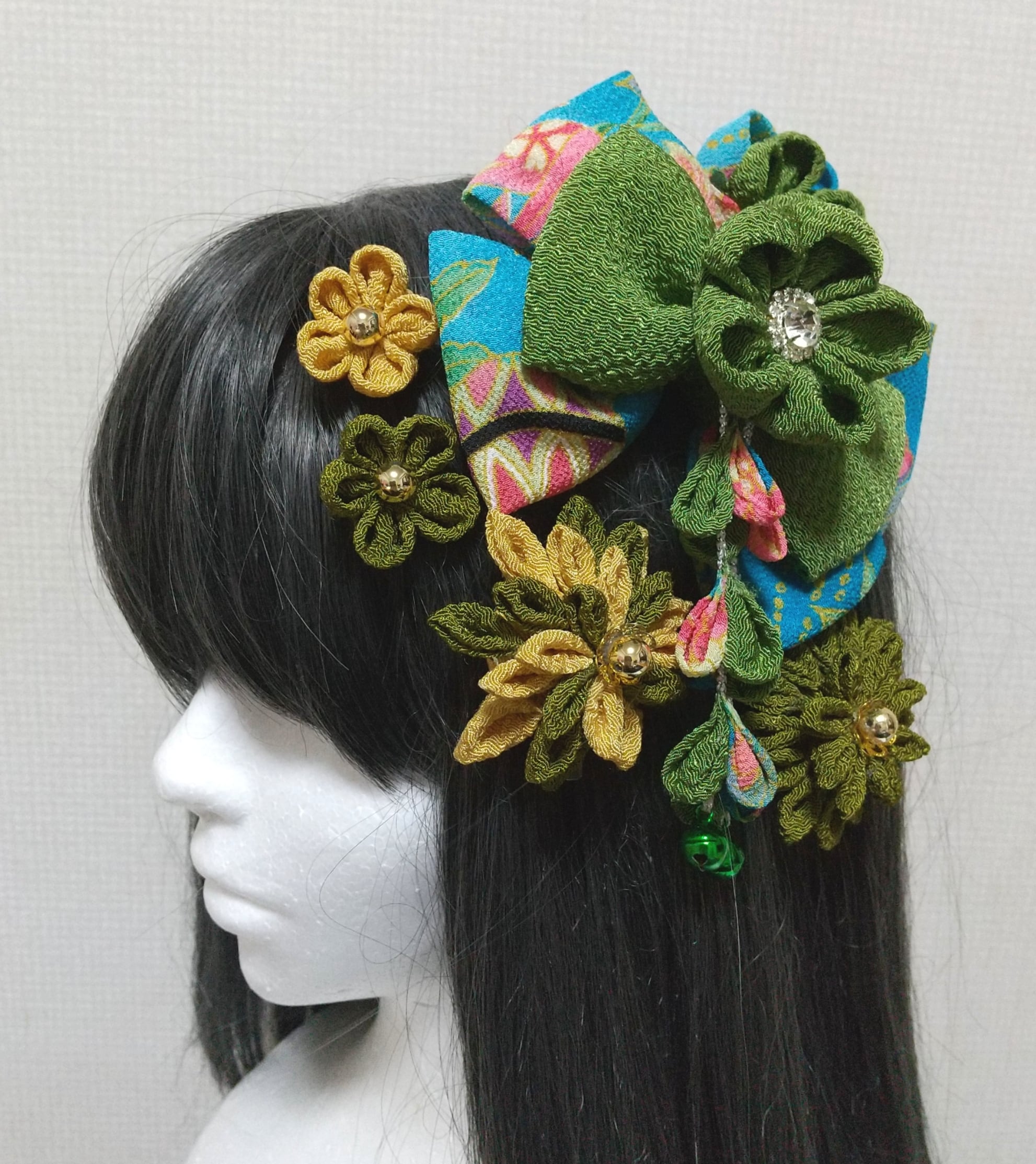 髪飾り 髪飾り緑 髪飾り辛子色 リボン 成人式 卒業式 七五三 つまみ細工