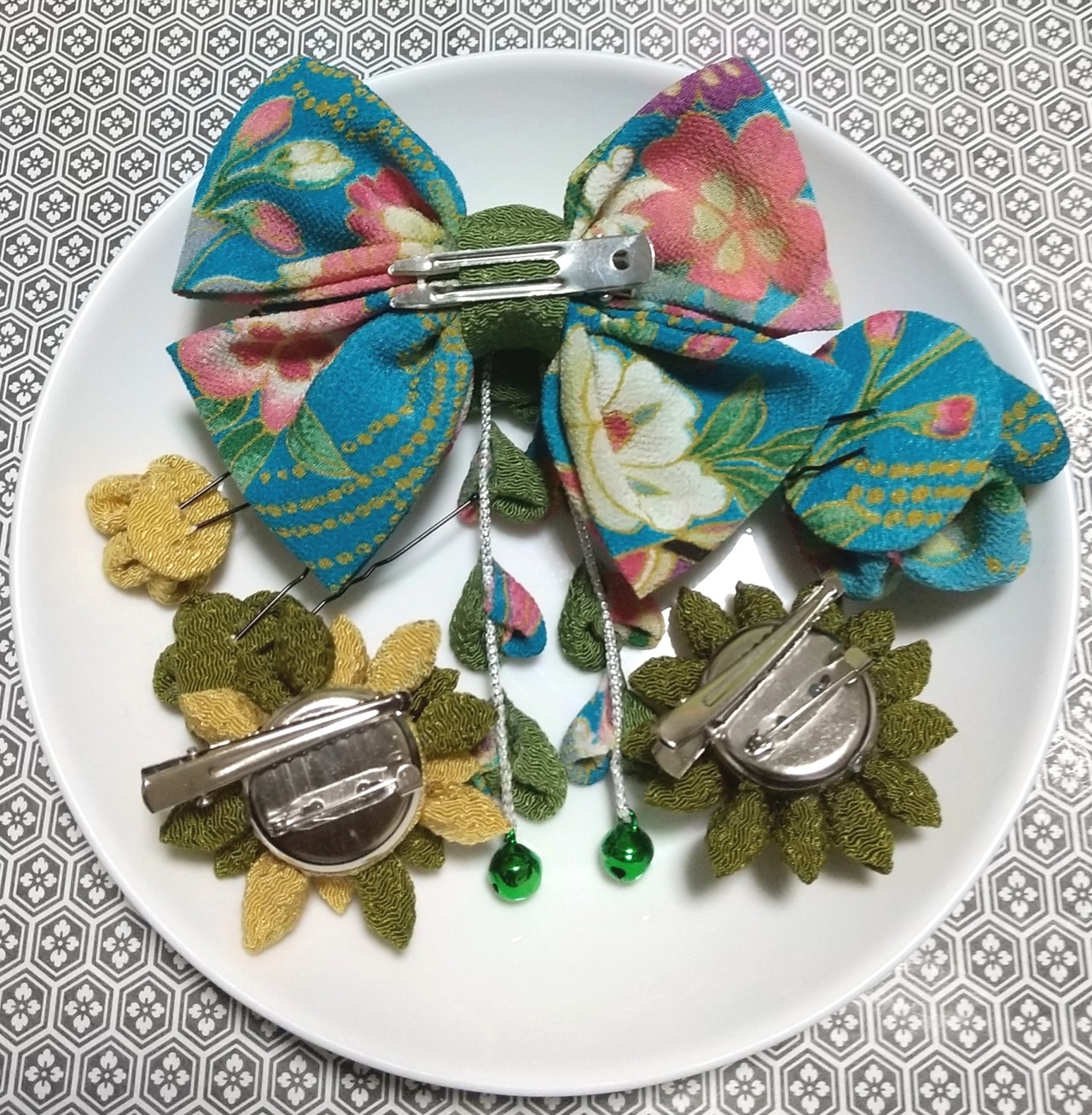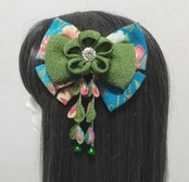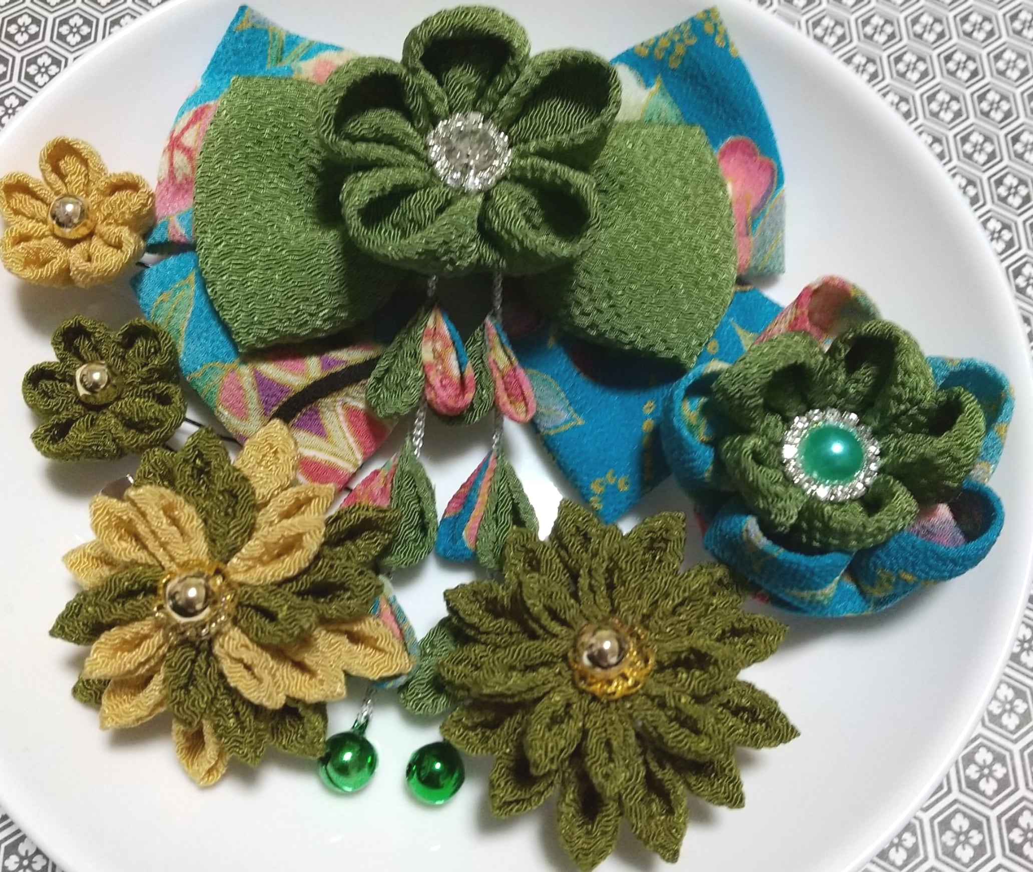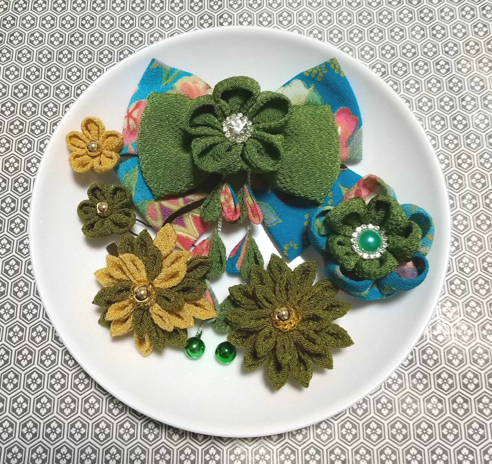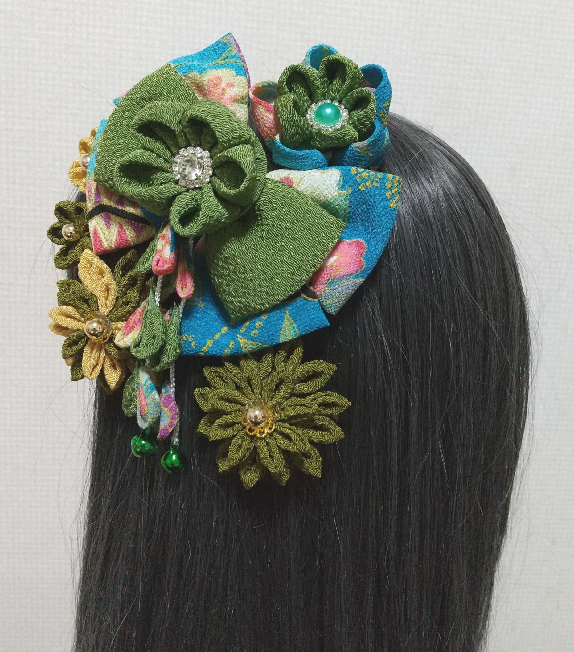 髪飾り 髪飾り緑 髪飾り辛子色 リボン 成人式 卒業式 七五三 つまみ細工