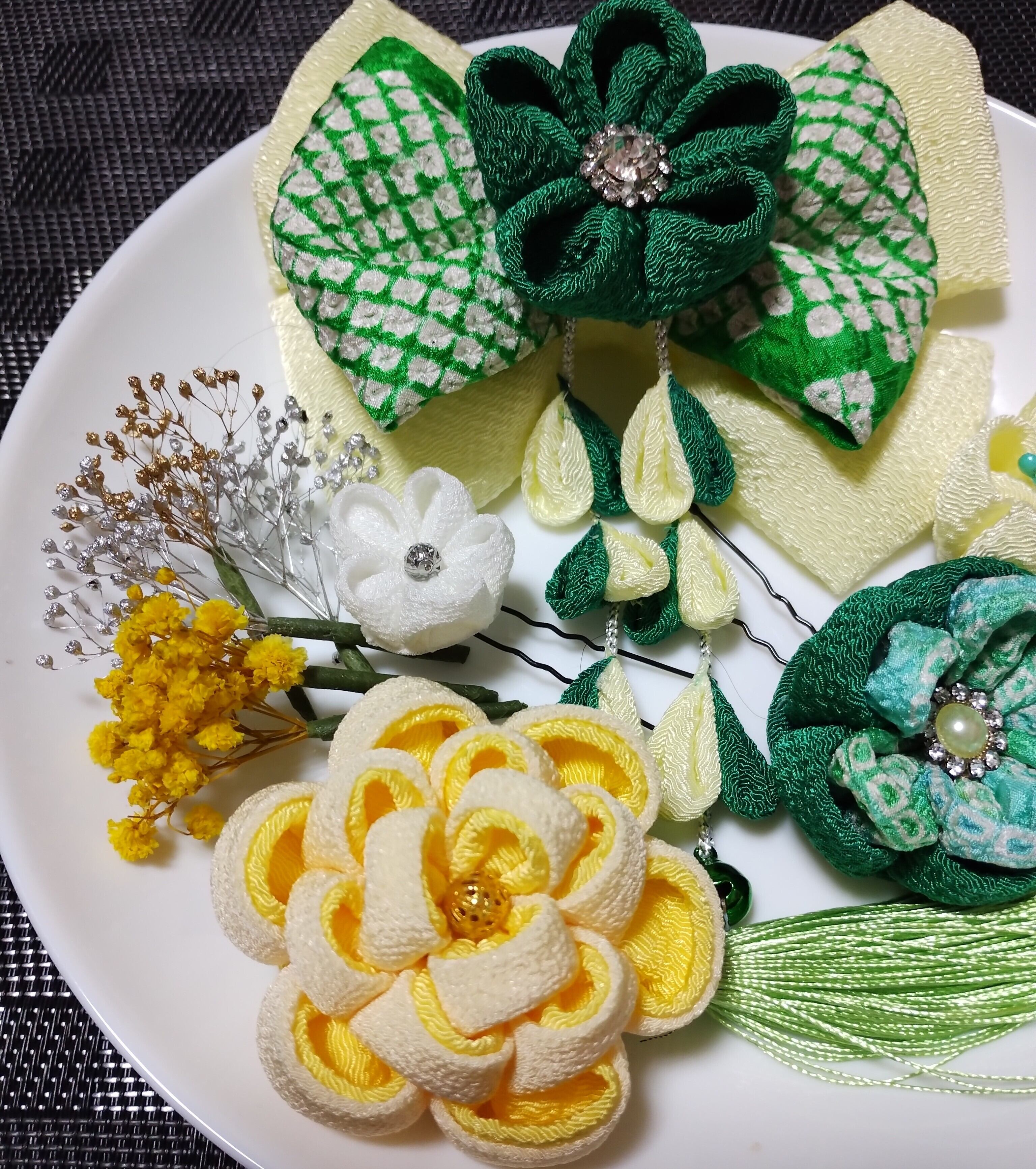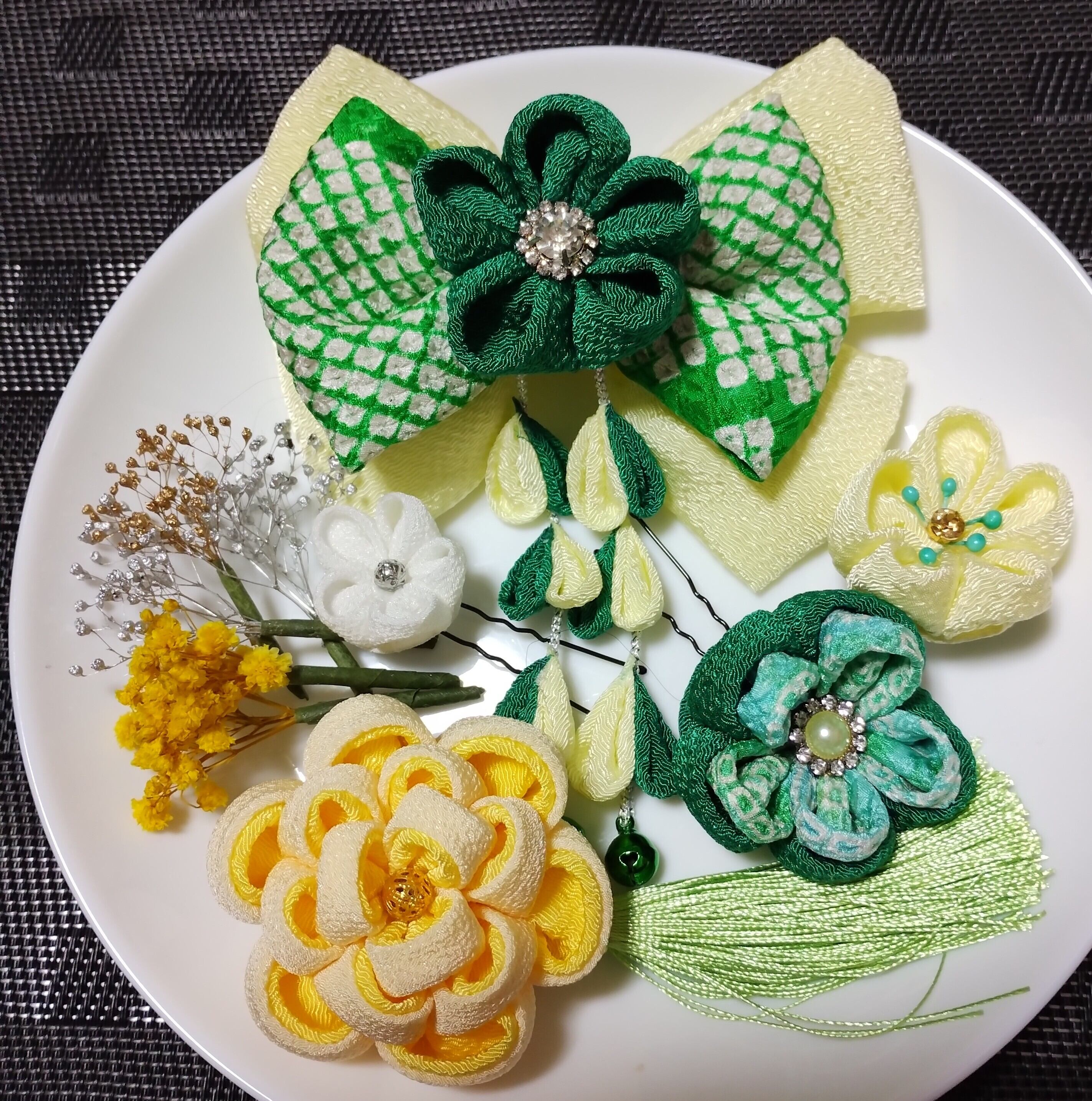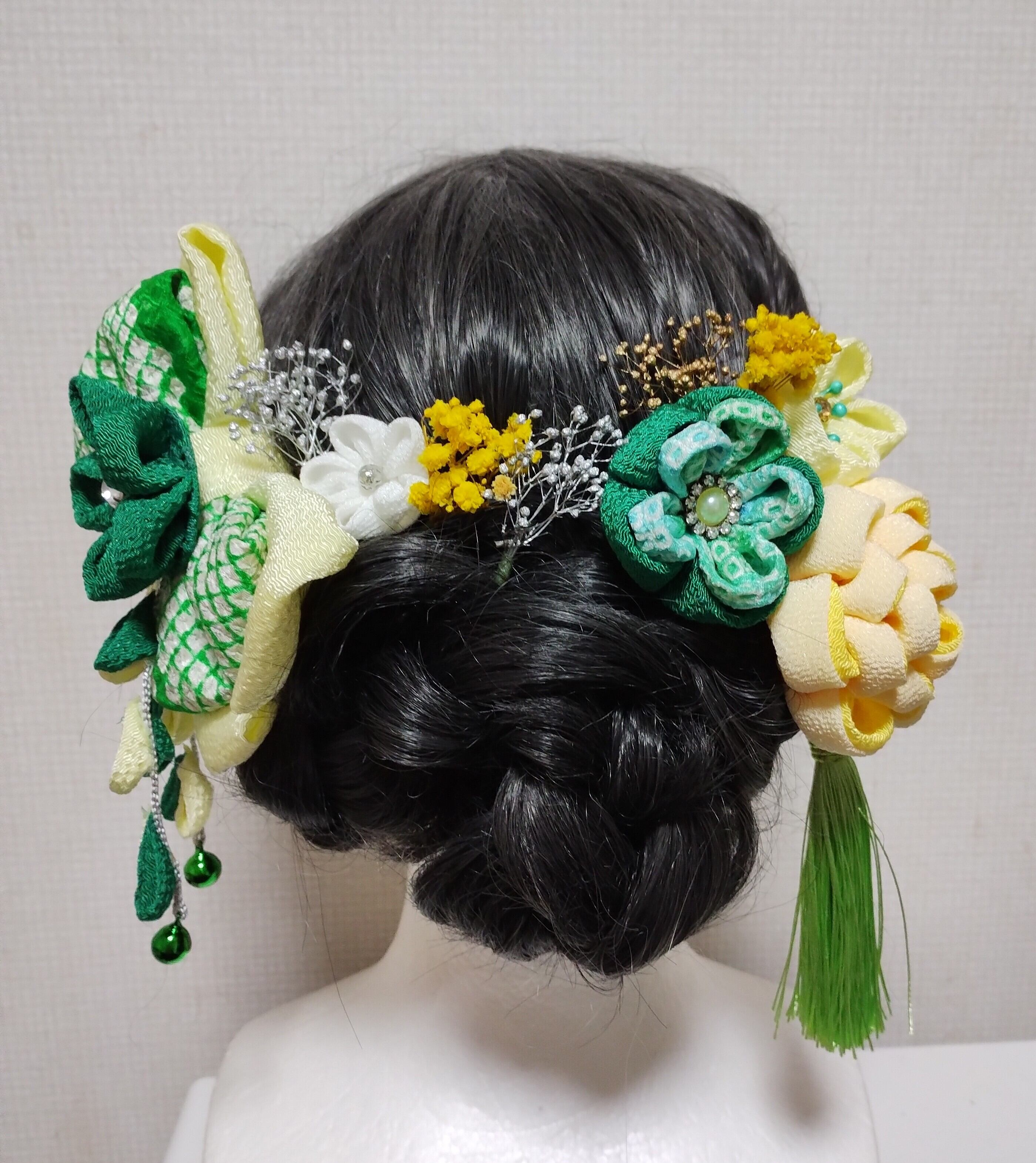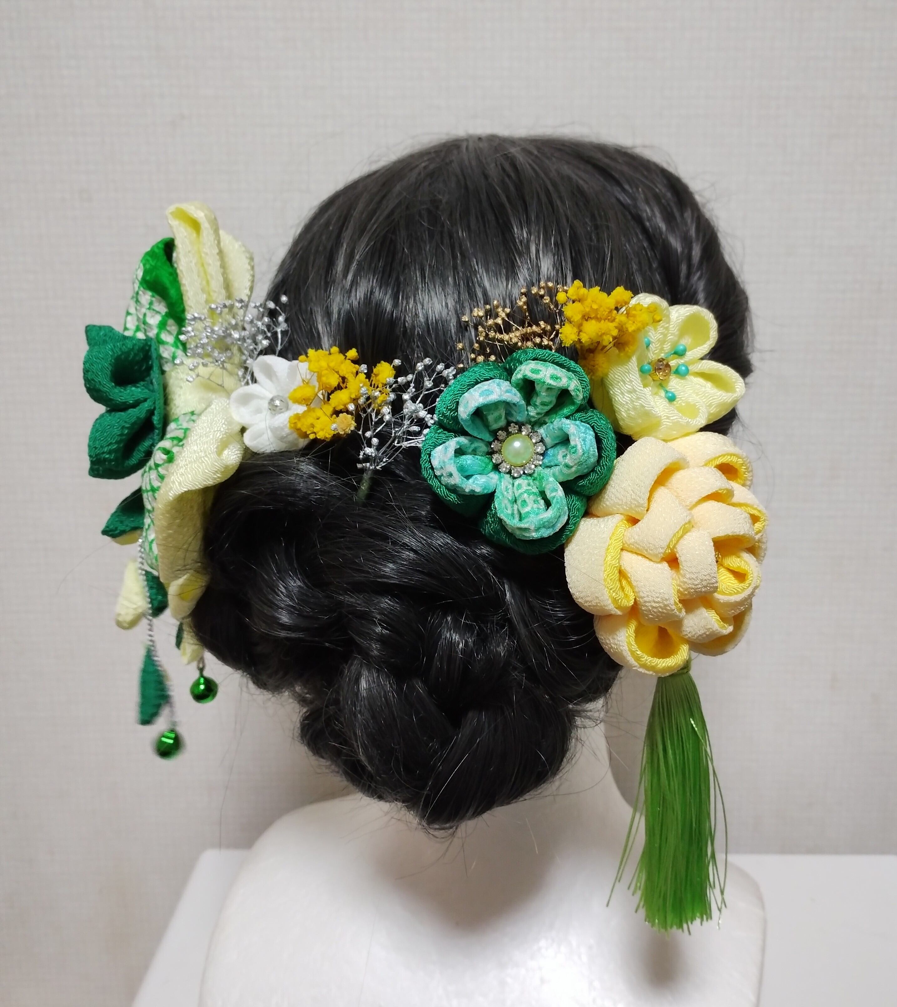 髪飾り 髪飾りイエロー 髪飾りグリーン 成人式 髪飾り 卒業式髪飾り 七五三髪飾り リボン