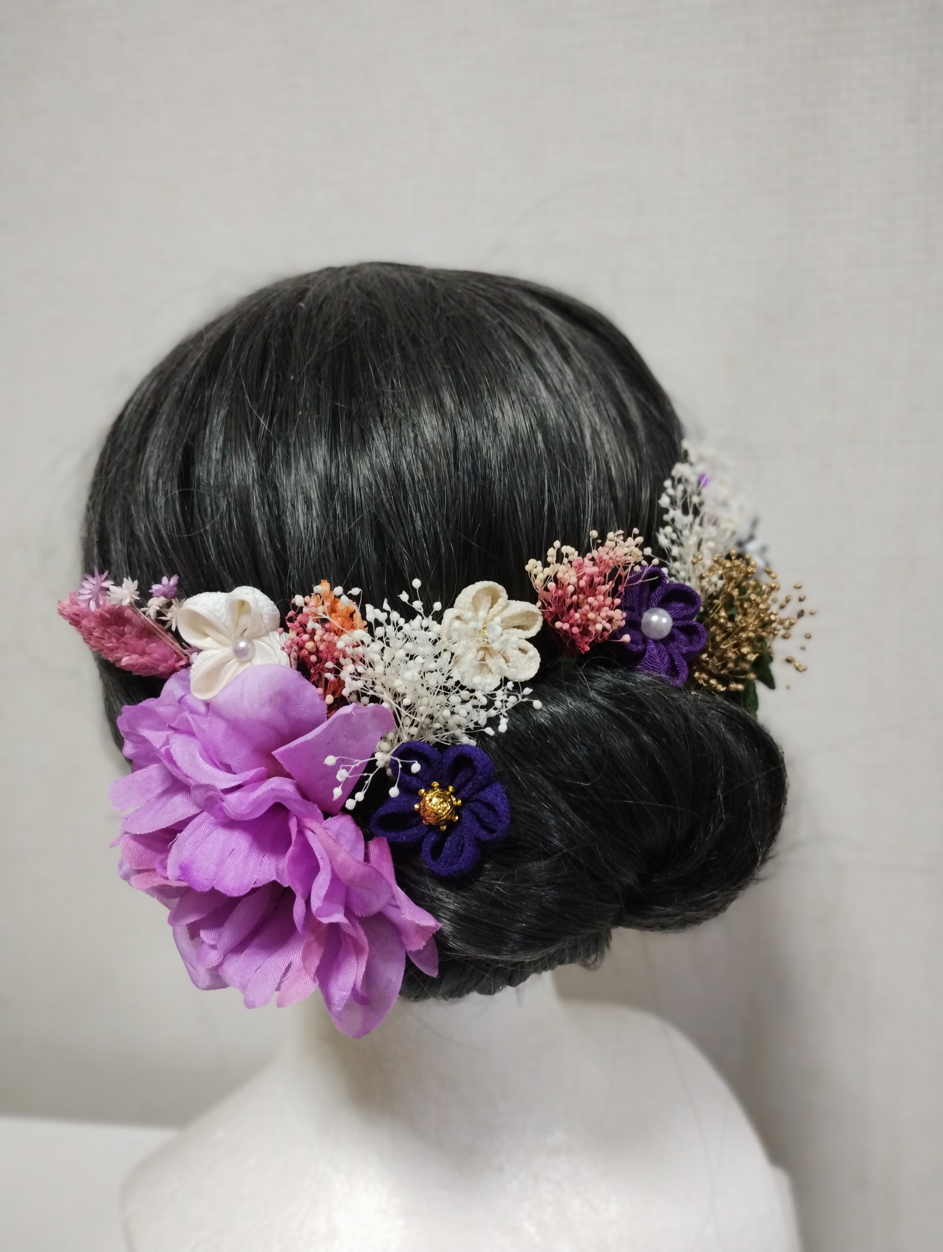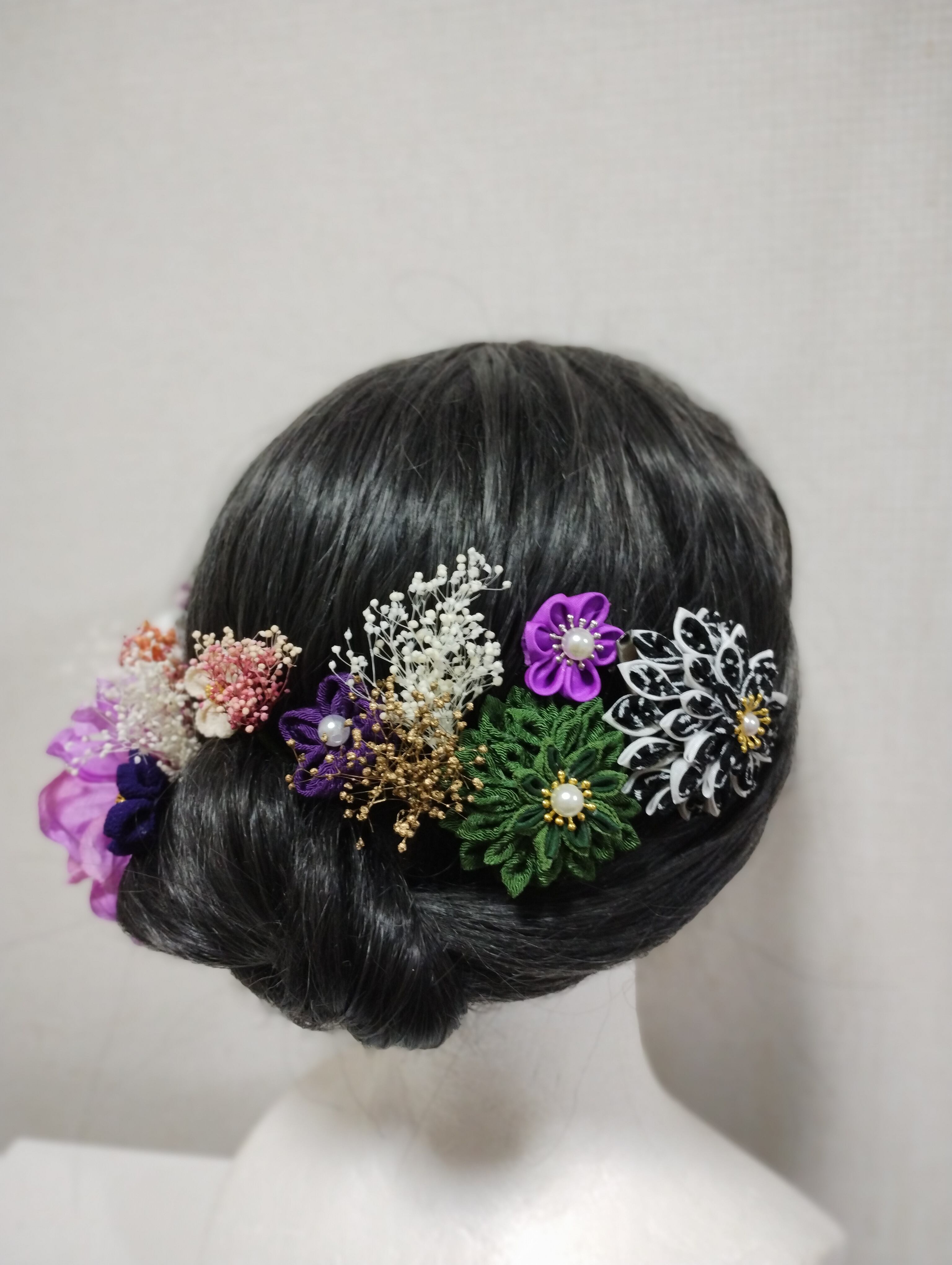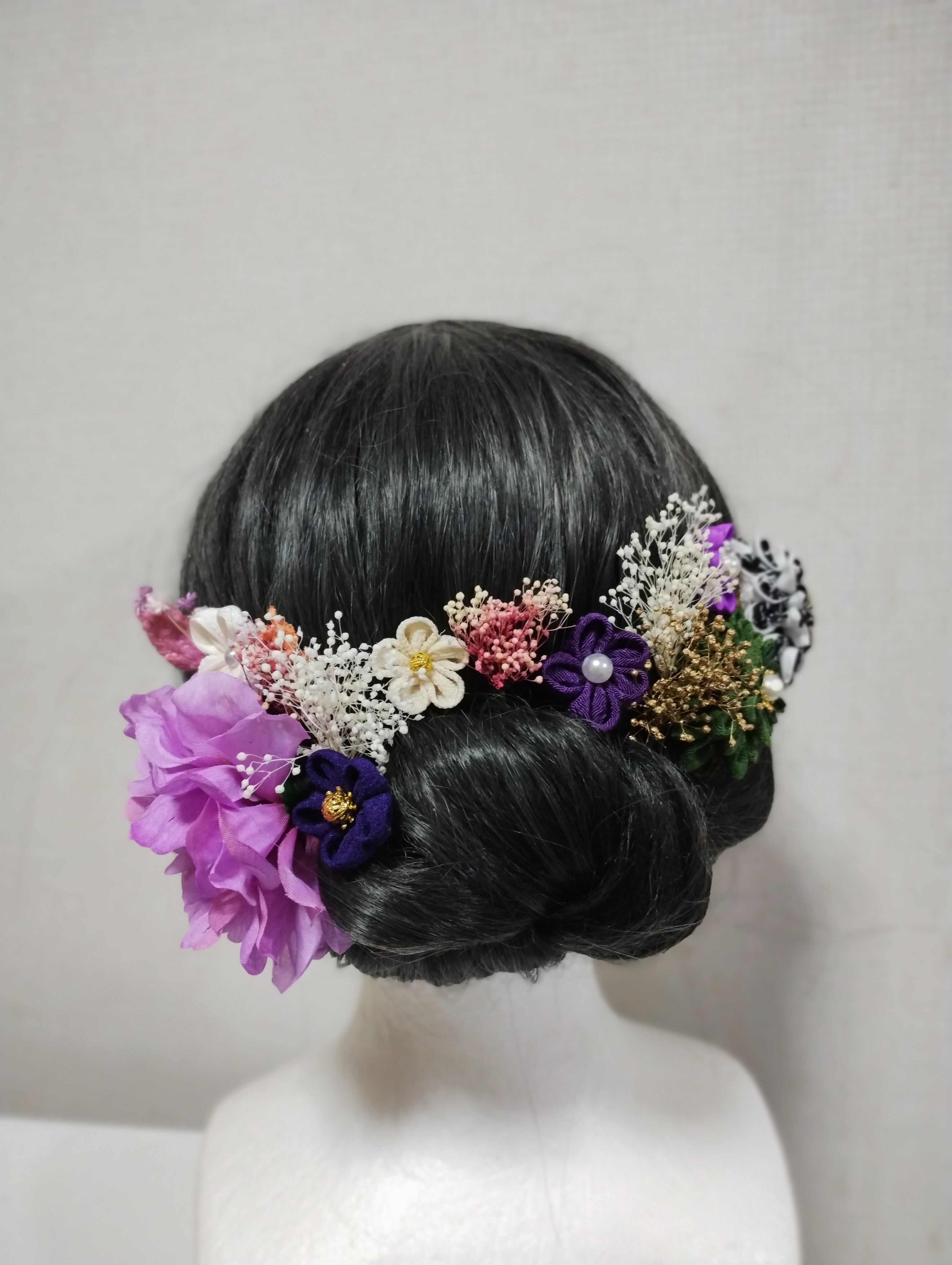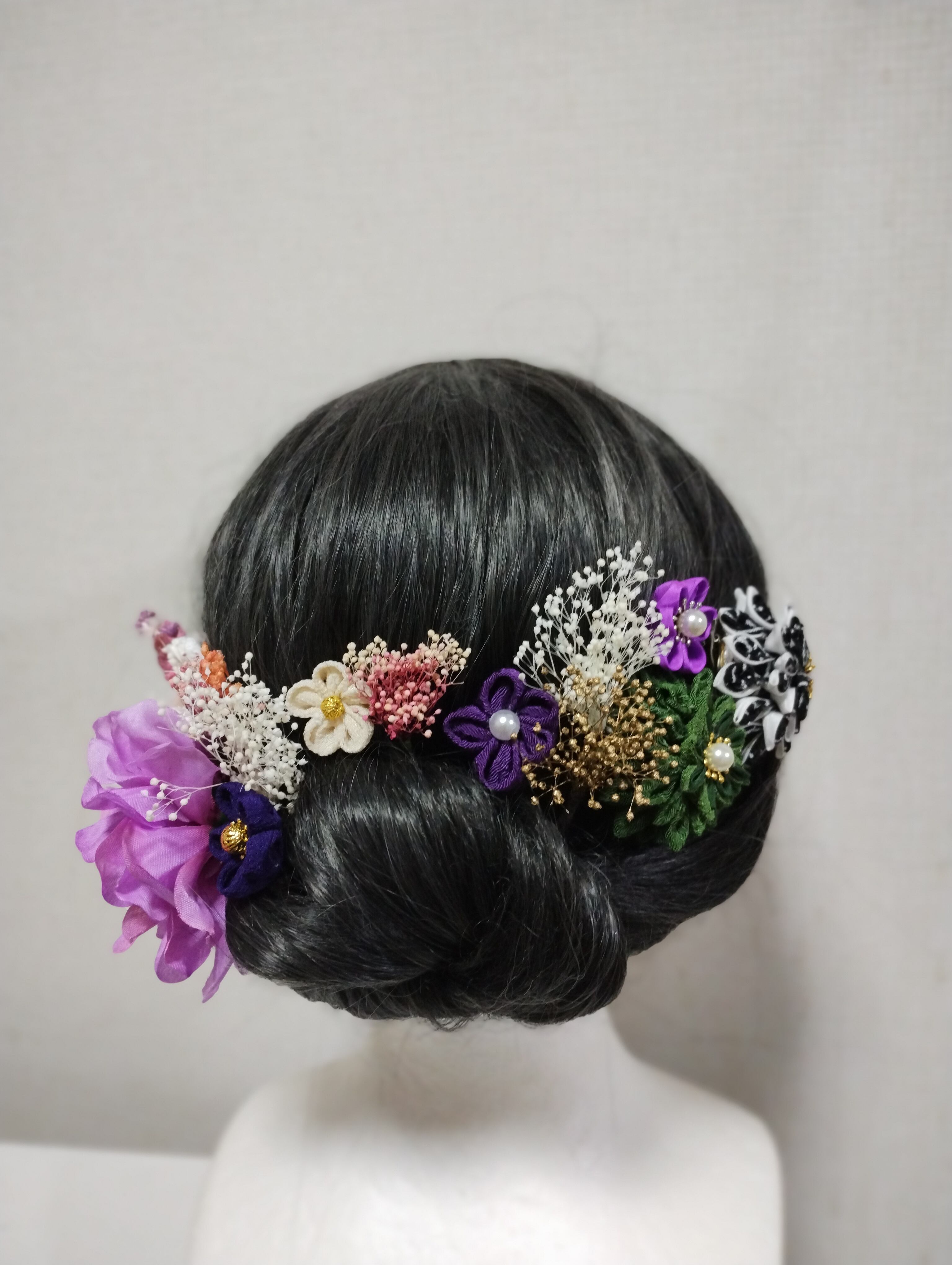 華やかなヘアアクセサリーで、特別な日を美しく演出しましょう。成人式、卒業式、七五三などのイベントにぴったりの髪飾りです。手作りのつまみ細工で作られたパープルの花々と、ブリザードフラワーが上品で優雅な印象を与えます。