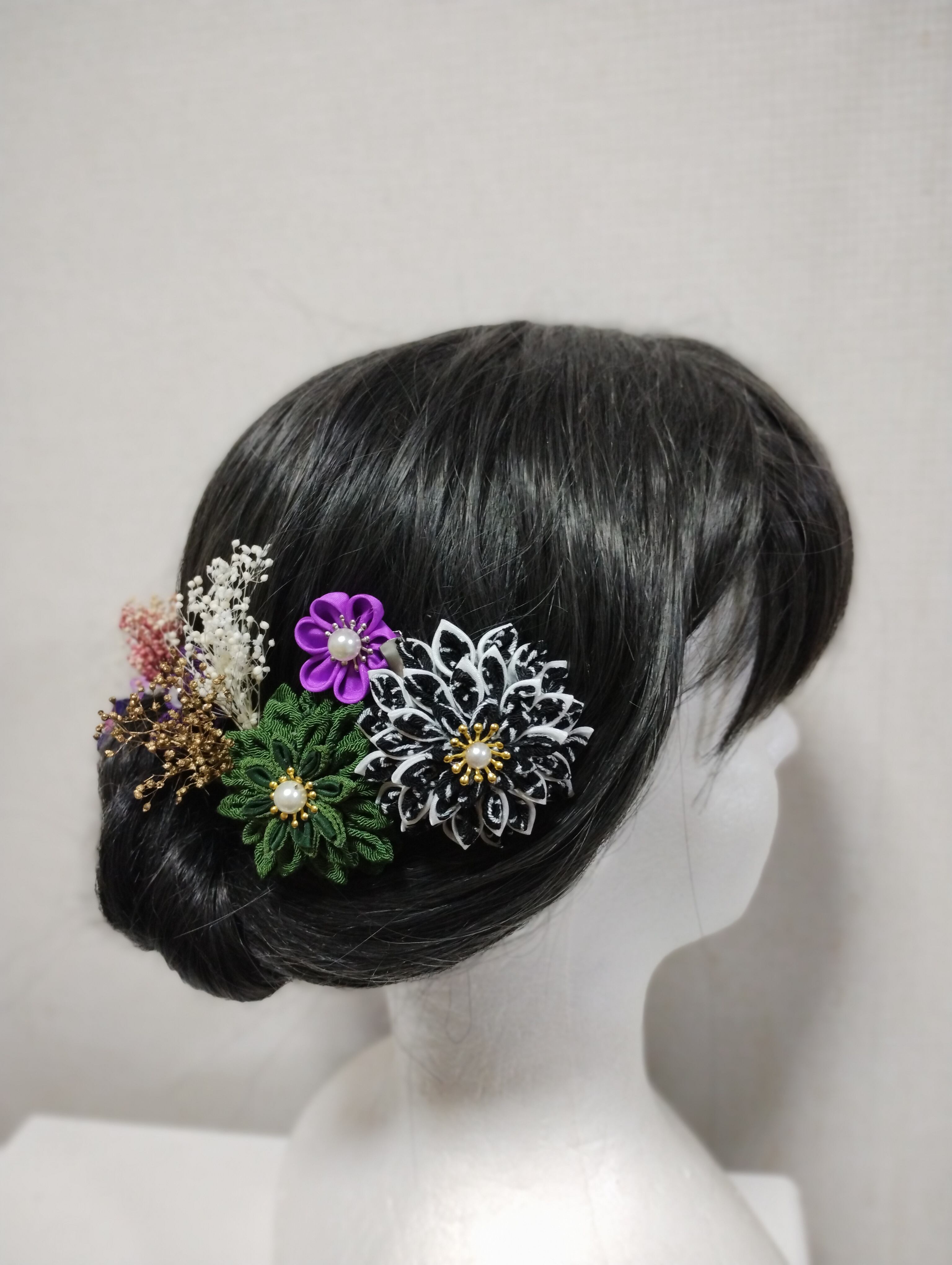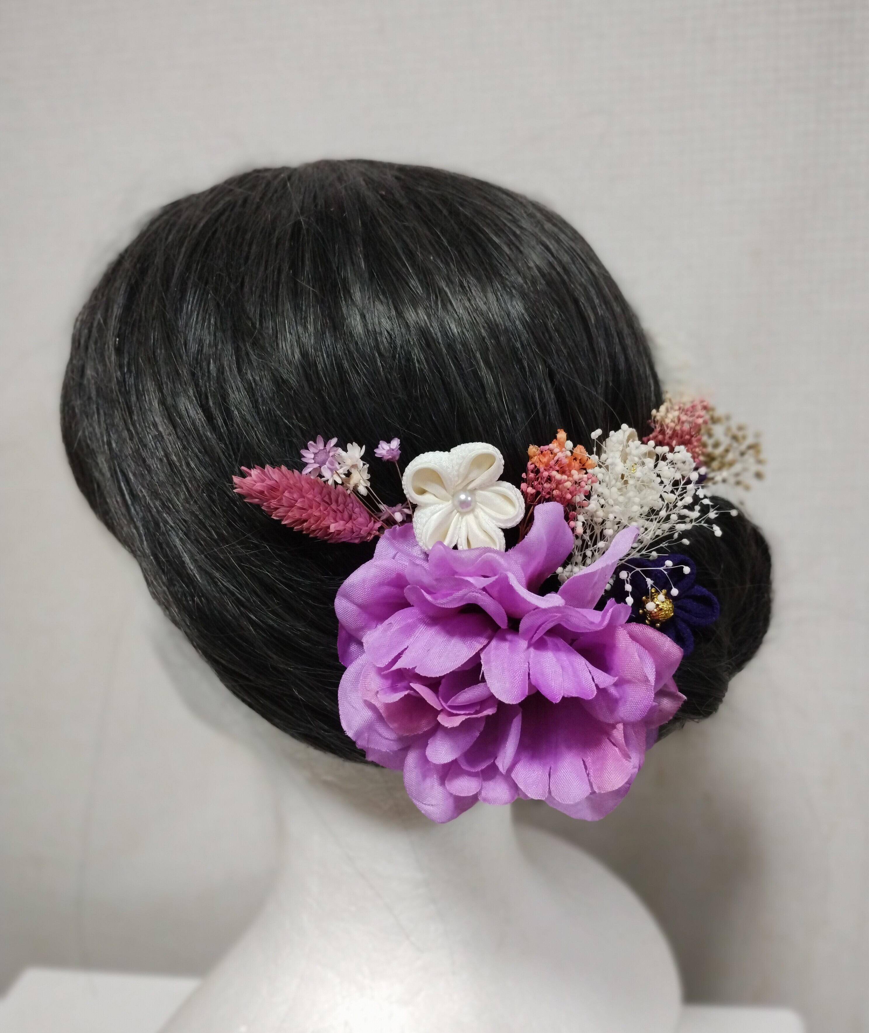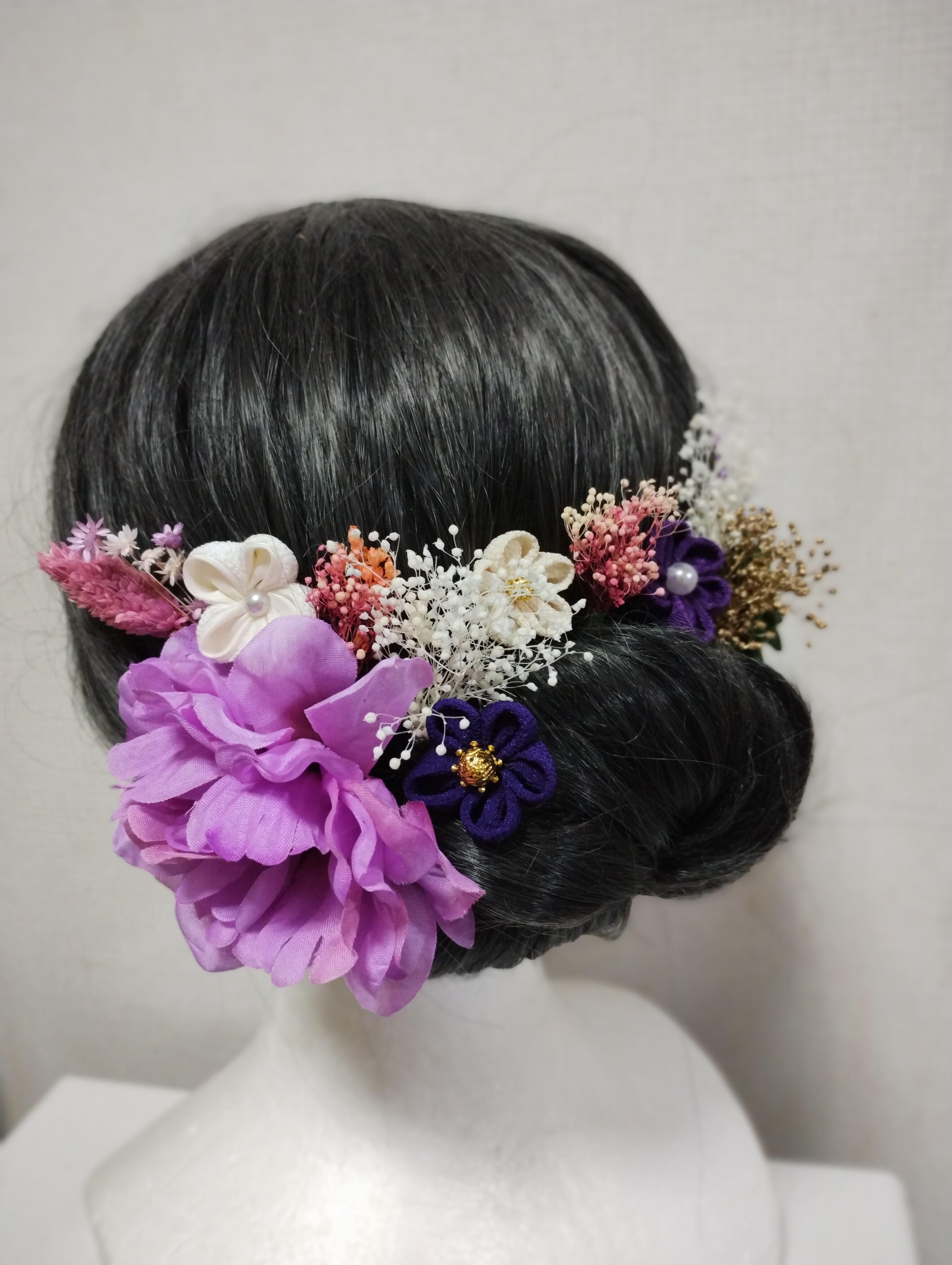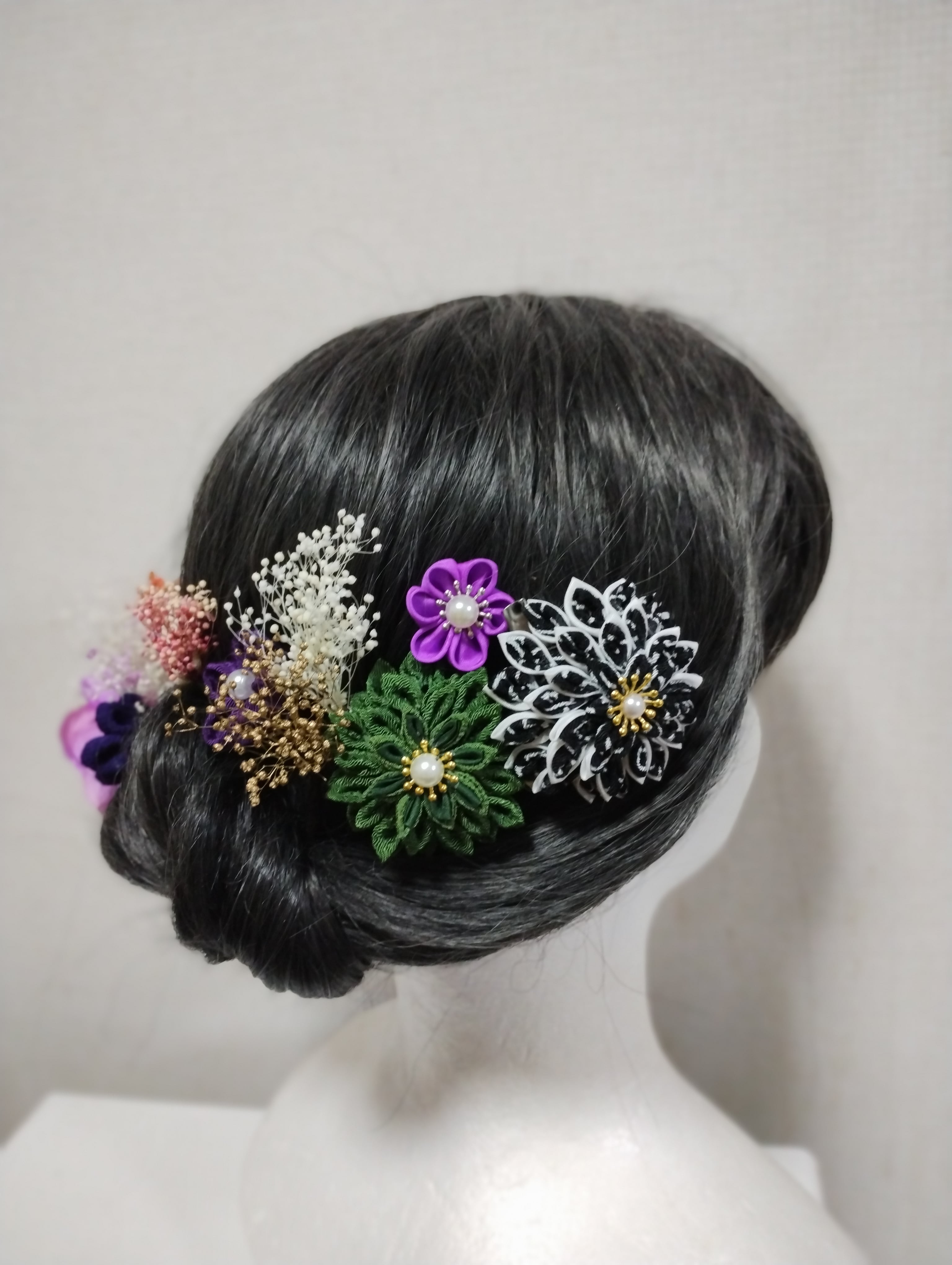 華やかなヘアアクセサリーで、特別な日を美しく演出しましょう。成人式、卒業式、七五三などのイベントにぴったりの髪飾りです。手作りのつまみ細工で作られたパープルの花々と、ブリザードフラワーが上品で優雅な印象を与えます。