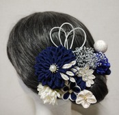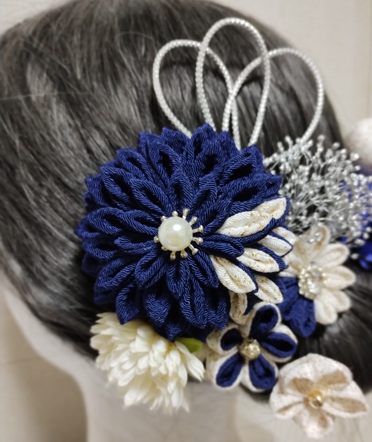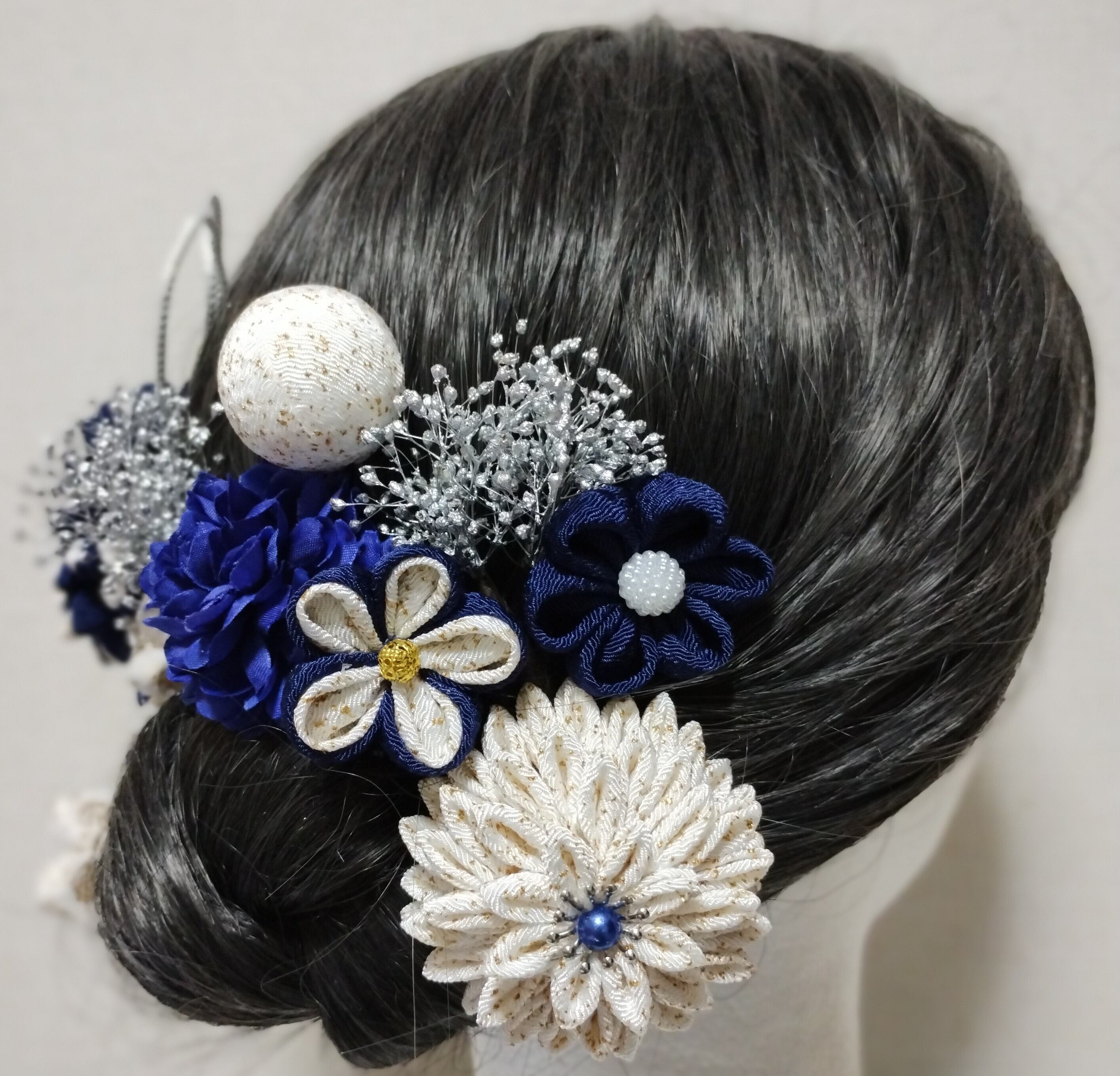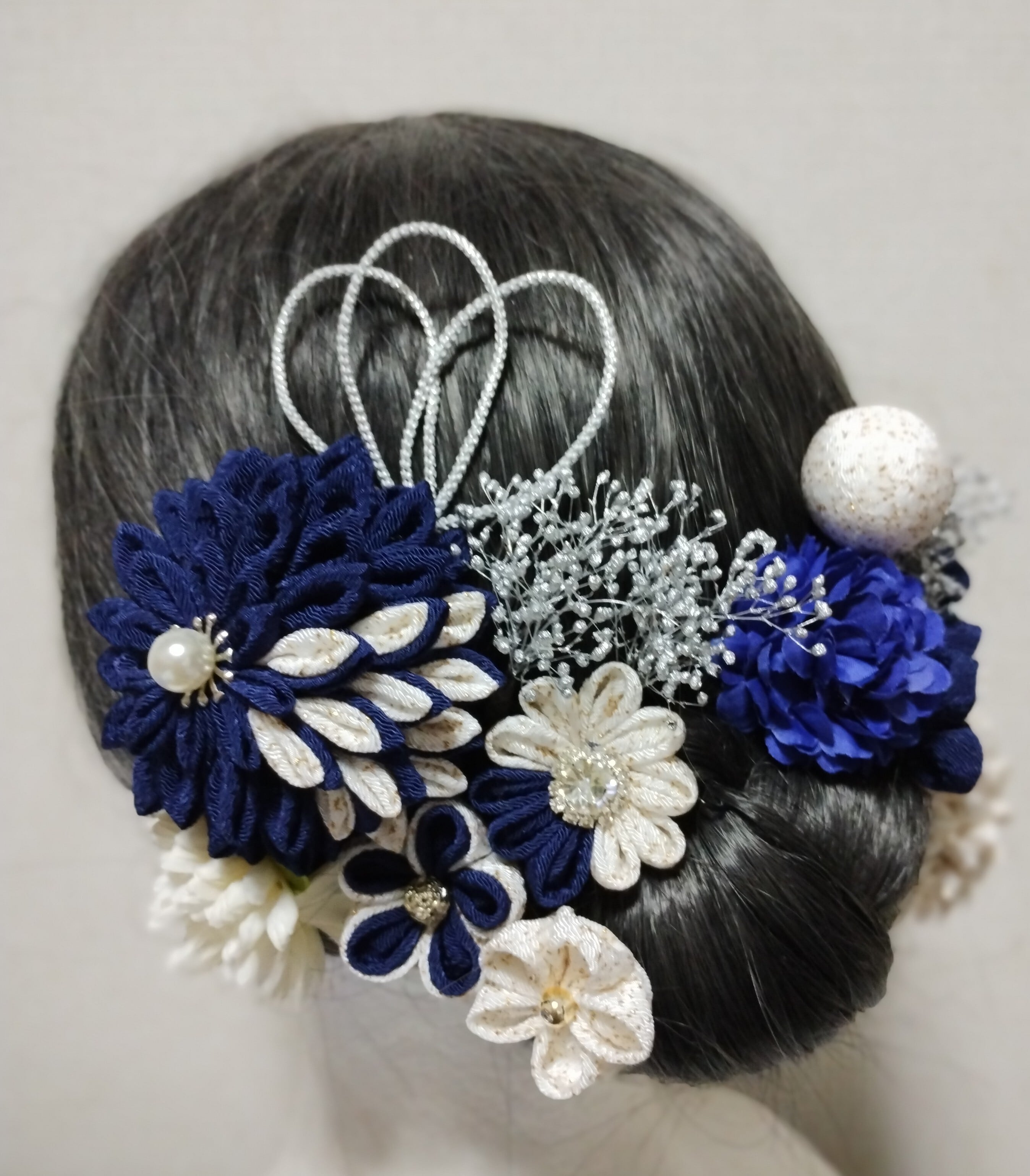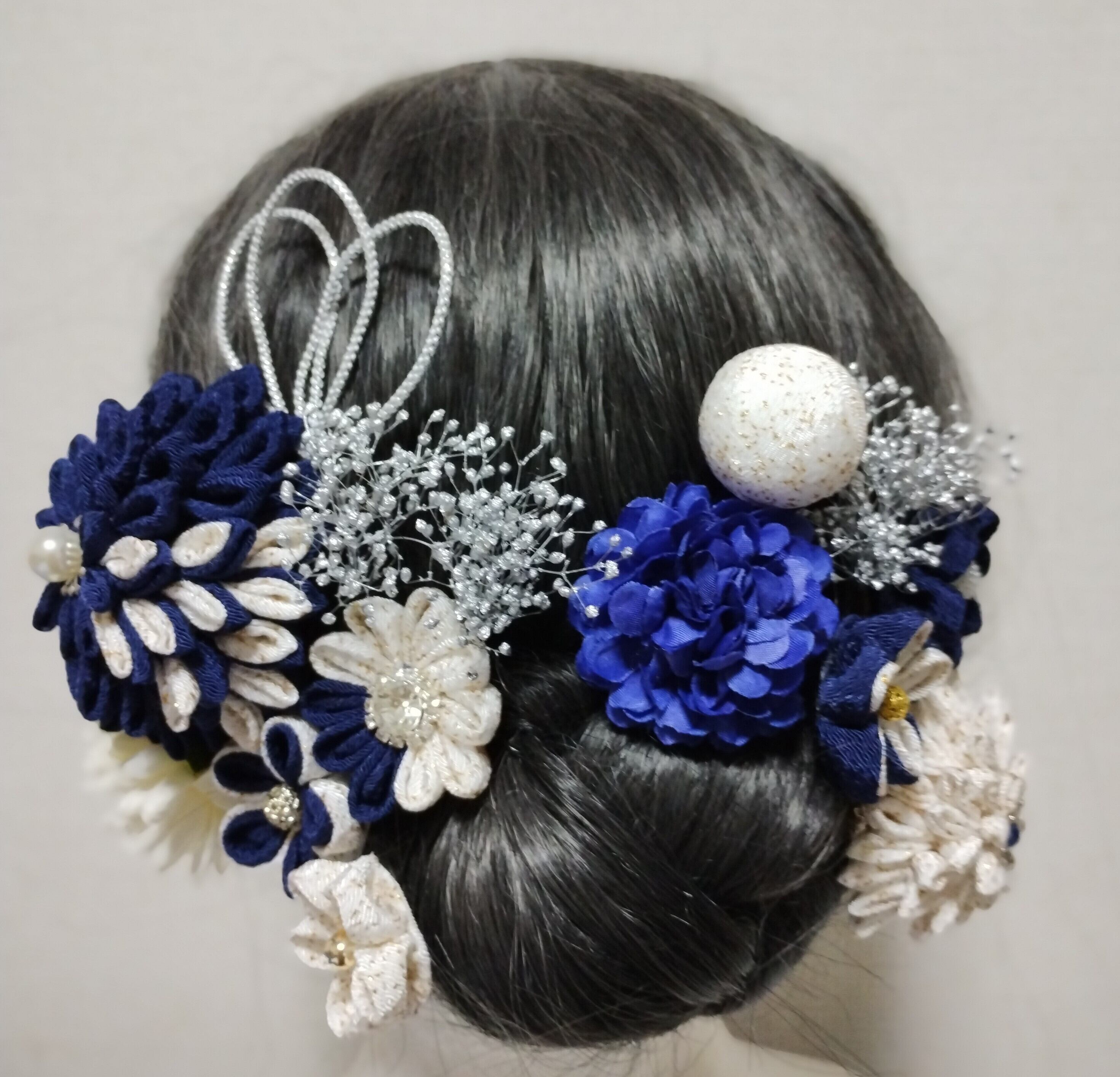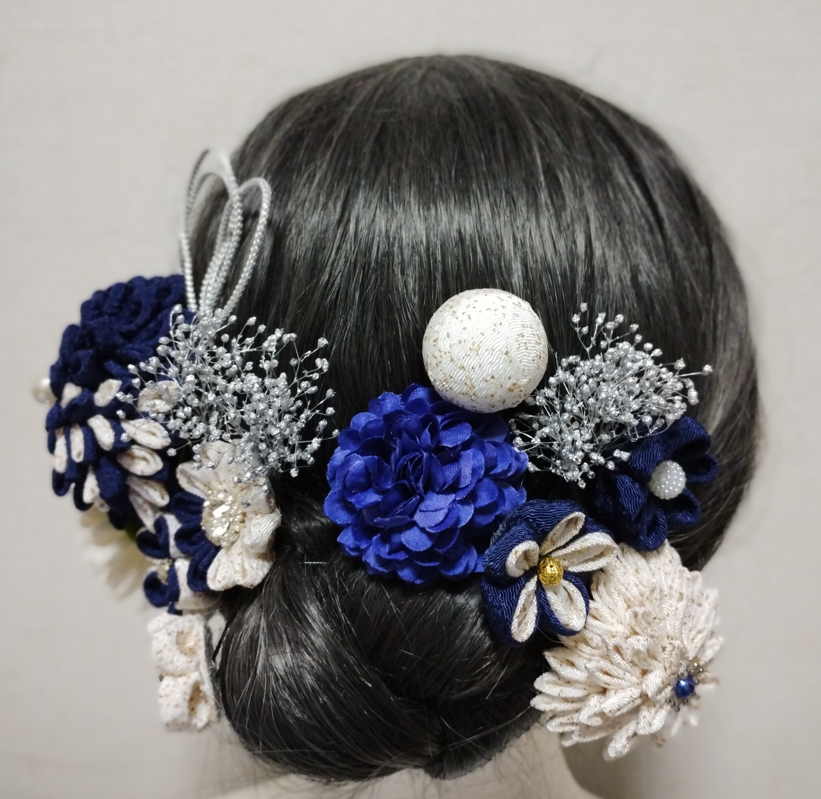 つまみ細工の粋を集めた、鮮やかなブルーと落ち着いた紺色の髪飾りです。成人式、卒業式、七五三、結婚式など、様々なシーンで活躍してくれます。