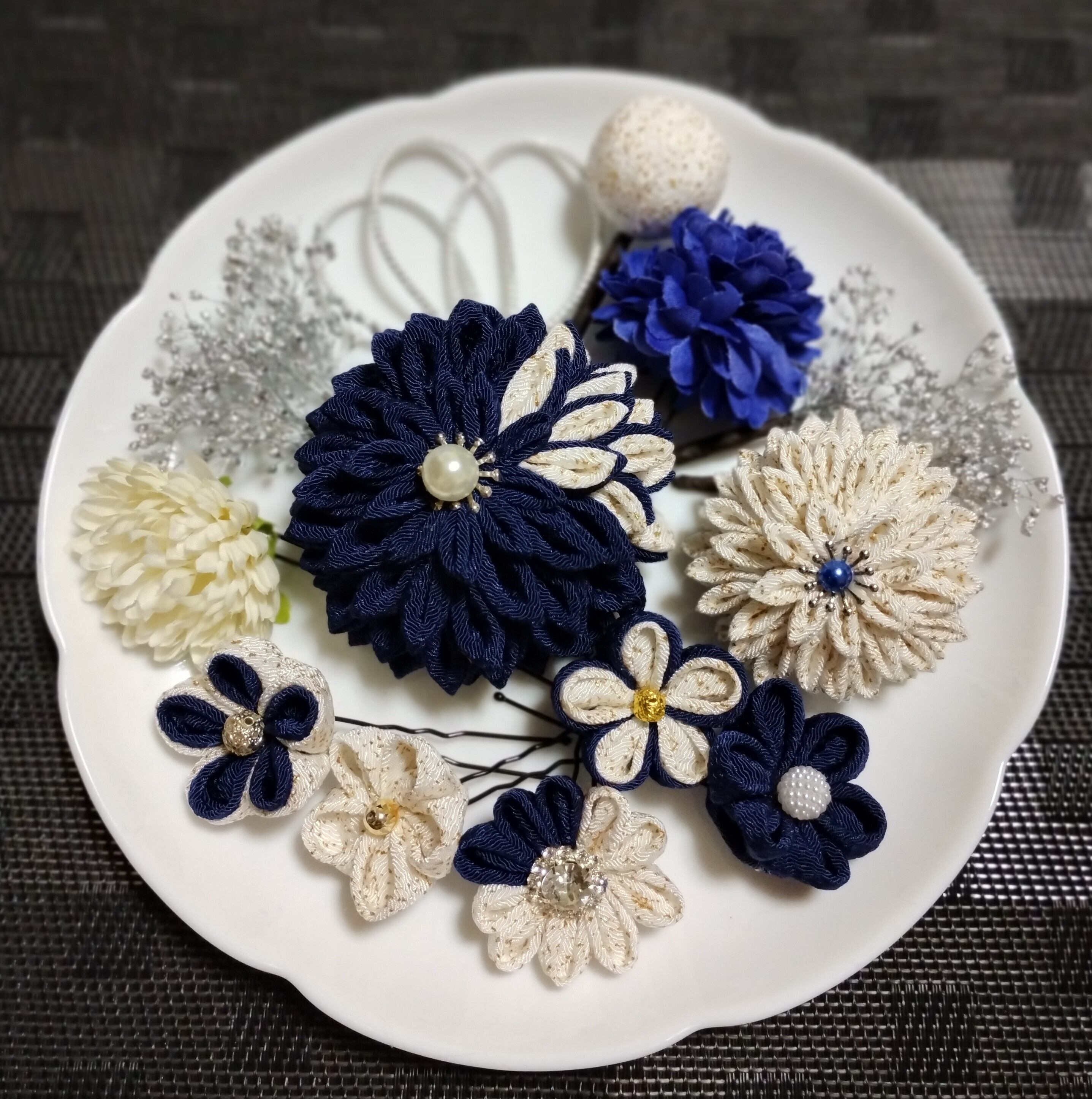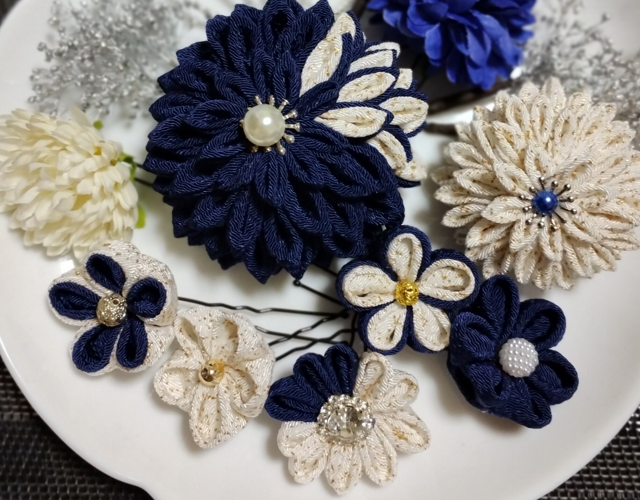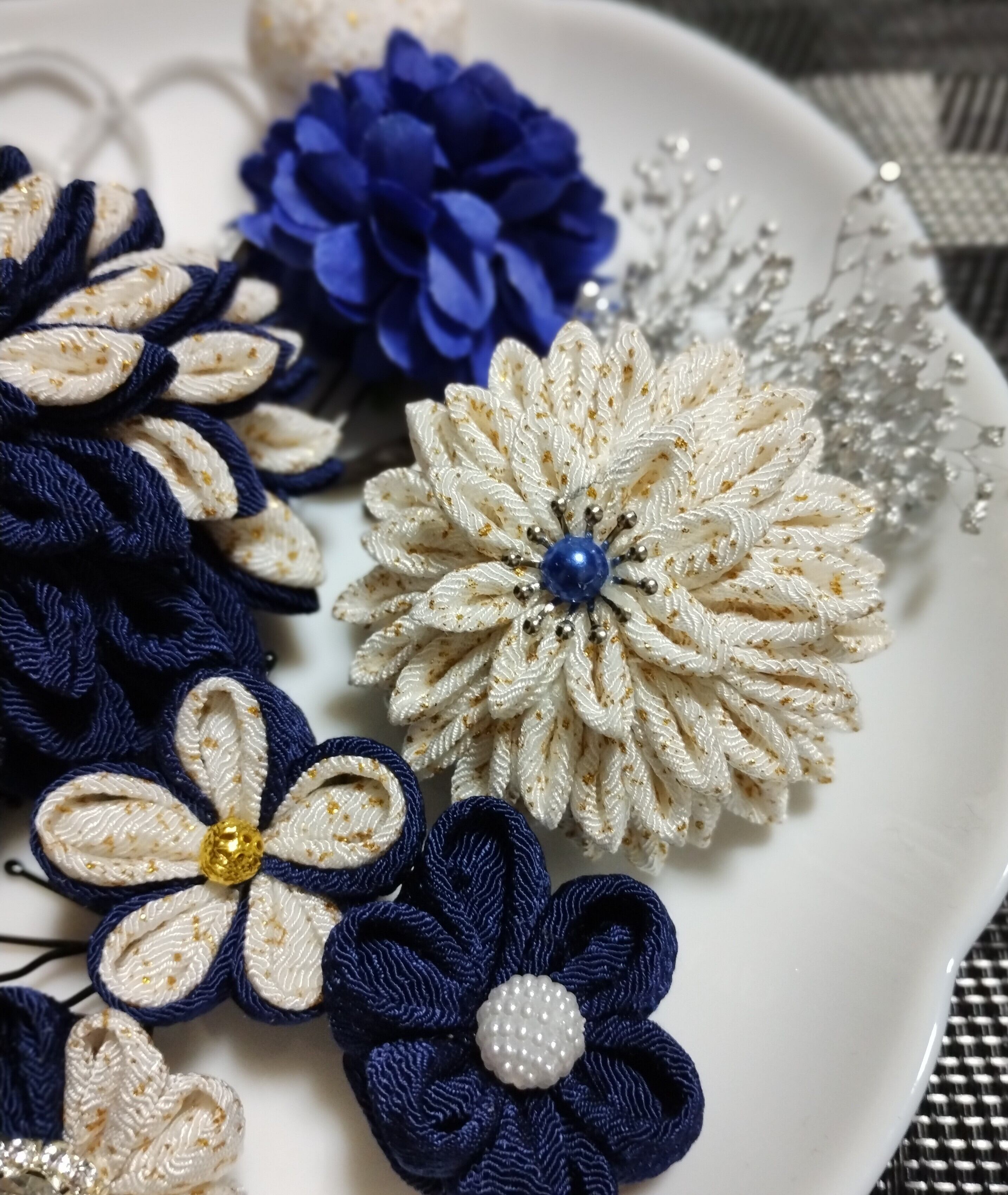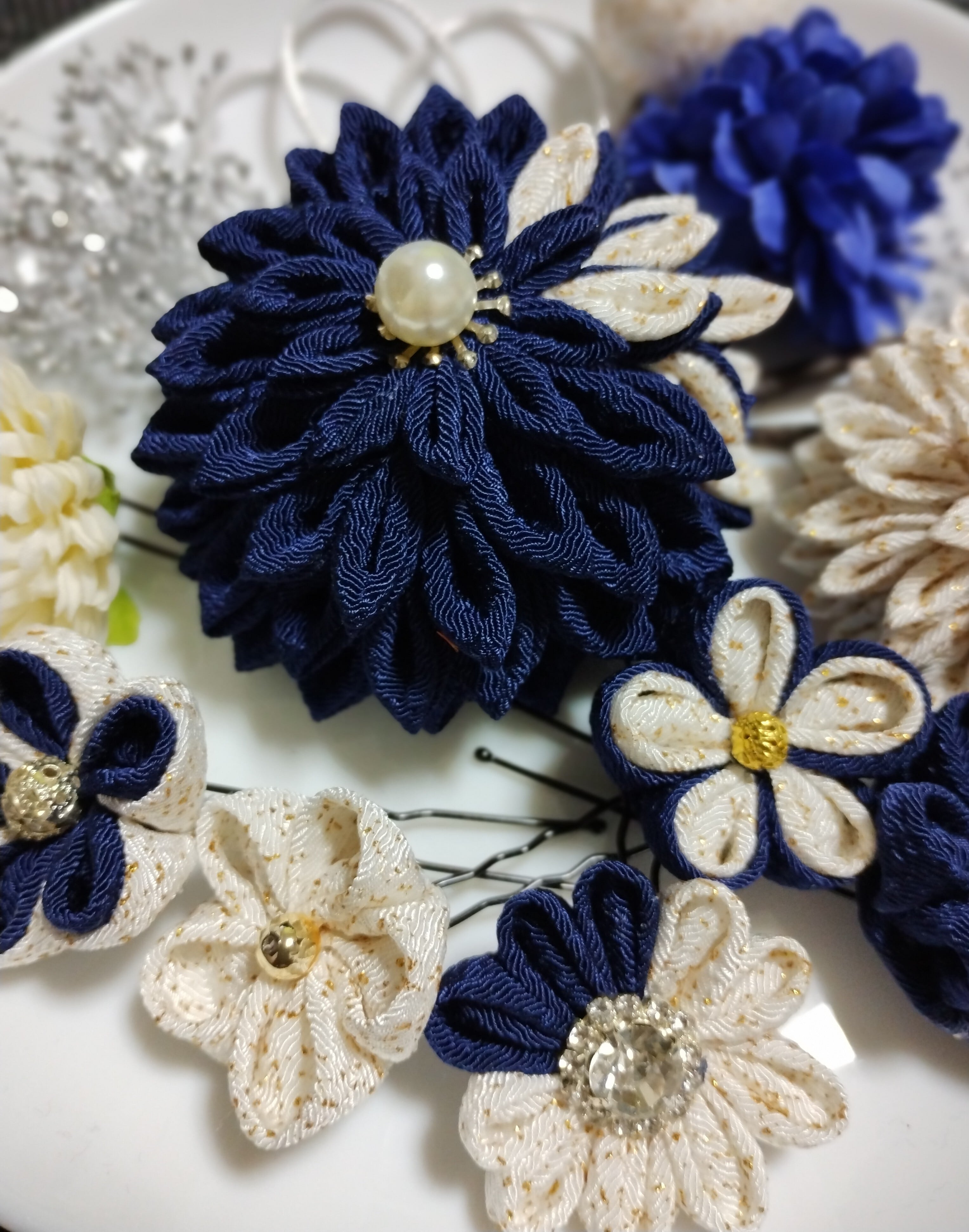 一つ一つ手作りで制作されたつまみ細工は、豊かな色彩感覚が感じられます。ブルーは爽やかさと清潔感を、紺色は落ち着きと品格を、それぞれ演出します。