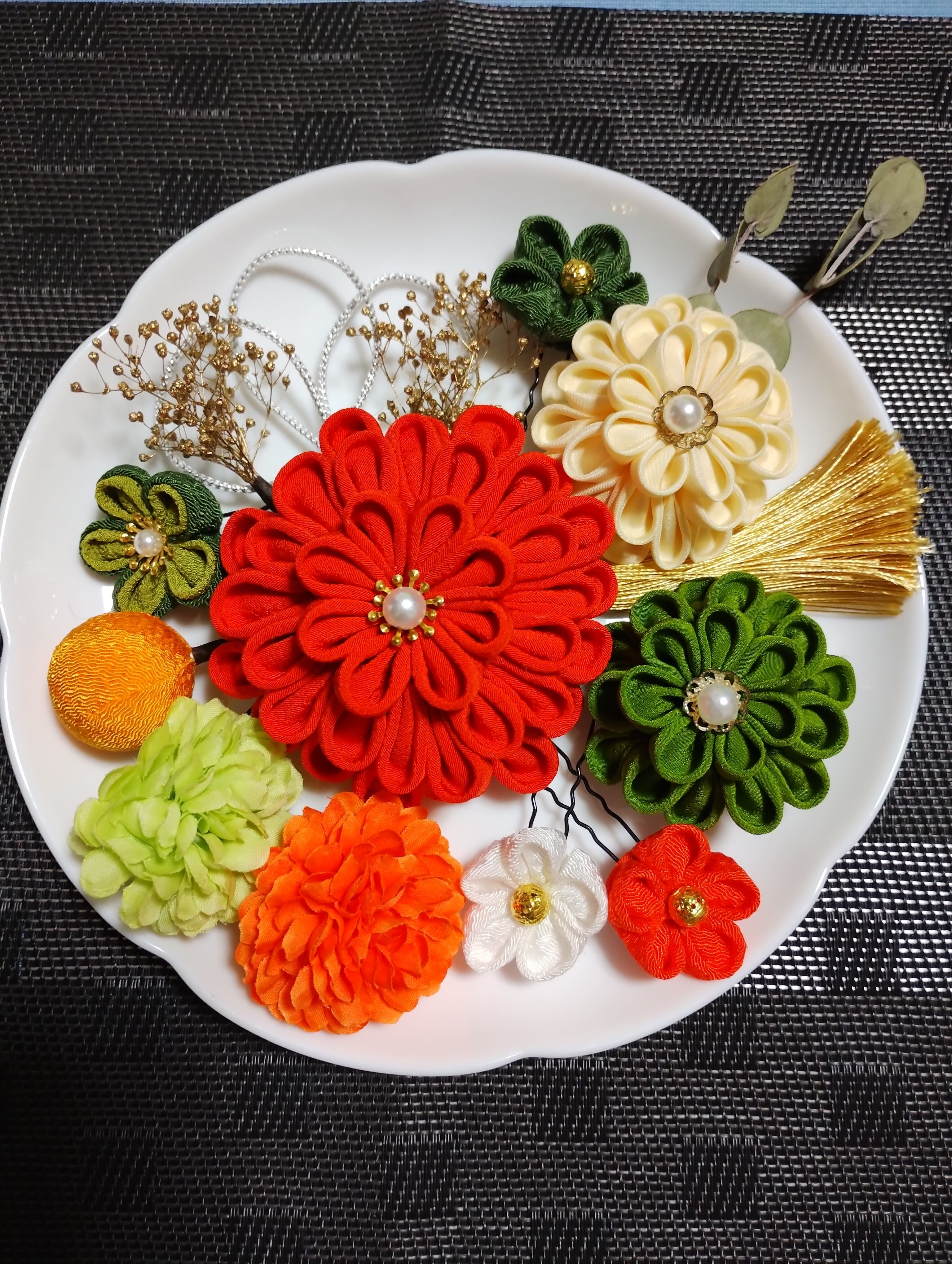 鮮やかな色使いと美しいつまみ細工が魅力の、オシャレで可愛い髪飾りです。髪をアップにした際に、髪飾りをつけることで上品で華やかな印象を与えます。成人式や卒業式、七五三などのお祝い事にはもちろん、普段使いにもぴったりなデザインです。