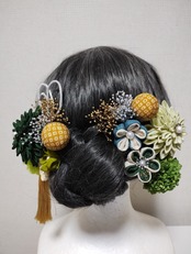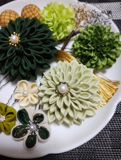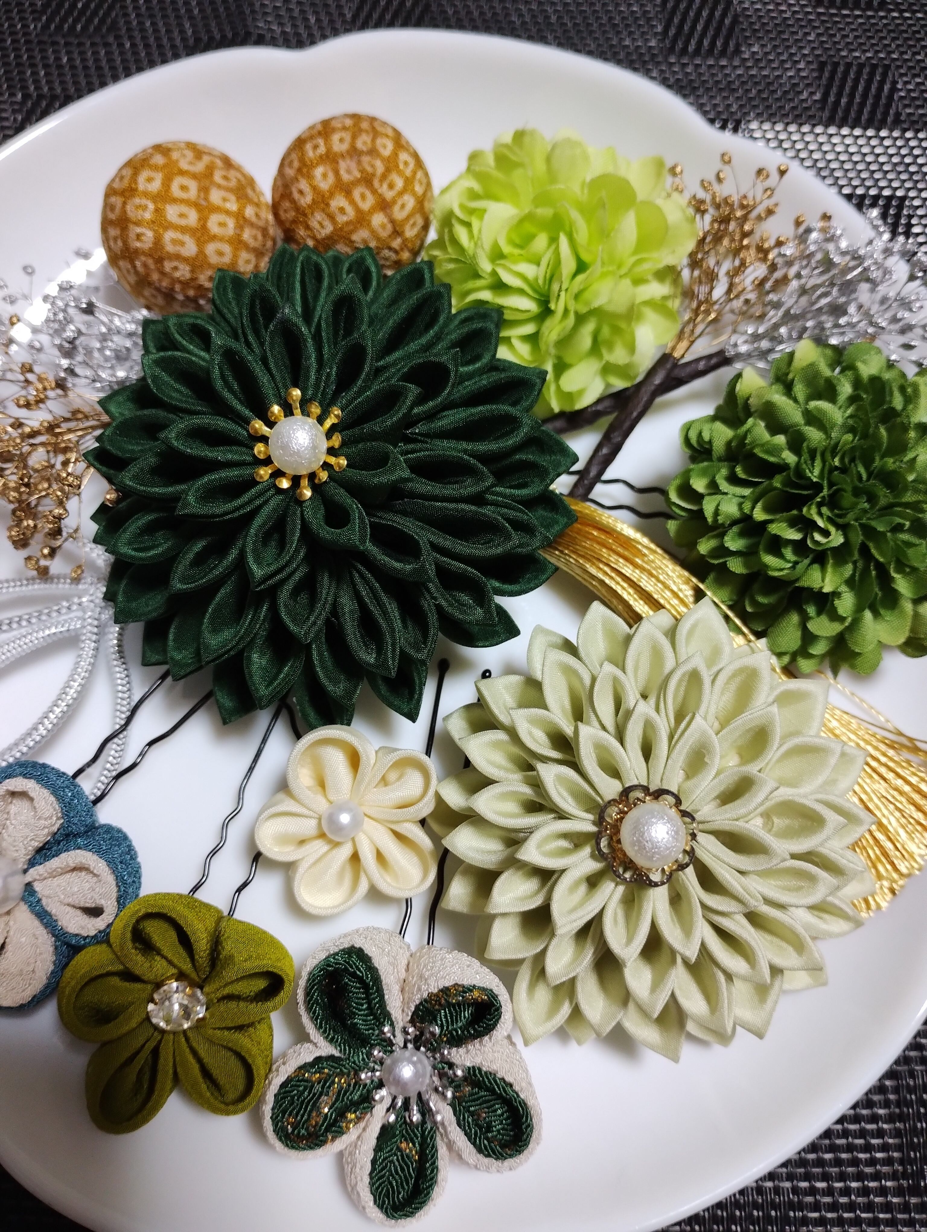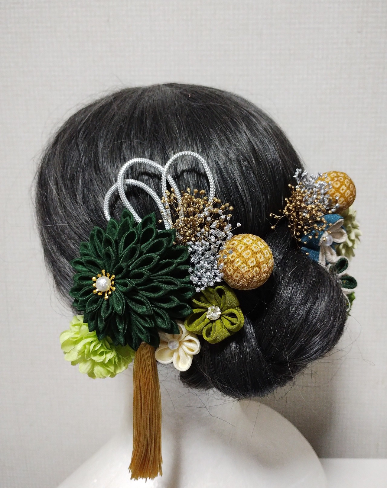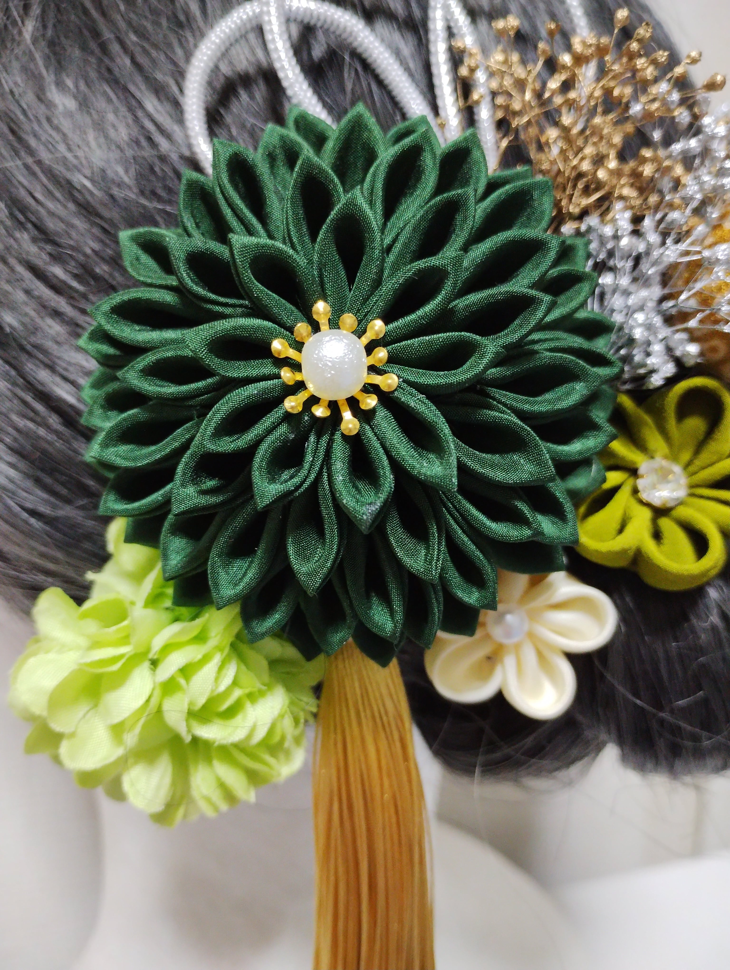 贅沢な手作り髪飾りが登場しました!つまみ細工でほどこされた花々が、あなたの髪を美しく飾ります。濃い目のグリーンが印象的な、大人っぽく可愛らしいデザイン。成人式、卒業式、七五三や、色打掛に合わせても素敵です。