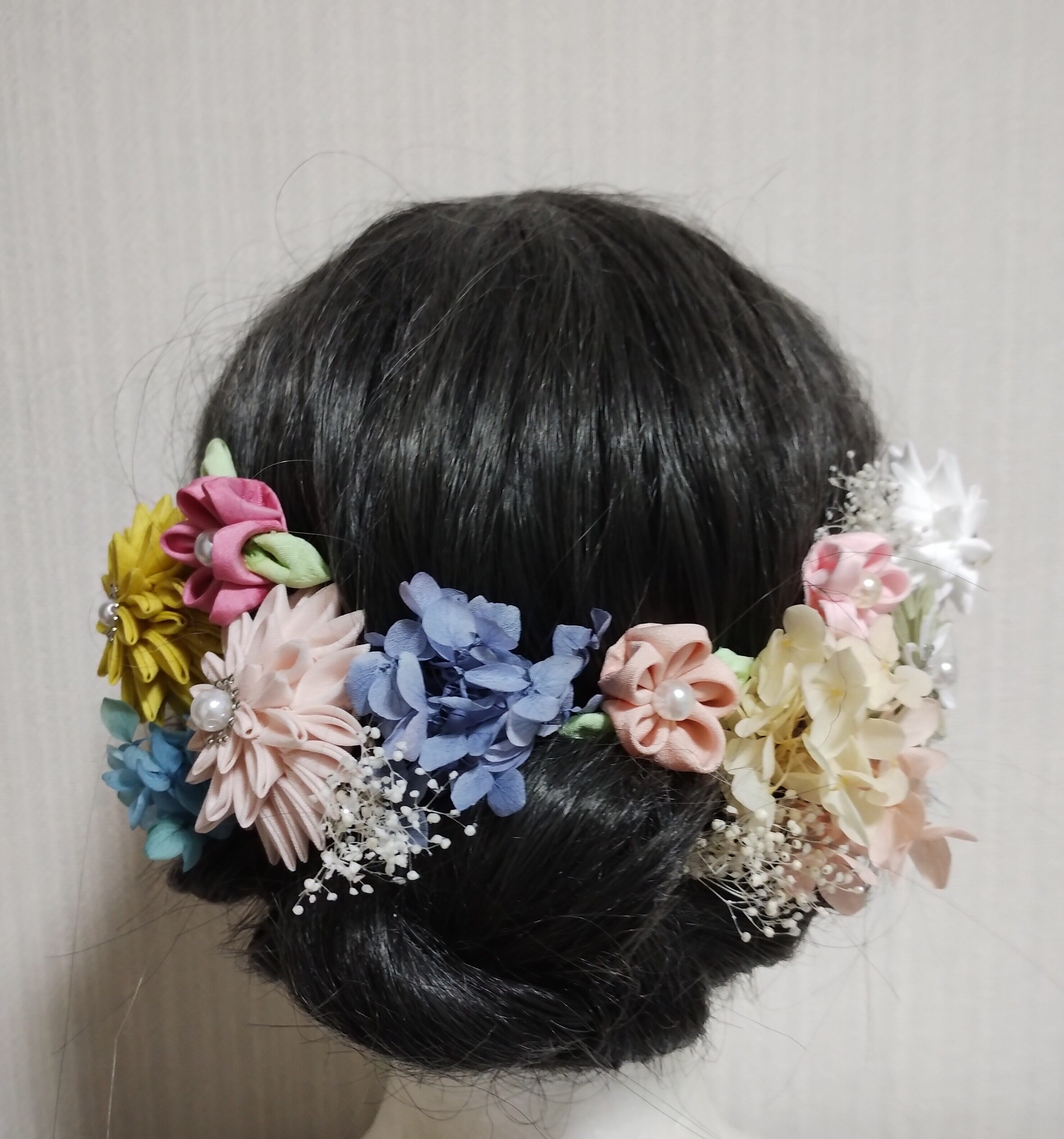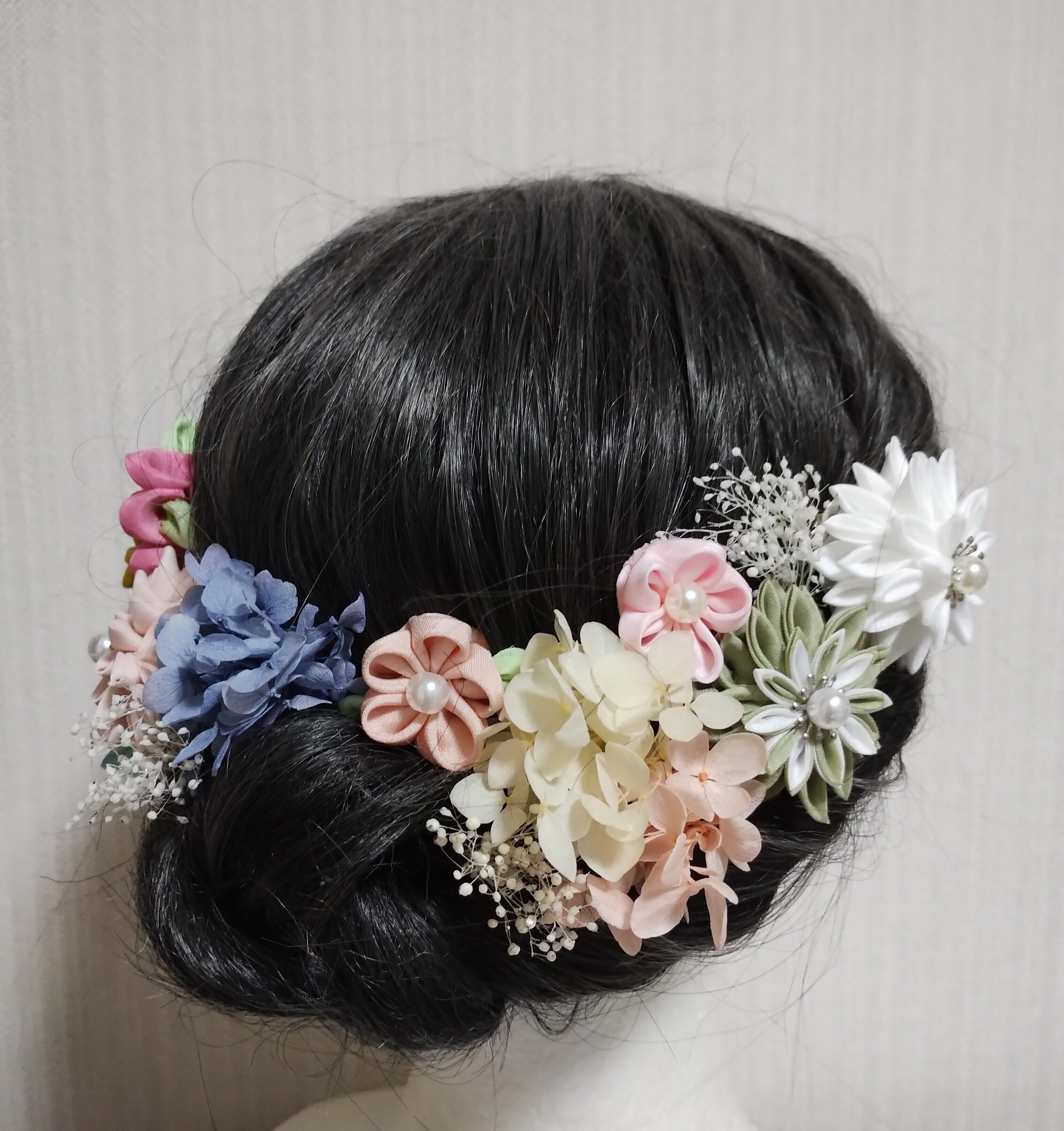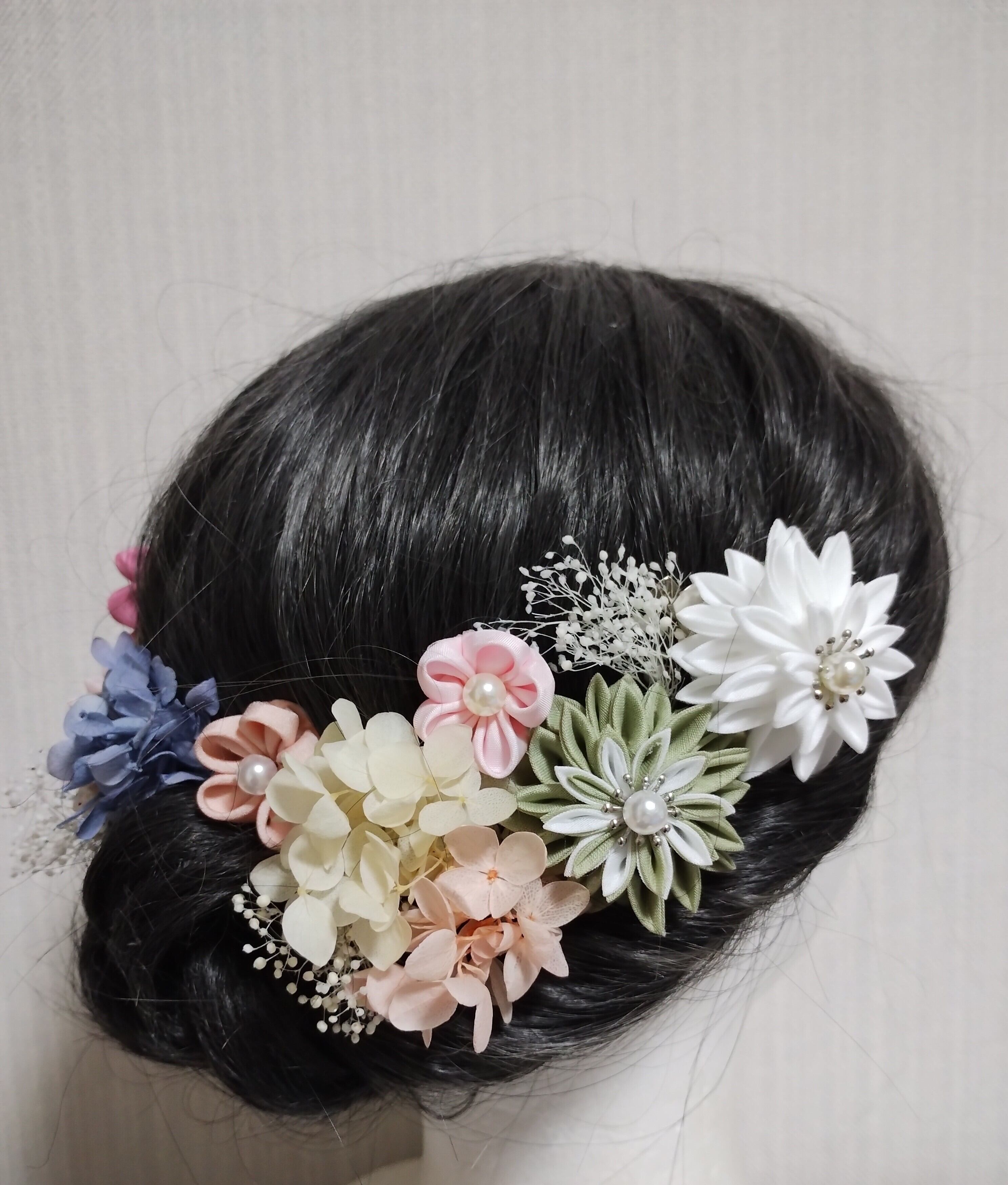 上品さと華やかさを兼ね備えた、つまみ細工髪飾りの登場です。成人式や卒業式、七五三や振袖などの特別な日に最適な髪飾りです。手作りの花々やリボン、ビーズなどを組み合わせ、細かな技術で作り上げられた美しいデザインが特徴です。髪に留めるだけで、一気に華やかな印象に仕上げてくれます。