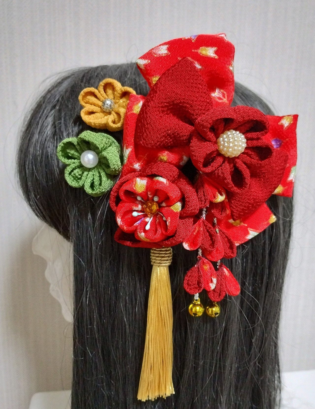この髪飾りは、長くご愛用いただけるよう、丁寧な作りと高品質の材料を使用しています。特に赤は、華やかさという意味で優れた色彩とされており、お祝いのイベントにぴったりです。