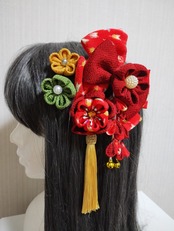 髪飾りえんじは、伝統的なつまみ細工を使った髪飾りです。手作りのため、一つひとつの花びらやリボンの形状が異なり、個性的なデザインが特徴です。成人式や卒園式といった特別なイベントにぴったりのアイテムです。