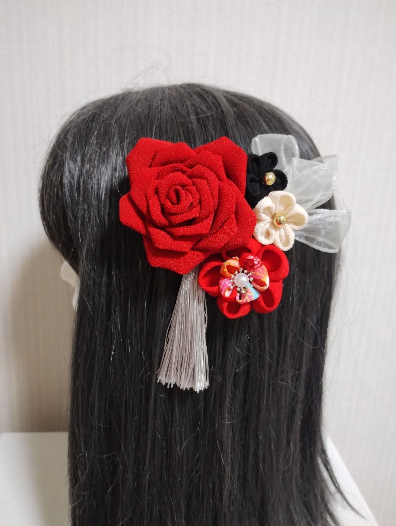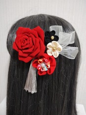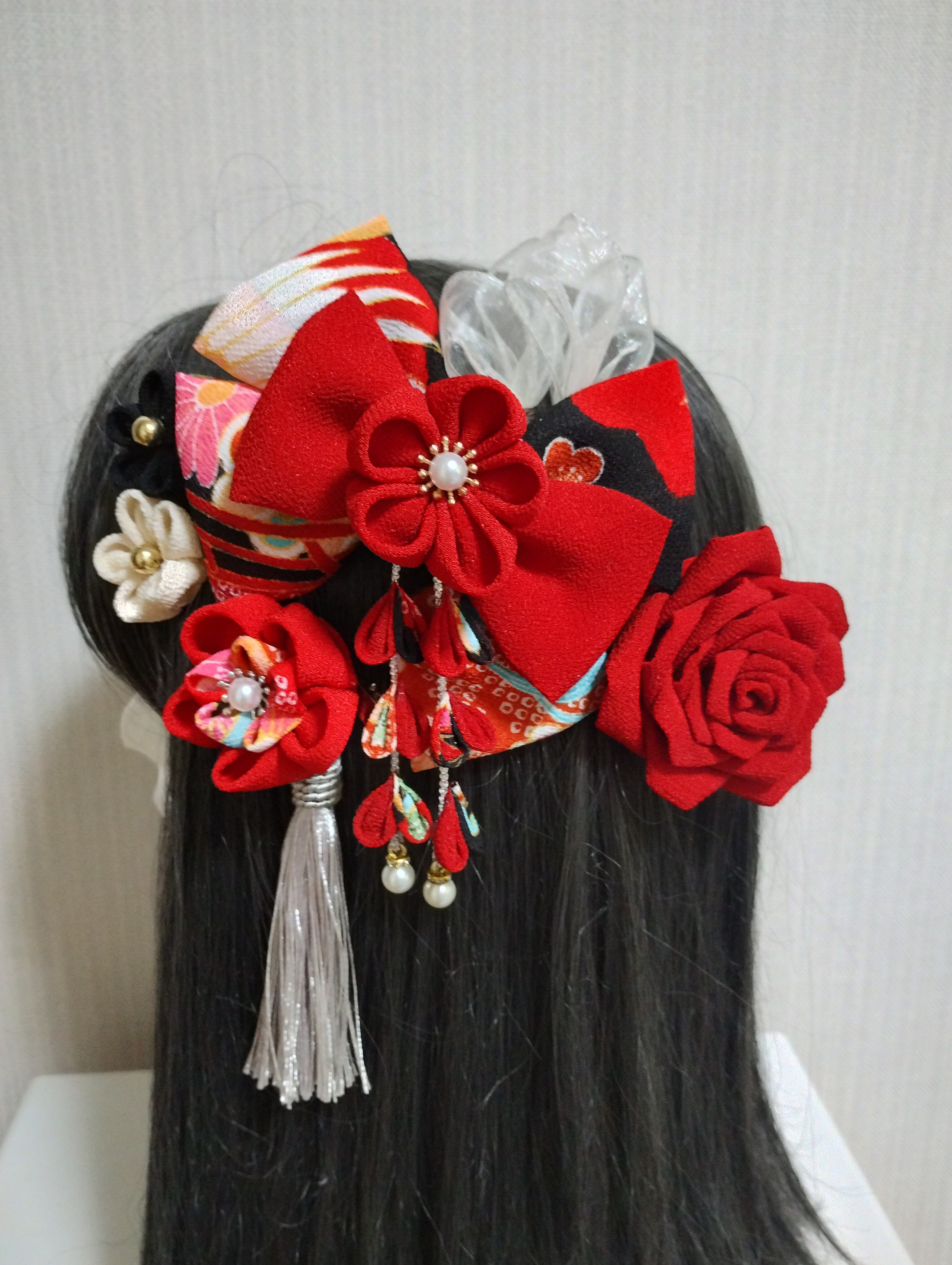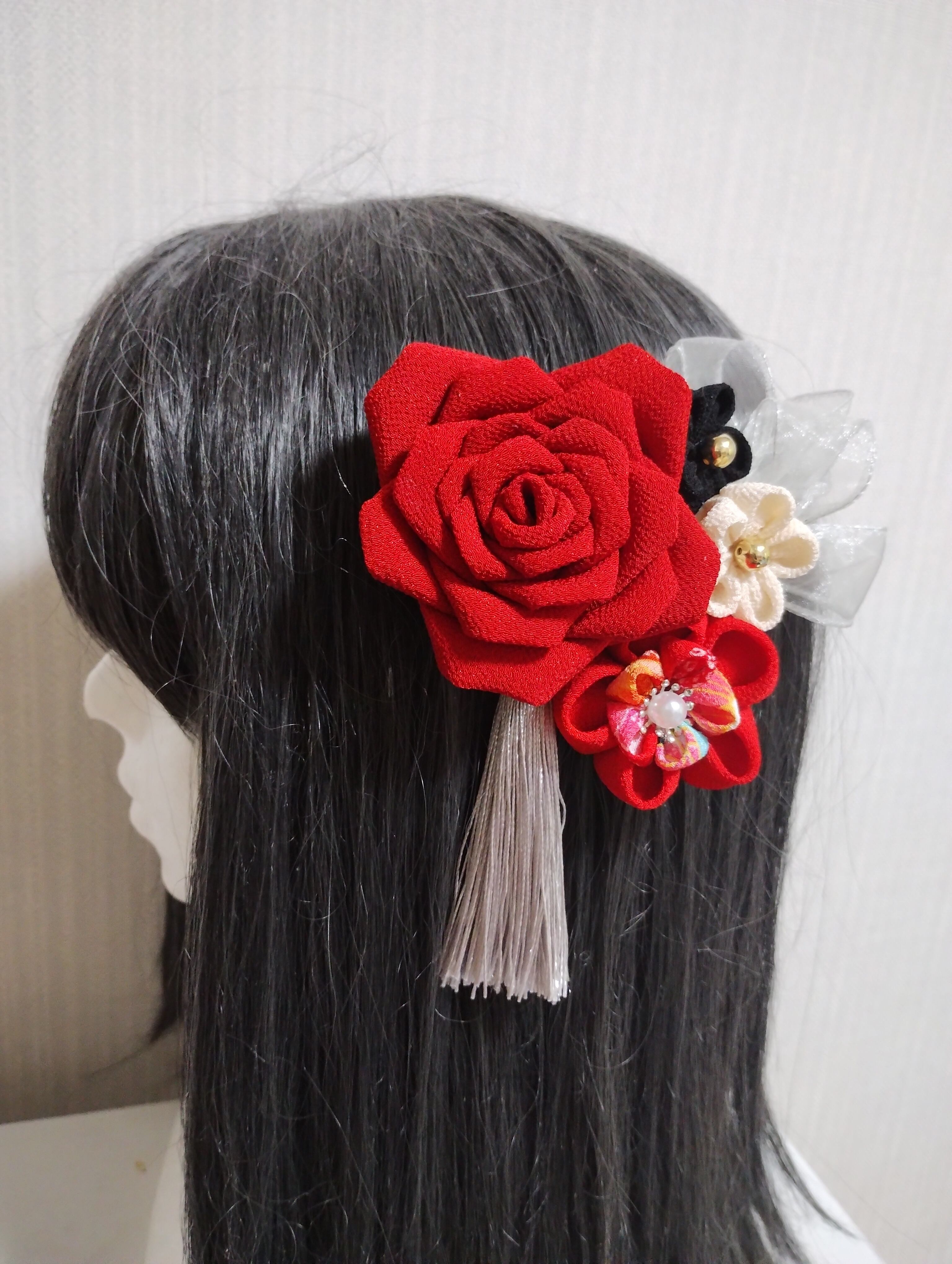 華やかな髪飾りで、特別な日を彩りましょう。赤いリボンと美しい薔薇が魅力的なこの髪飾りは、成人式や卒園式、七五三などの特別なイベントにぴったりです。つまみ細工で作られた繊細な花が、髪に華やかさをプラスしてくれます。