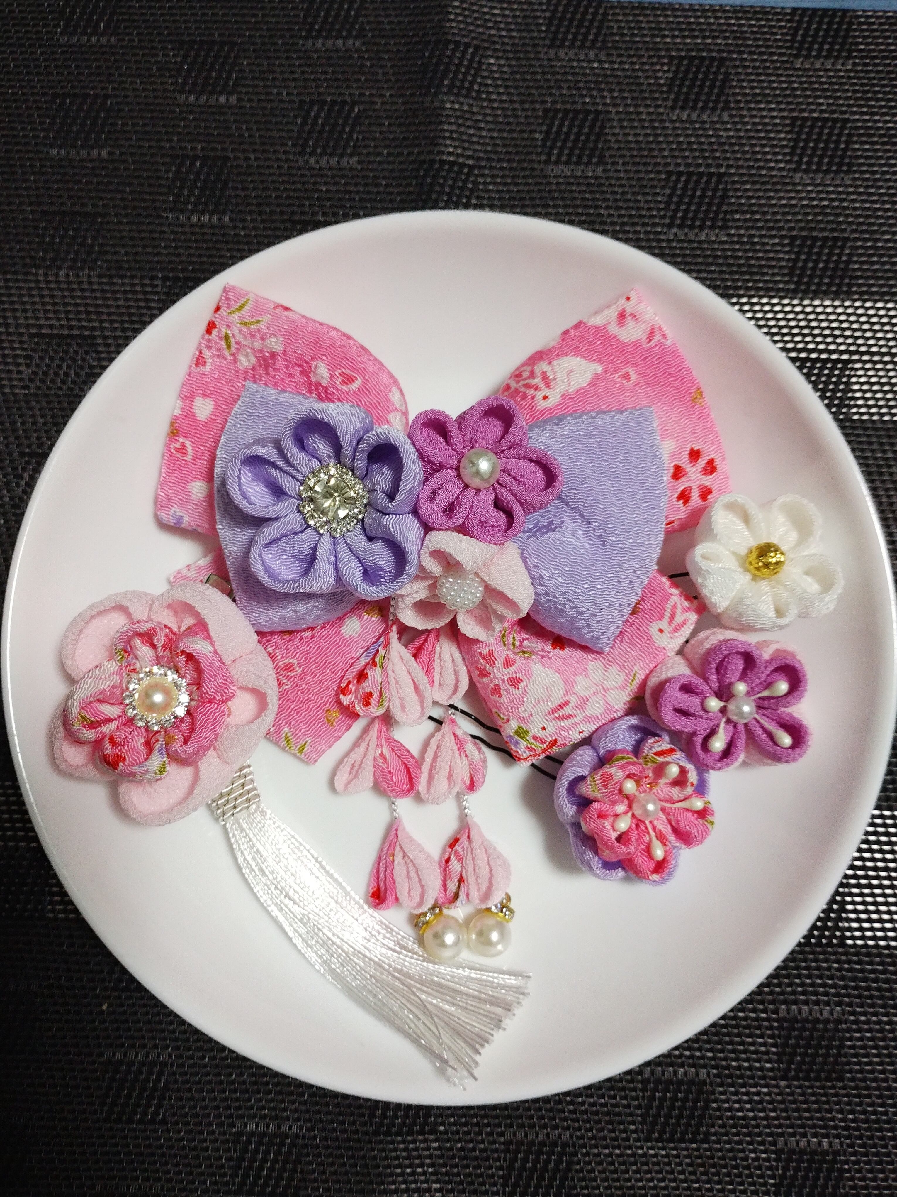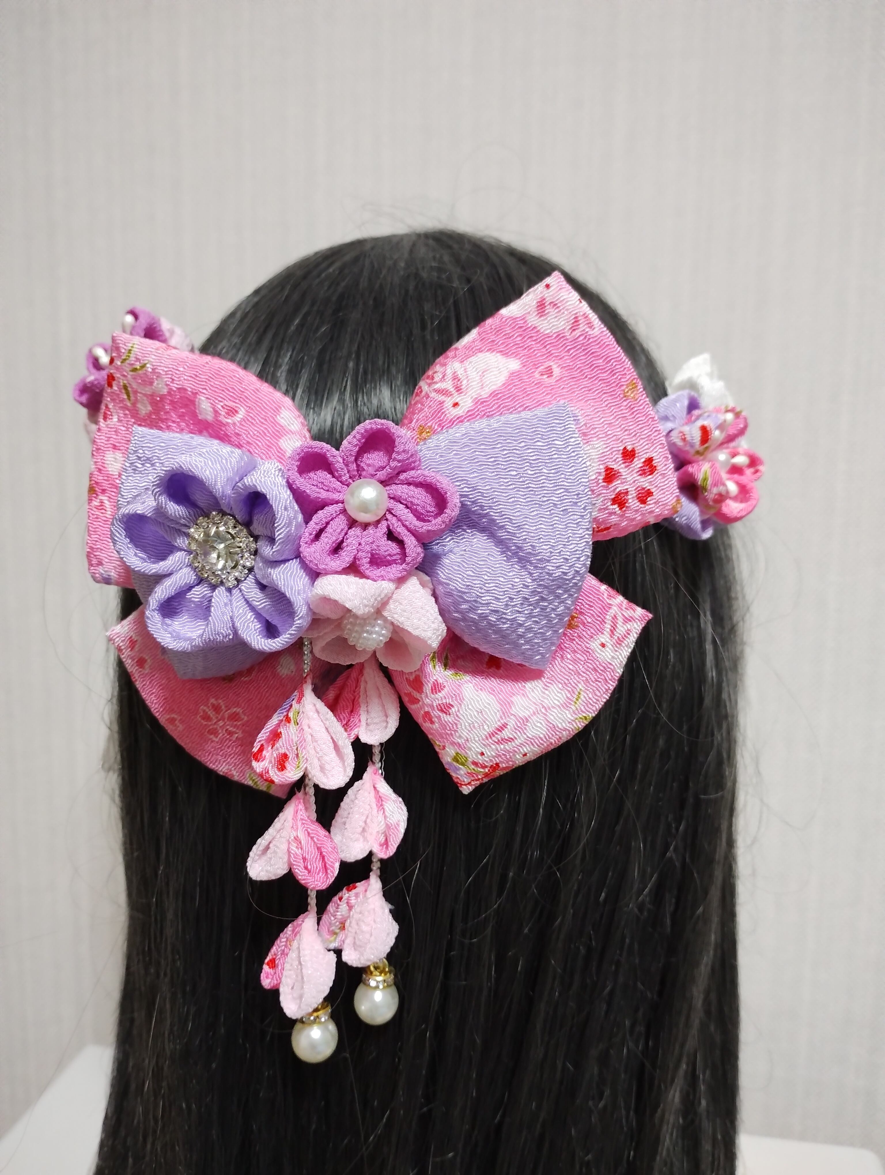この髪飾りは、職人の手によってひとつひとつ丁寧に作られています。伝統的なつまみ細工の技法を使い、花の形やリボンの繊細なディテールを再現しています。