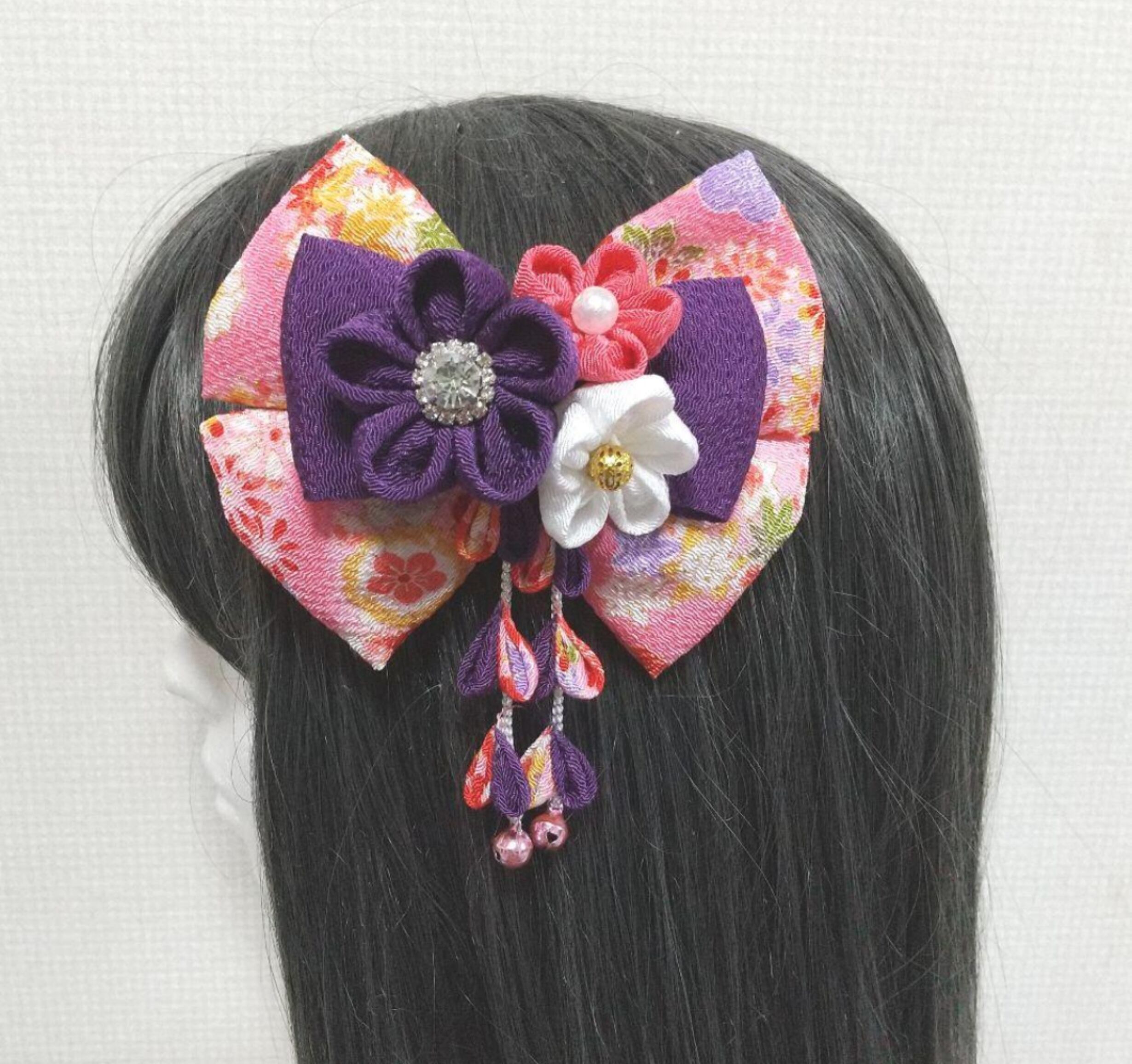 華やかなリボンとピンクの鮮やかな色使いが特徴の髪飾りです。卒業式や卒園式、七五三などの華やかな場にぴったりのアイテムです。髪に挿したままでも、リボンを外してヘアゴムとしても使用可能です。一つ一つ手作りされた丁寧なデザインで、大切な日のスタイリングに華を添えます。