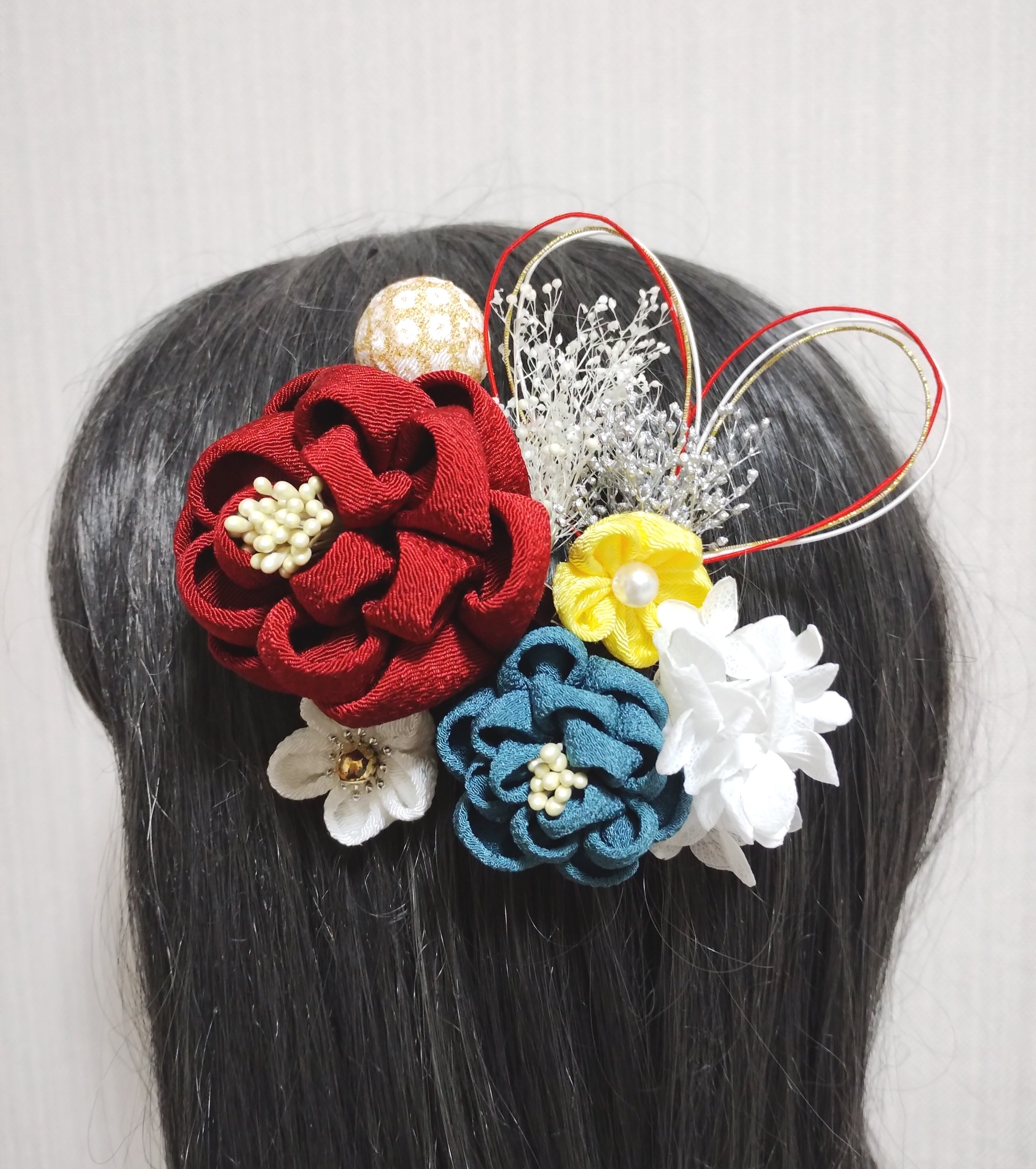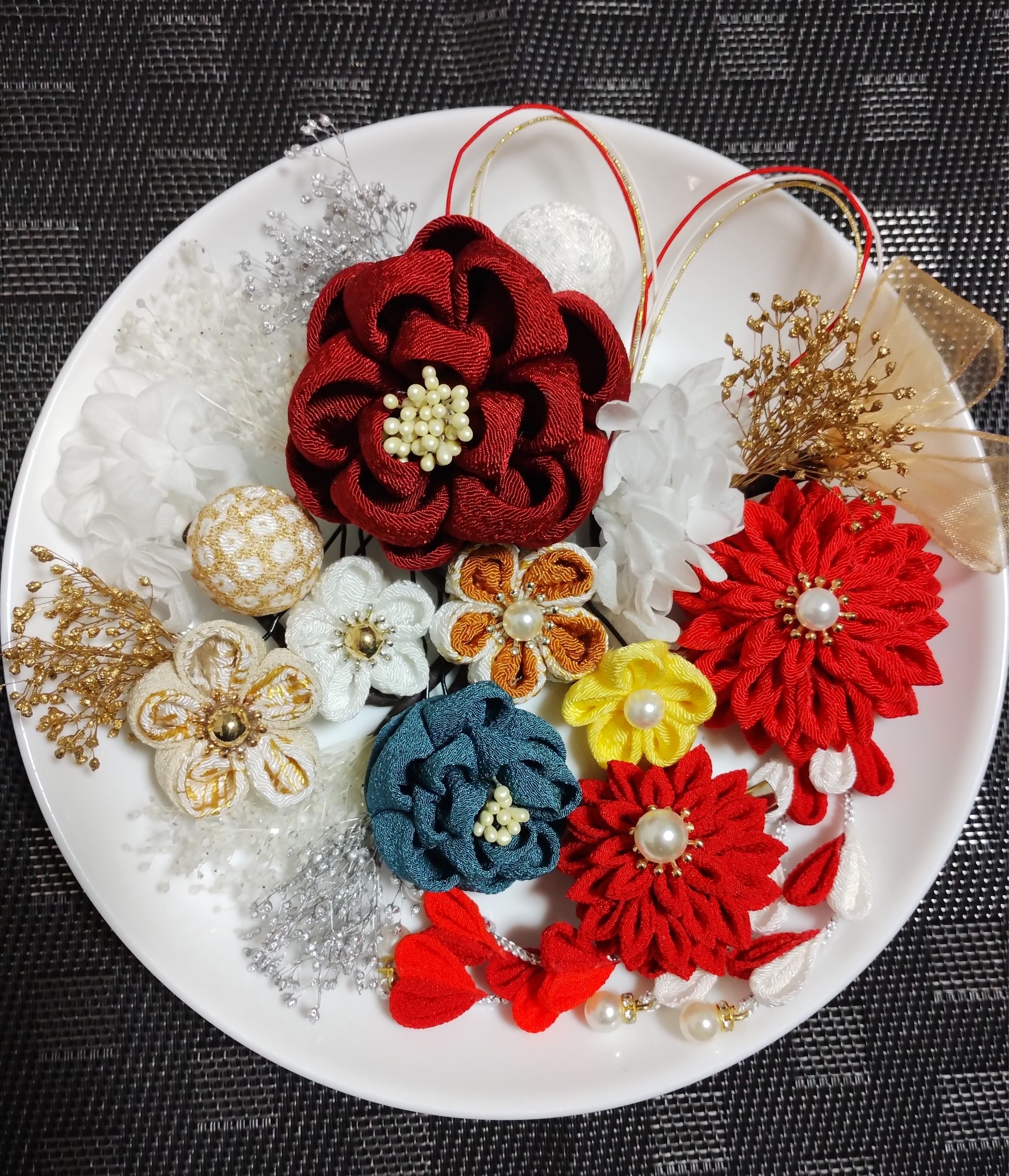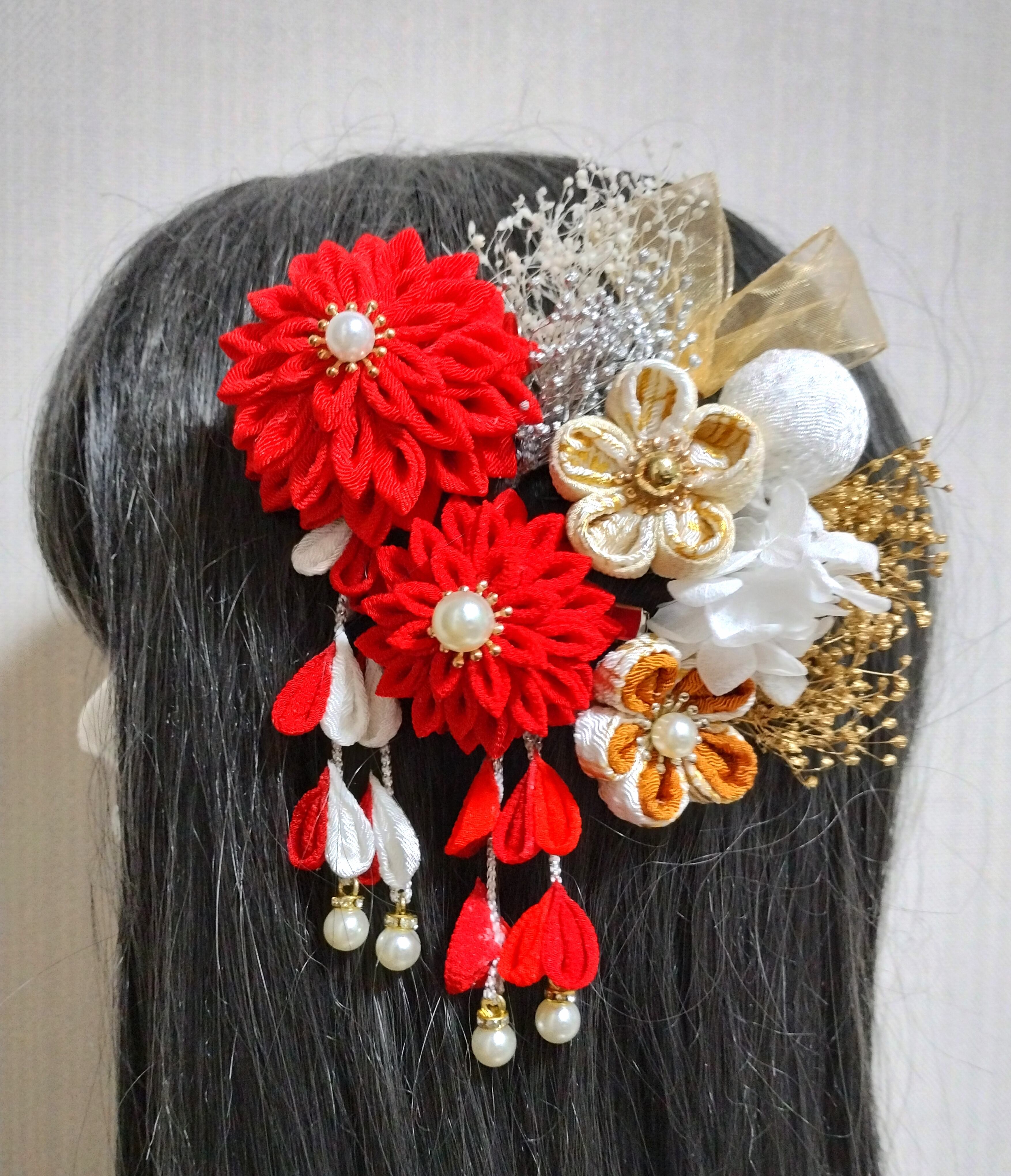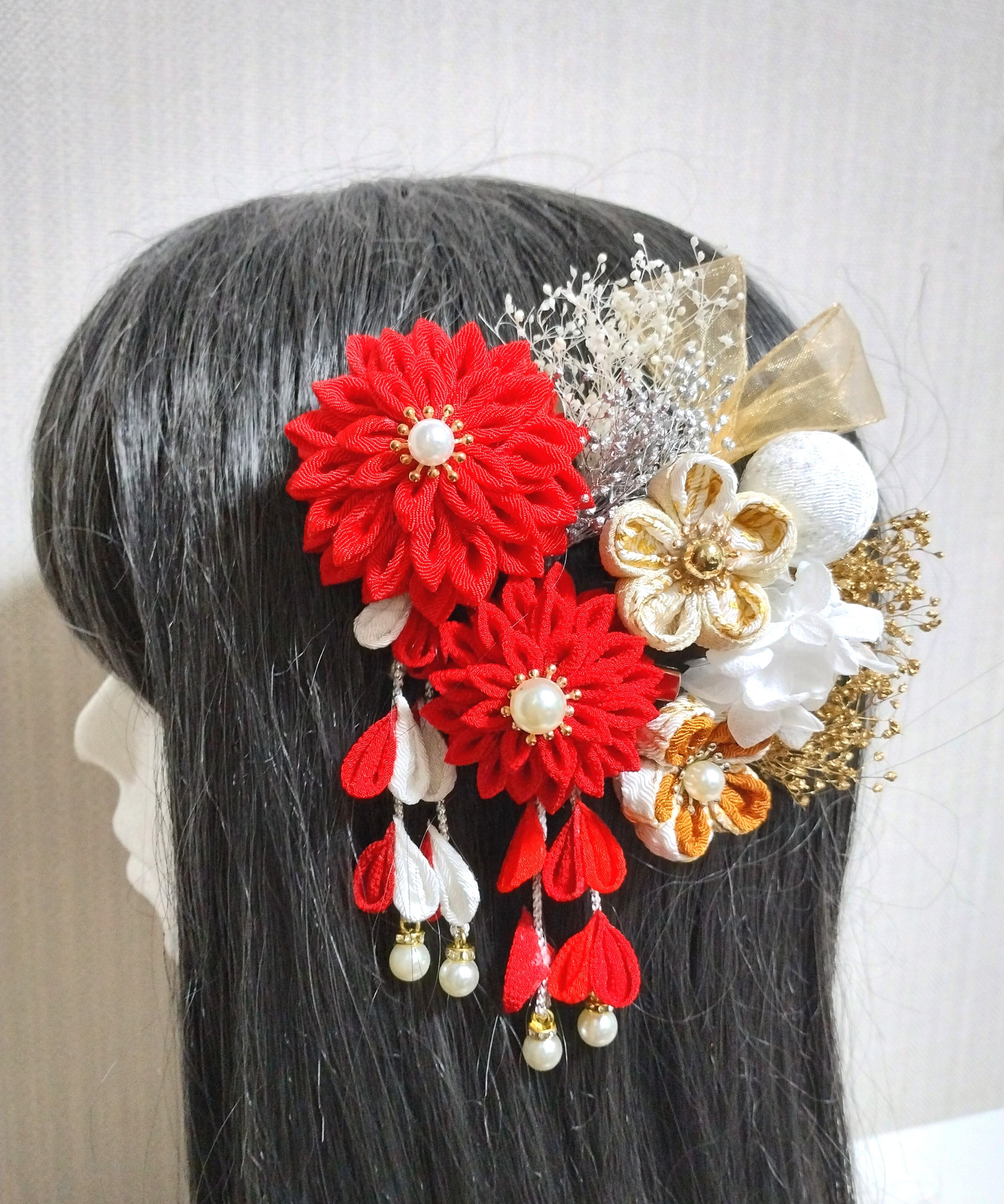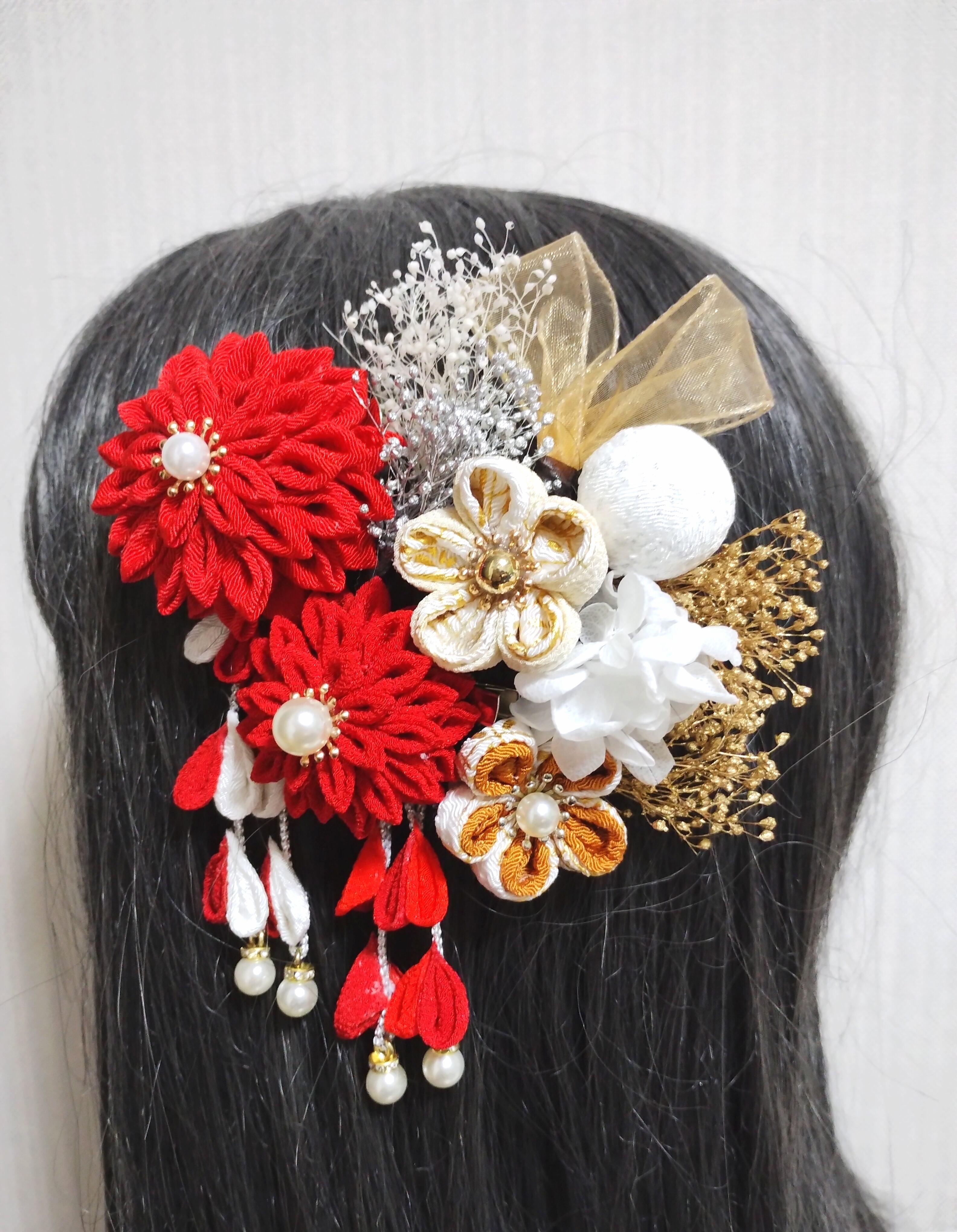 美しい花の髪飾りで、特別な日を彩りませんか?赤やえんじ色のつまみ細工の花びらが、髪に華やかさを添えます。成人式や卒業式、七五三など特別なシーンにぴったりです。
