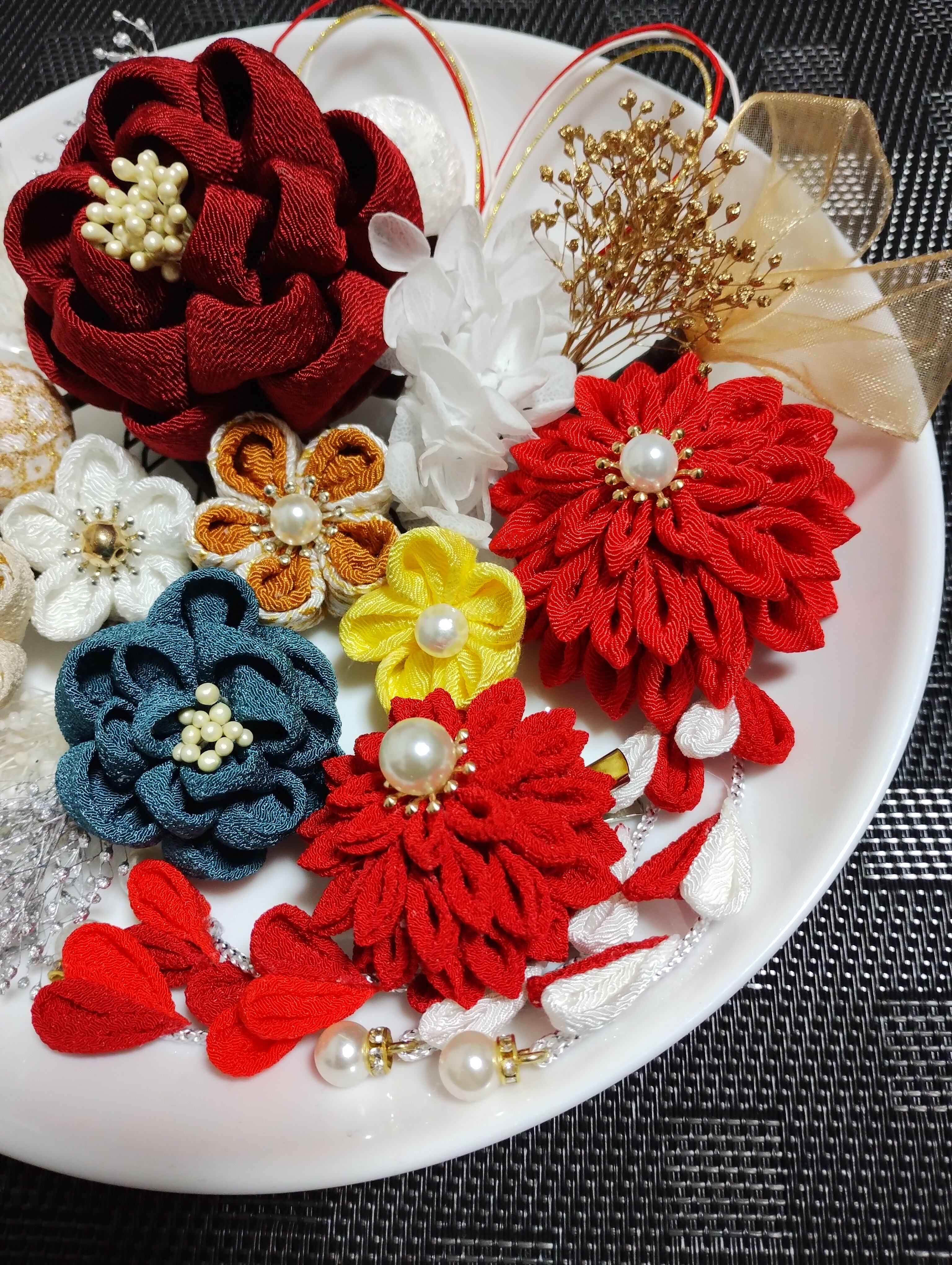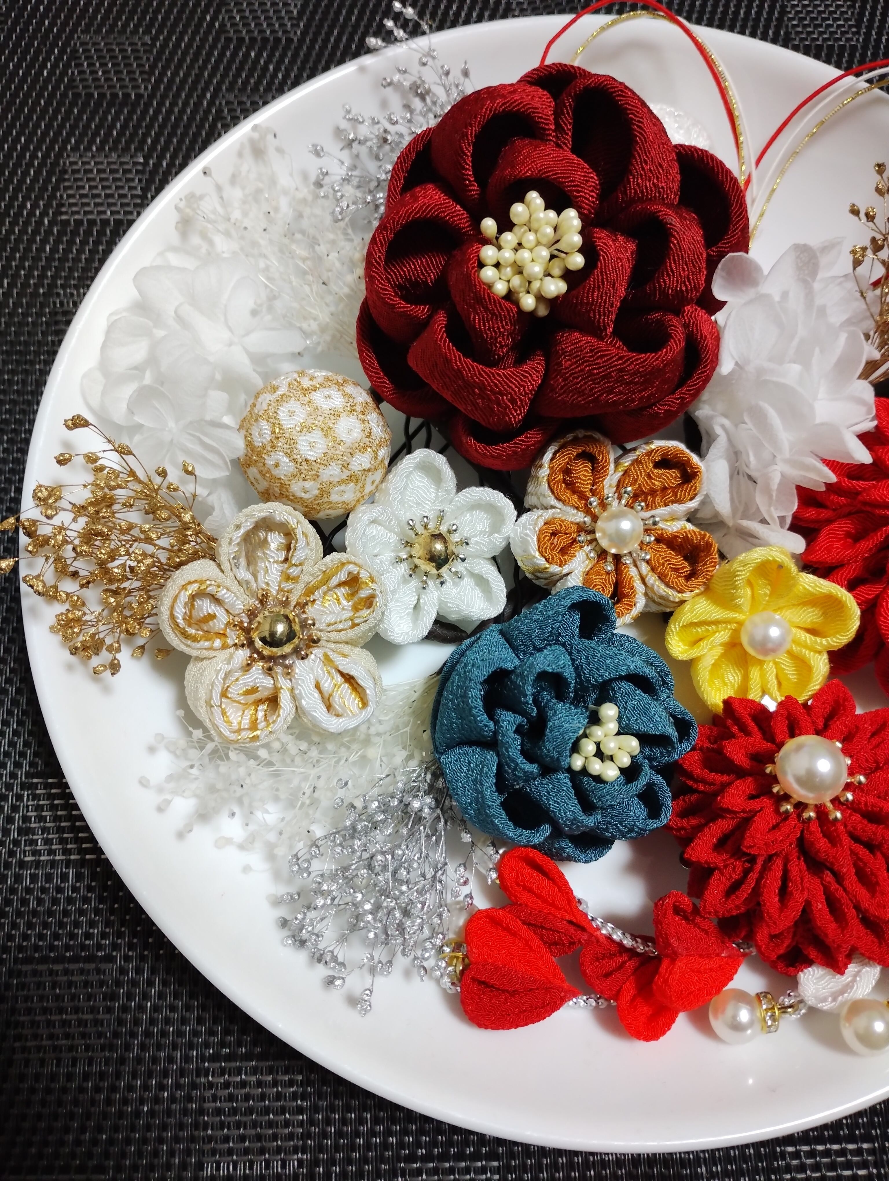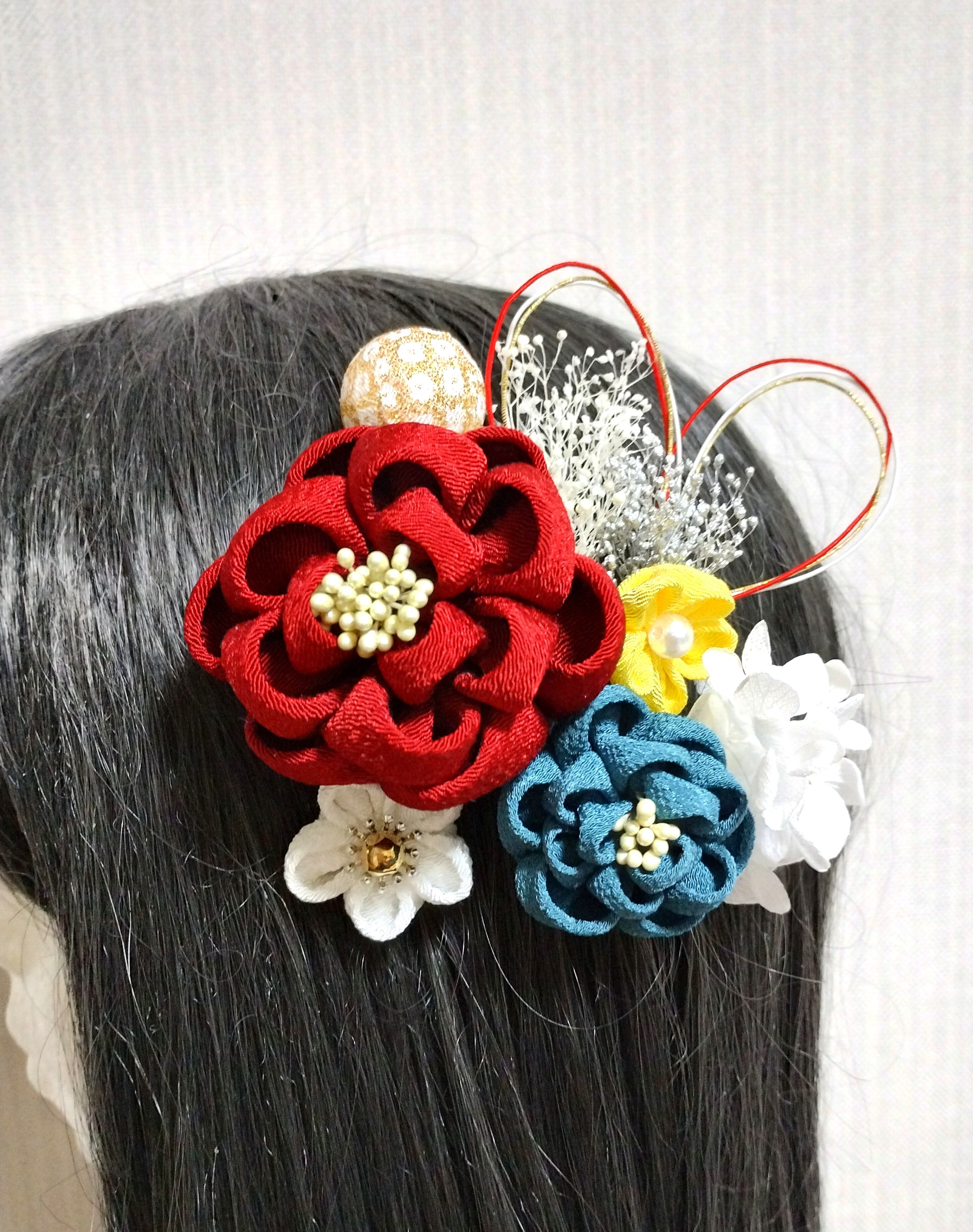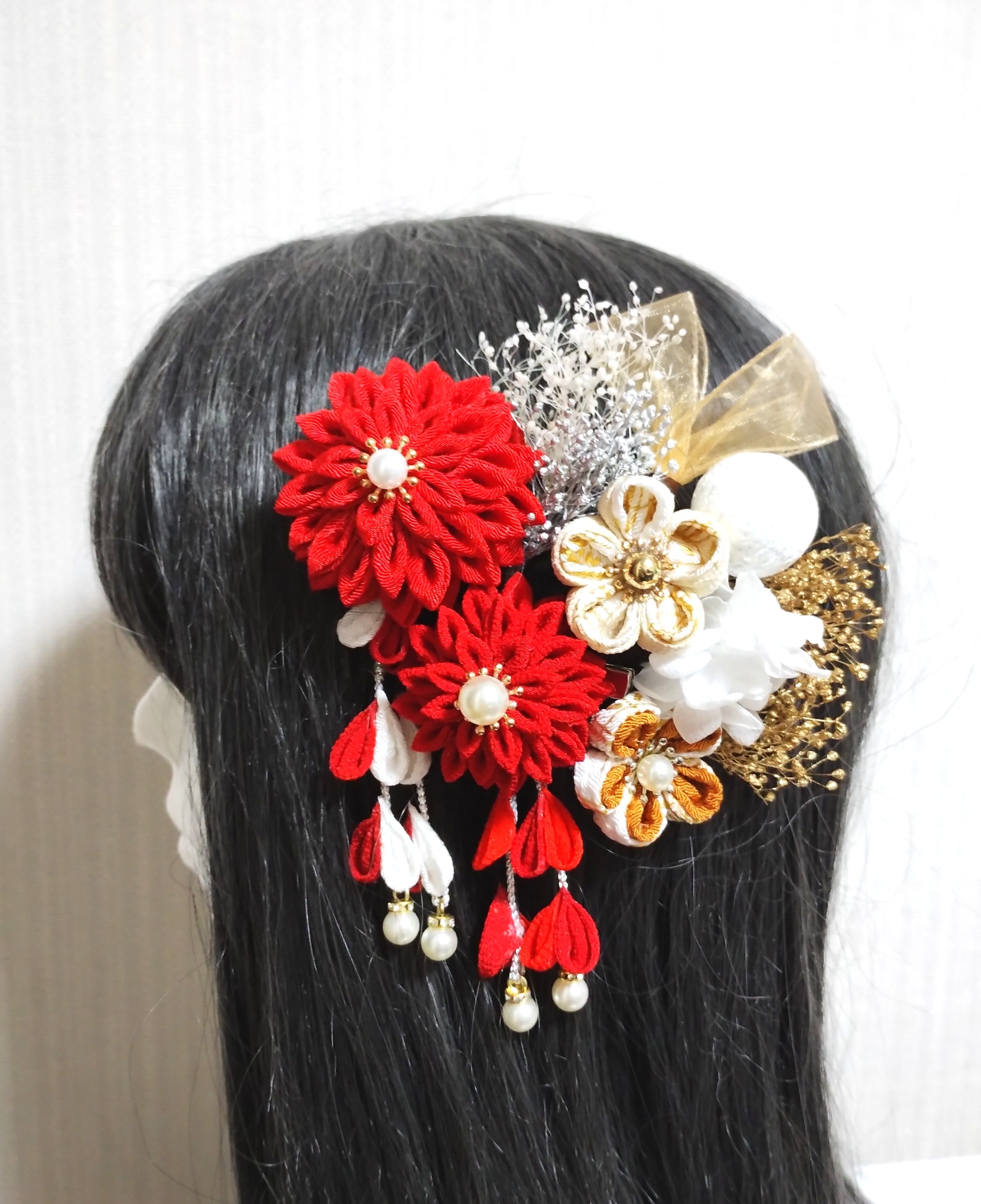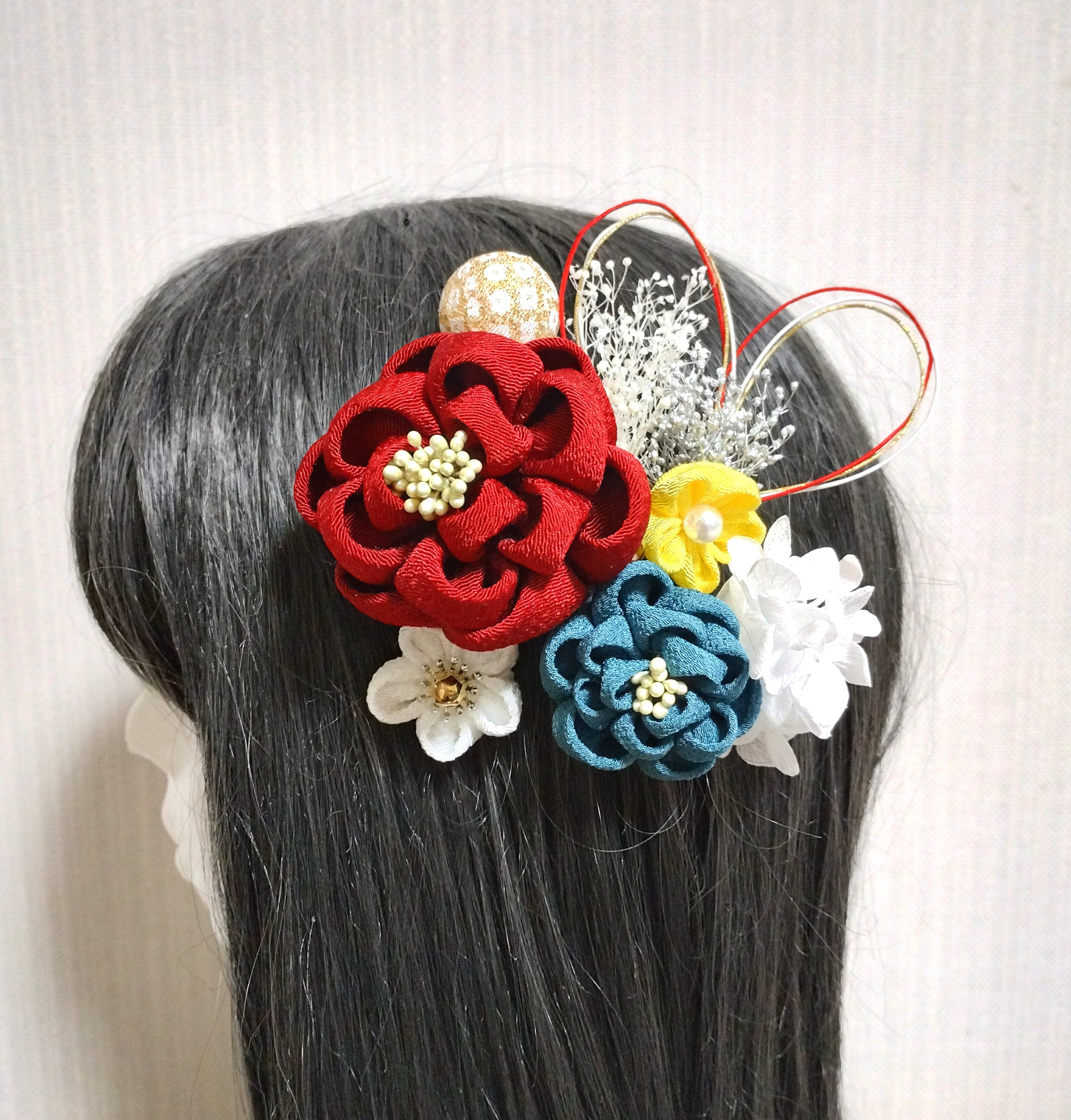 美しい花の髪飾りで、特別な日を彩りませんか?赤やえんじ色のつまみ細工の花びらが、髪に華やかさを添えます。成人式や卒業式、七五三など特別なシーンにぴったりです。