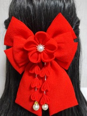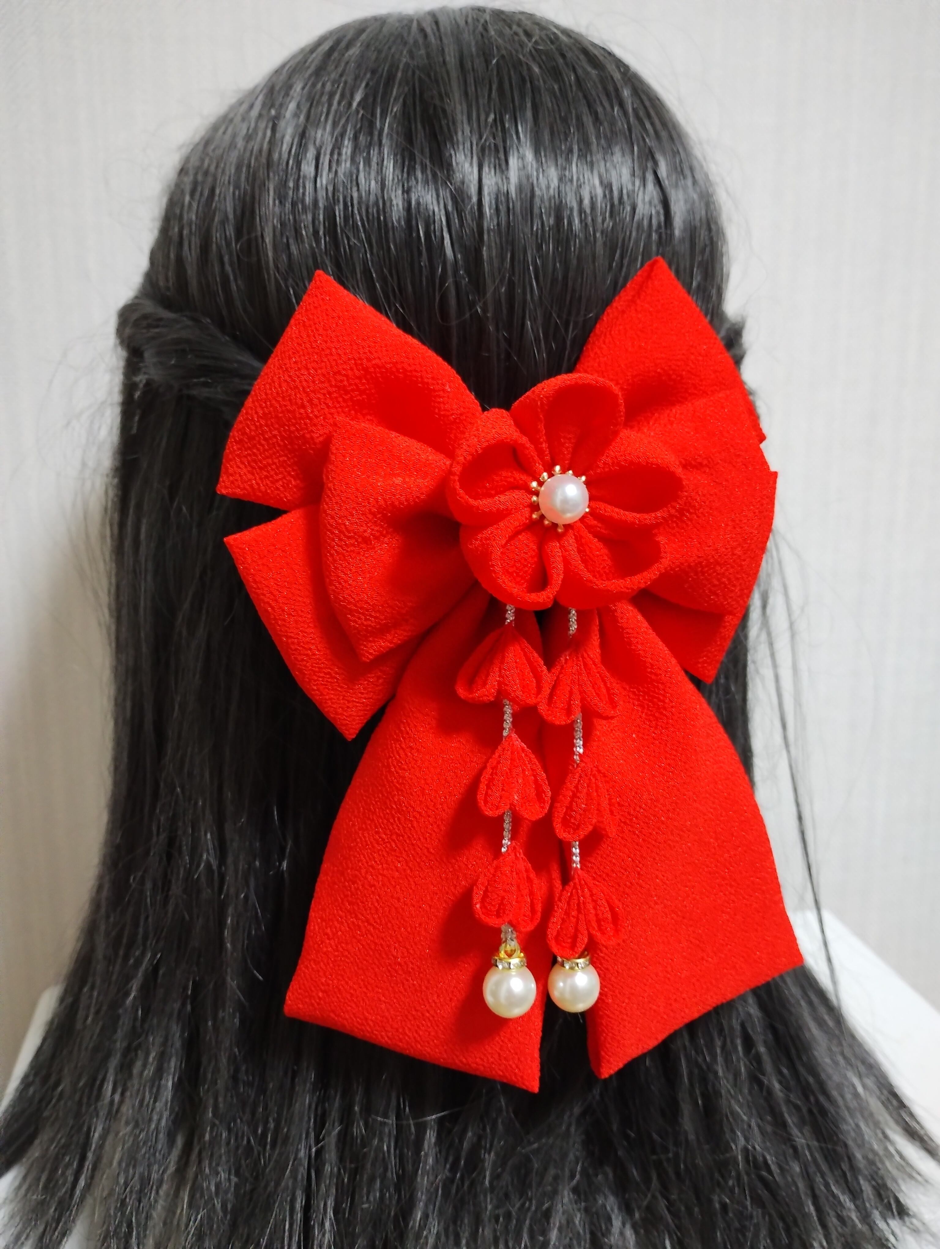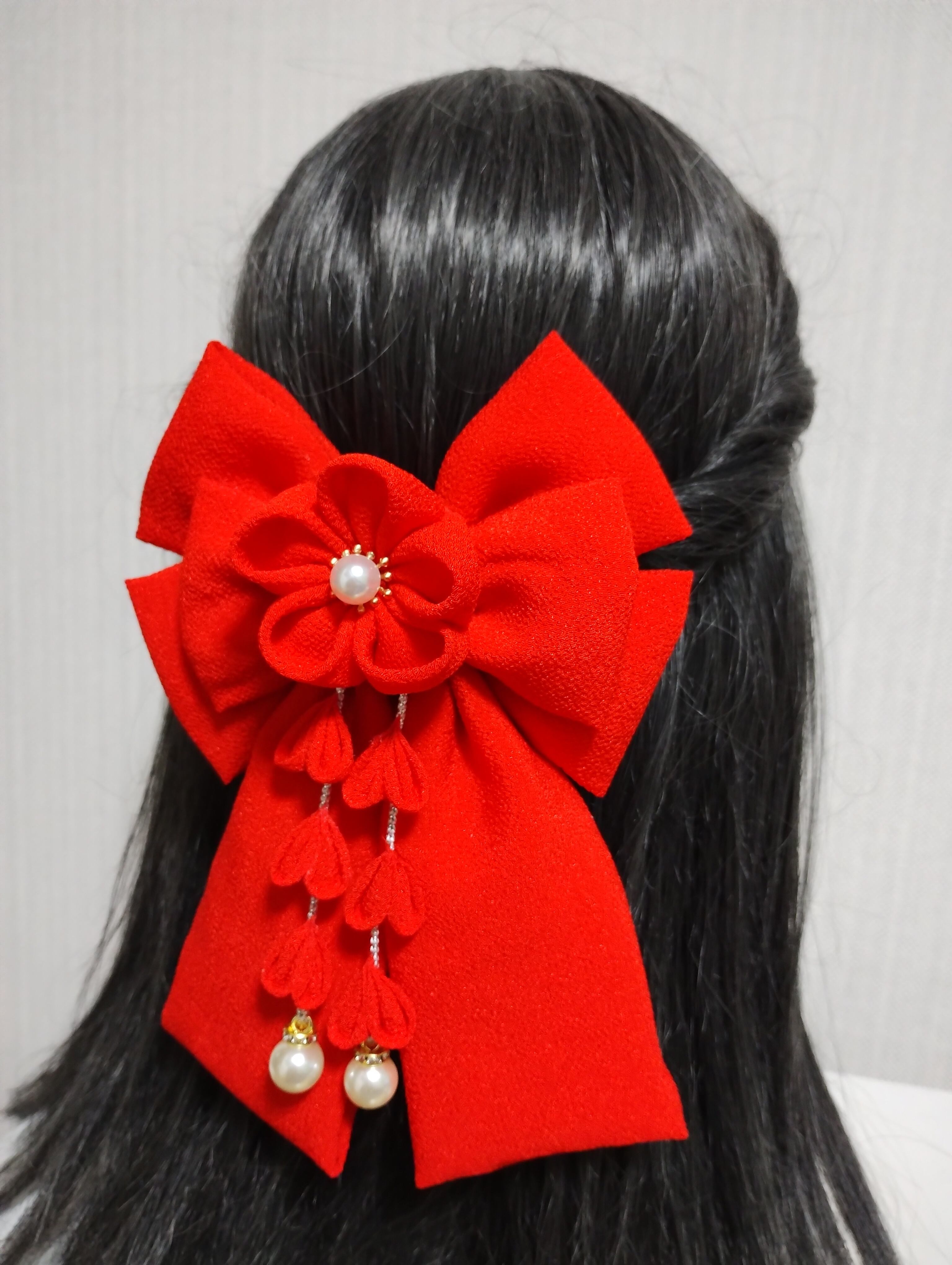 朱色の髪飾りがあなたの特別な日を彩ります。豪華なデザインのリボンが、成人式や卒園式、七五三などの特別な場面であなたのヘアスタイルを華やかに演出します。