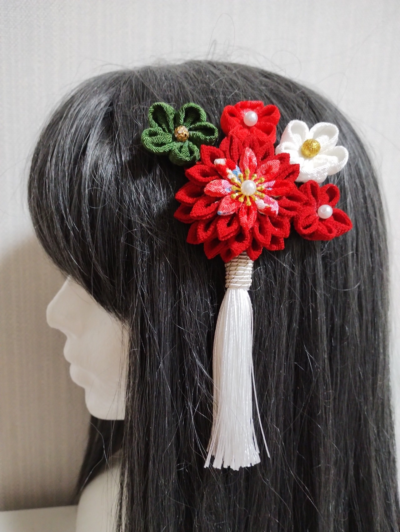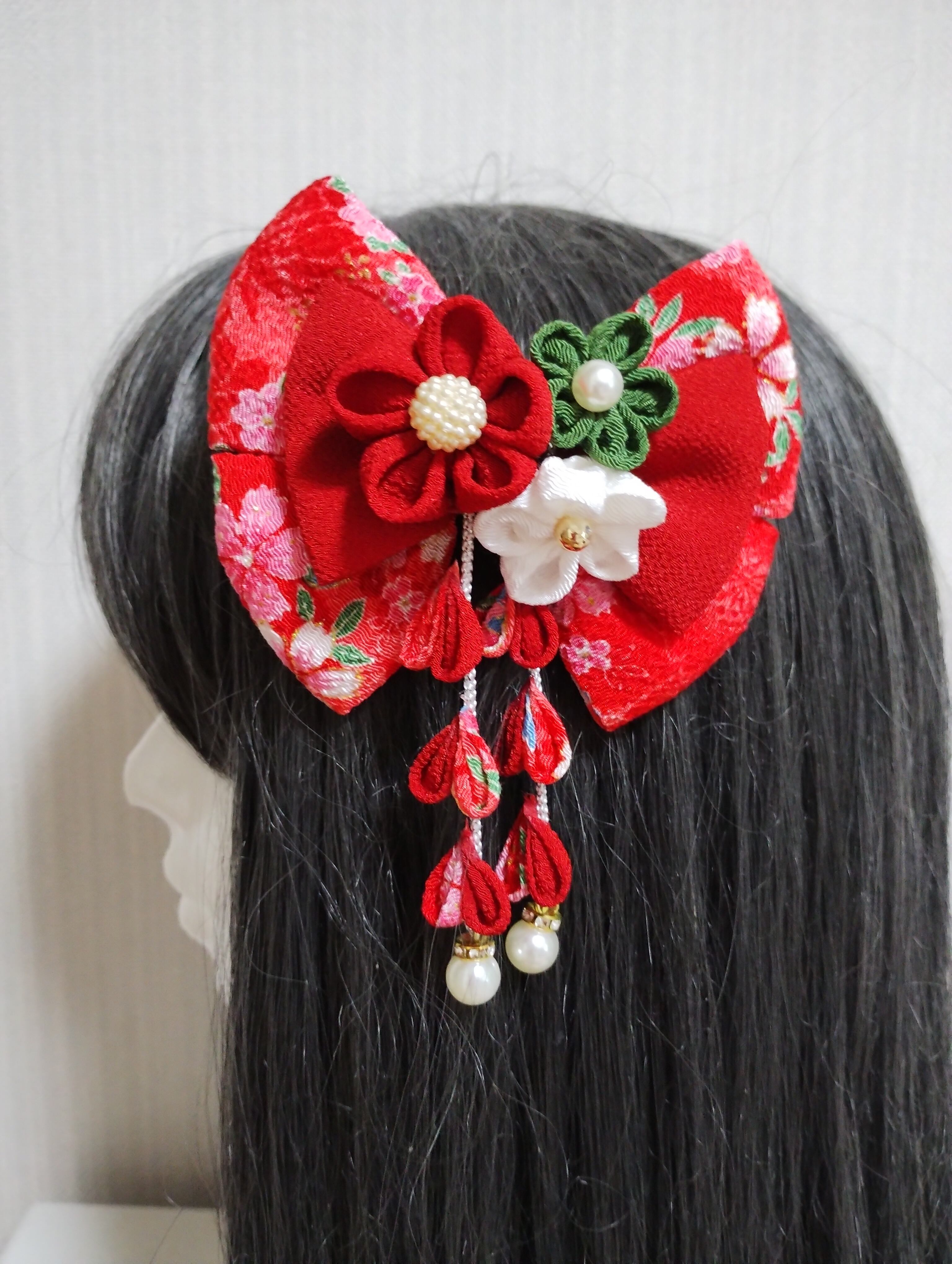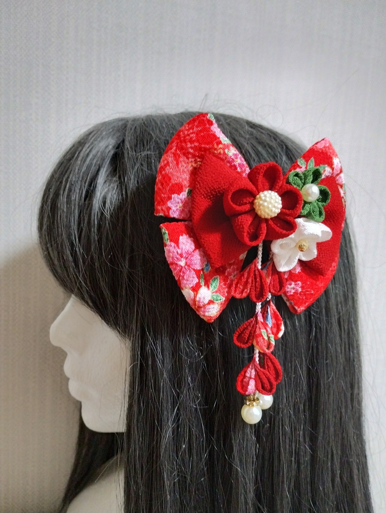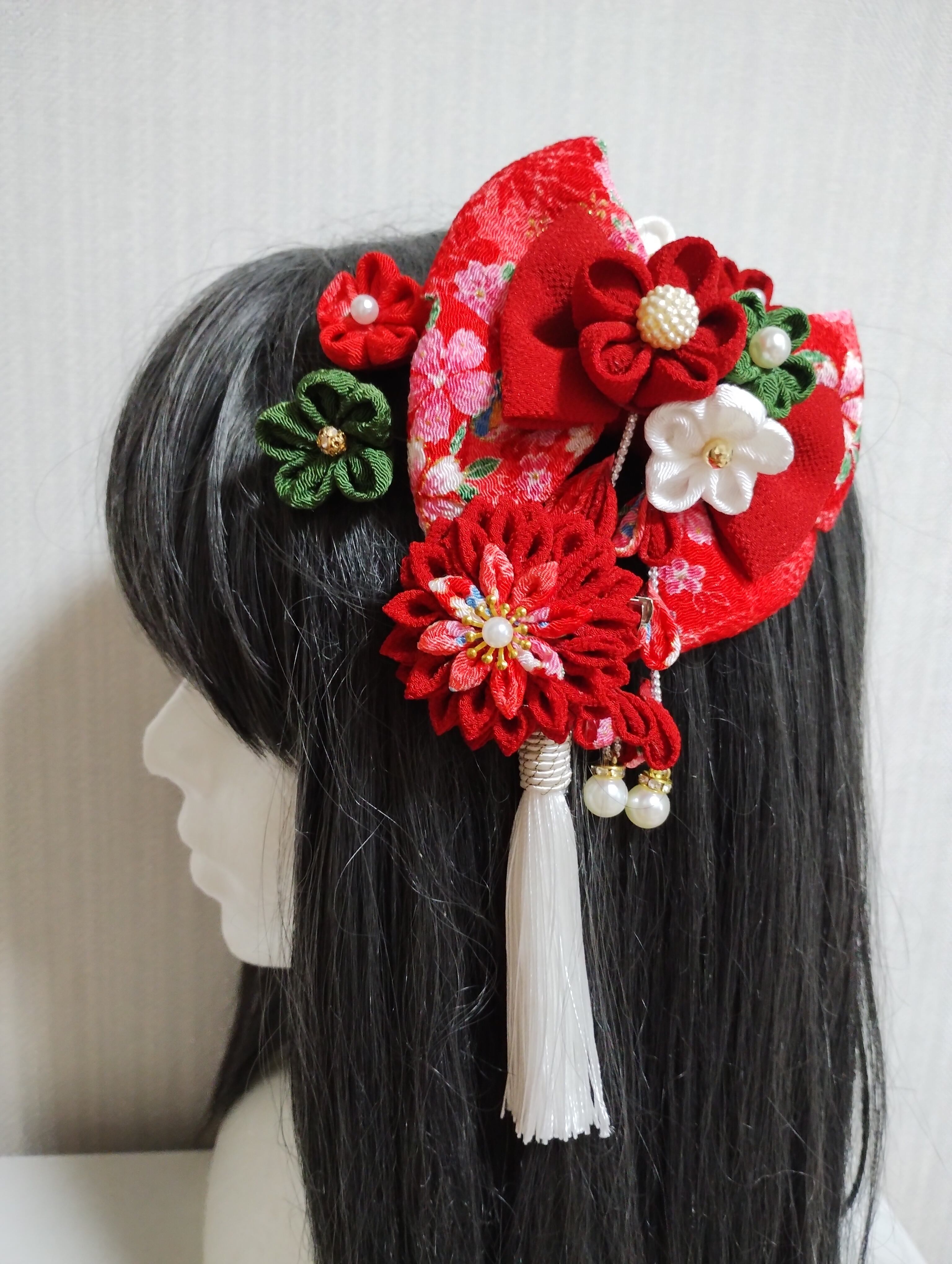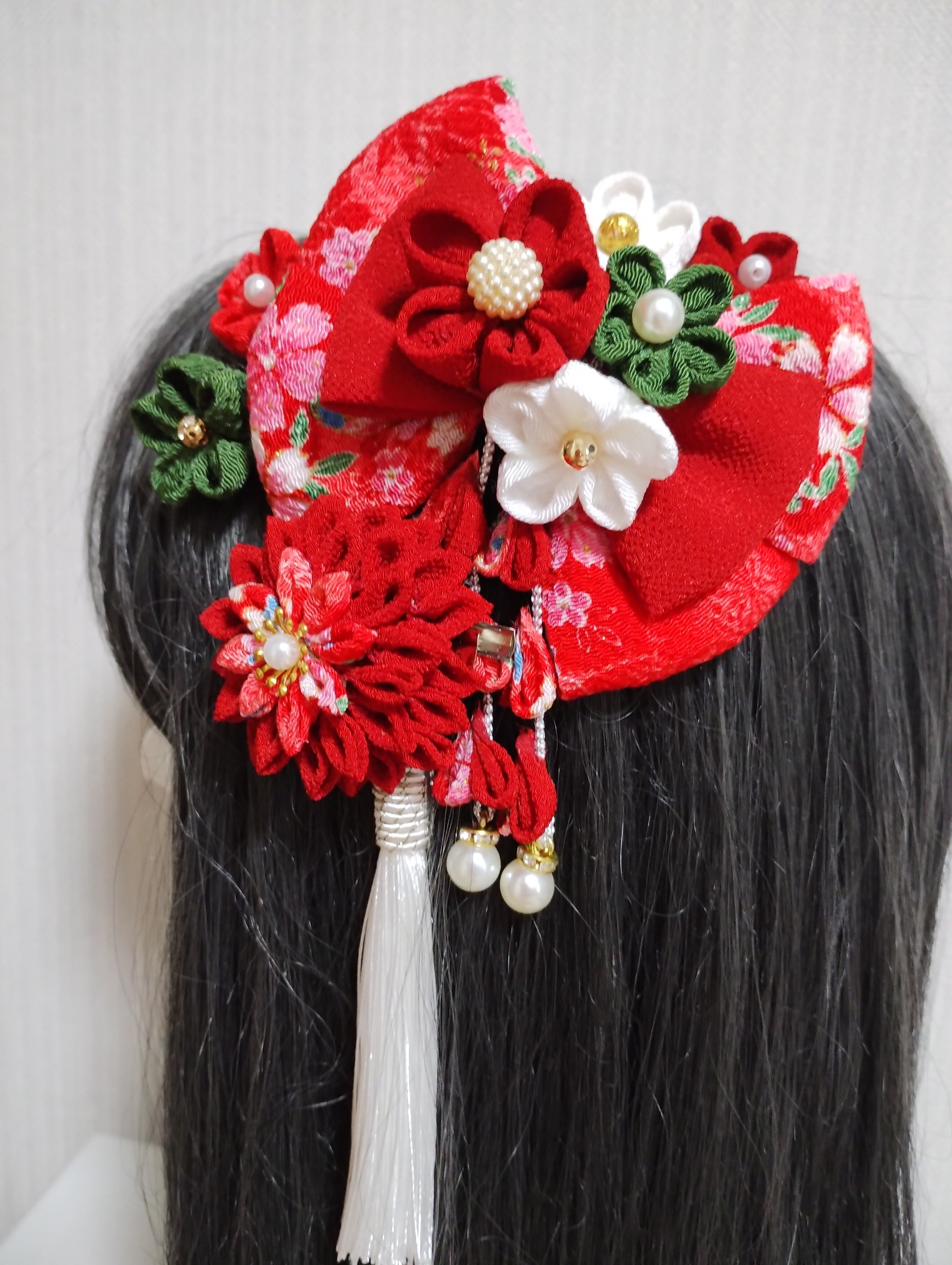 豪華で華やかな髪飾りが登場しました!赤いリボンがアクセントになった、成人式や卒業式、七五三にぴったりの髪飾りです。手作りのつまみ細工で、一つ一つ丁寧に作られています。繊細な装飾が施されたこの髪飾りは、着物やドレスとの相性も抜群です。挙式やパーティーなど特別な日に、華やかさを演出してくれること間違いなし!洗練されたデザインで、お祝い事のお供にぴったりです。