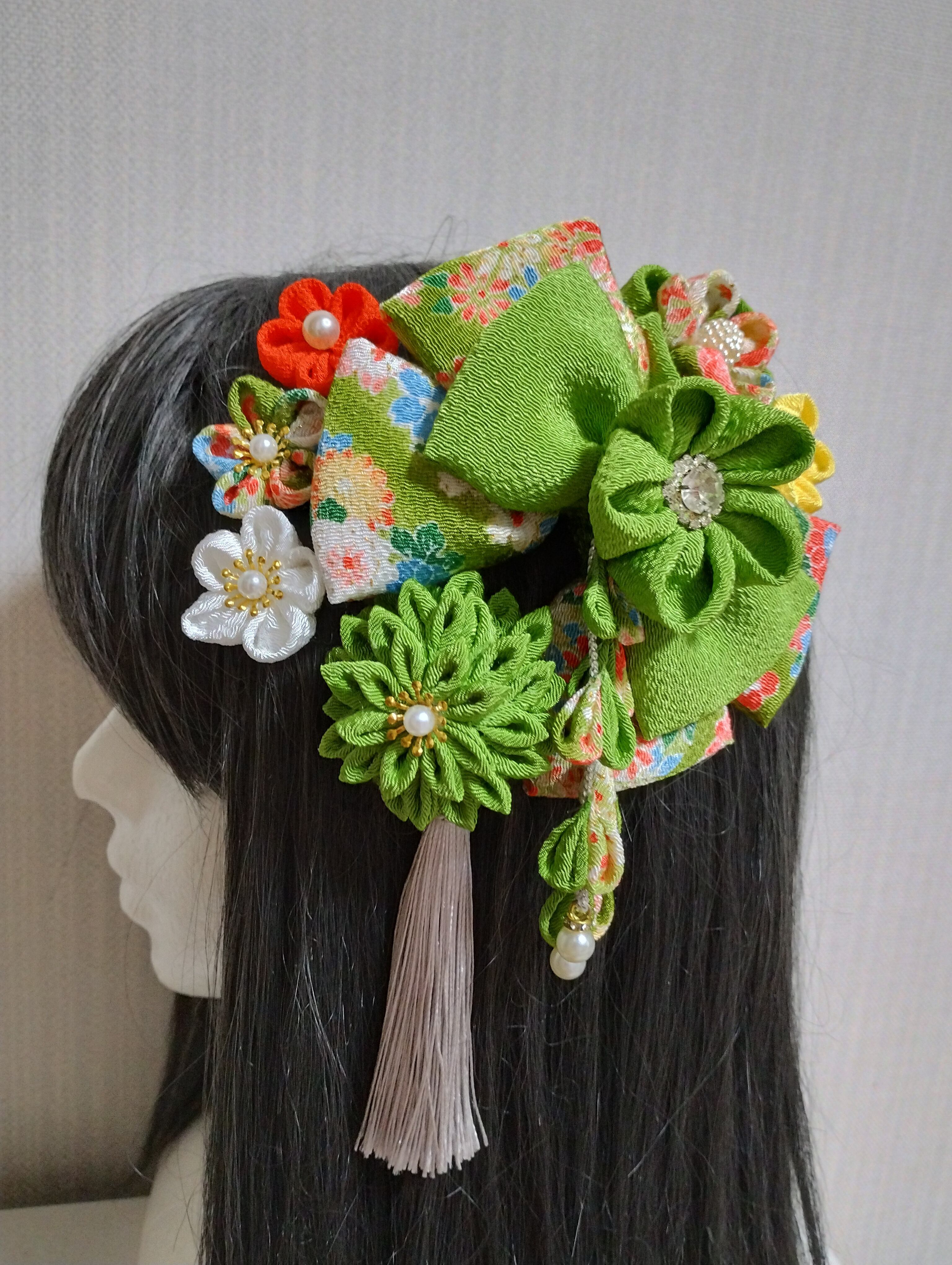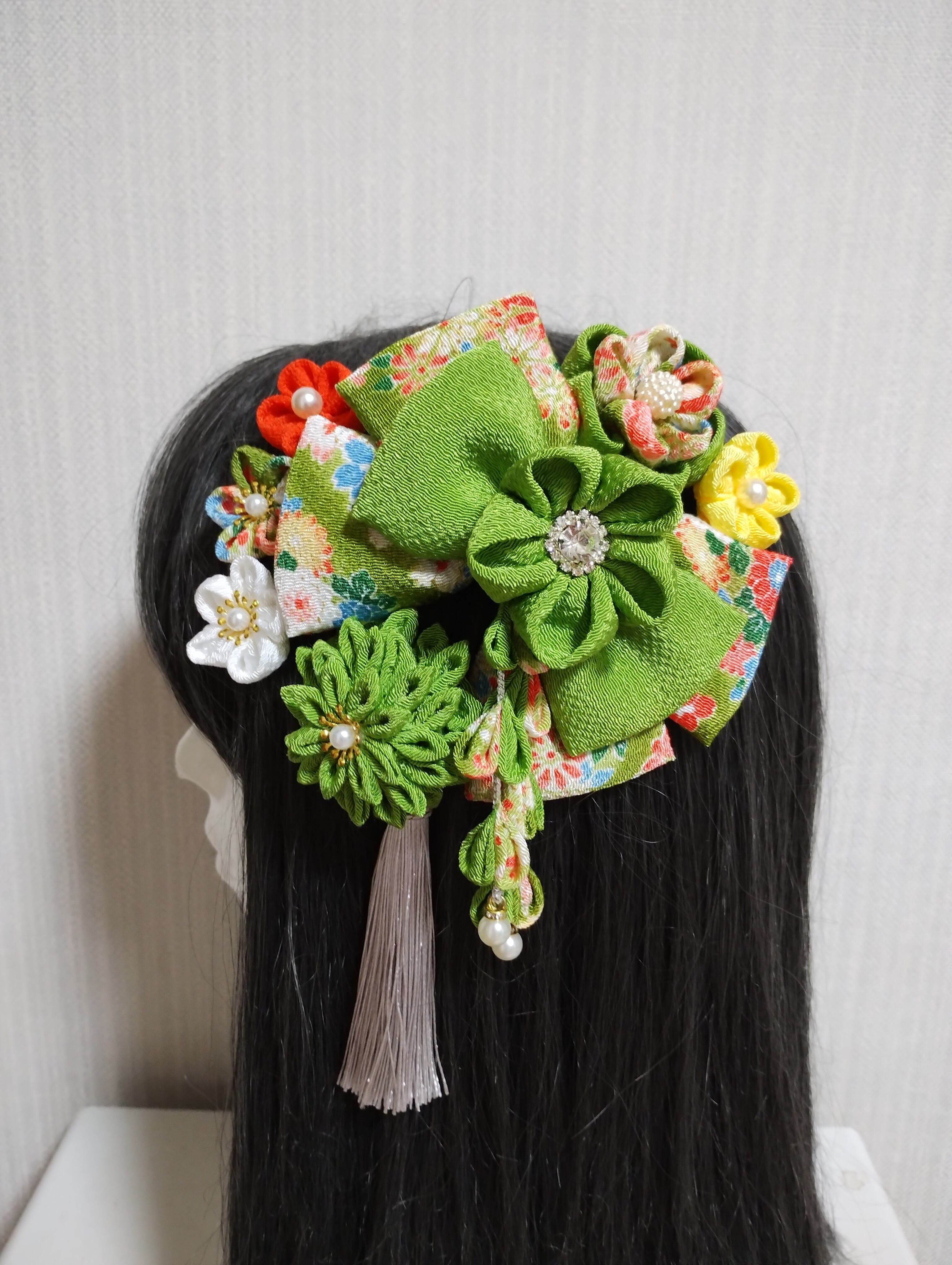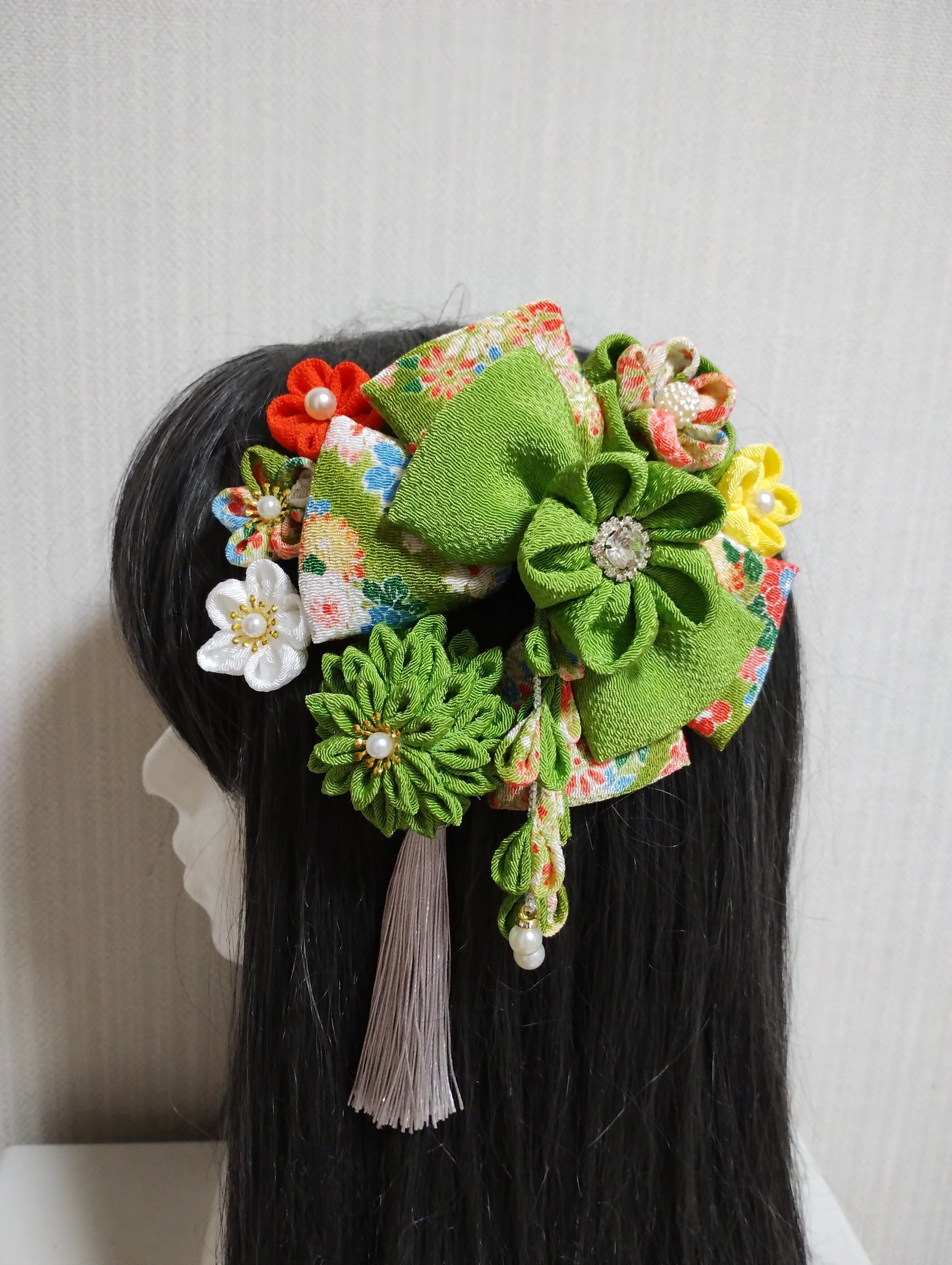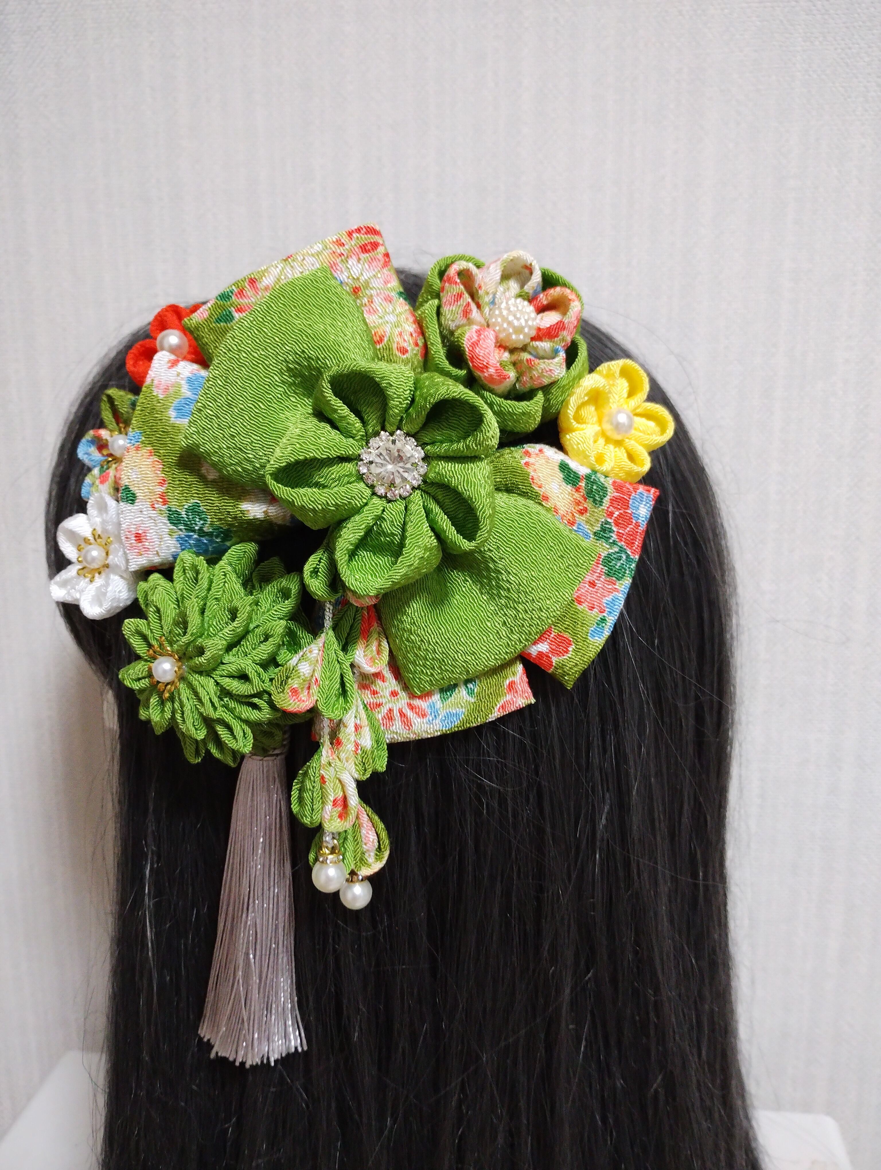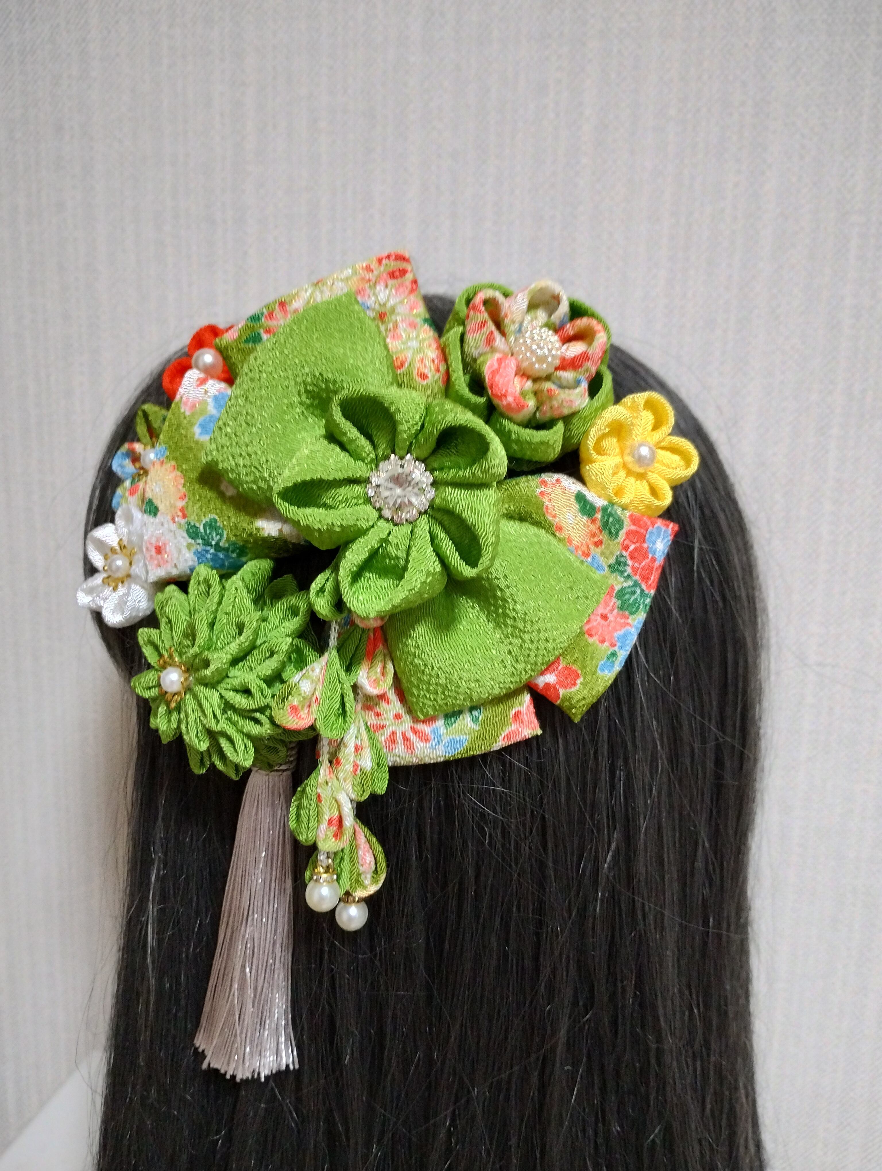 イキイキとした黄緑の色合いが目を惹く髪飾りです。成人式や卒業式、七五三などの特別な日にぴったりのアクセサリーです。手作りのつまみ細工で、繊細なリボンや花が織り成すデザインは華やかさを演出します。髪に留めるだけで、一気におしゃれ度がアップすること間違いなし!晴れやかな日を彩る、特別な一日を演出してくれるアイテムです。