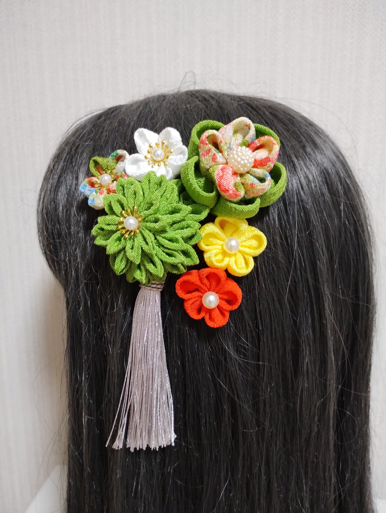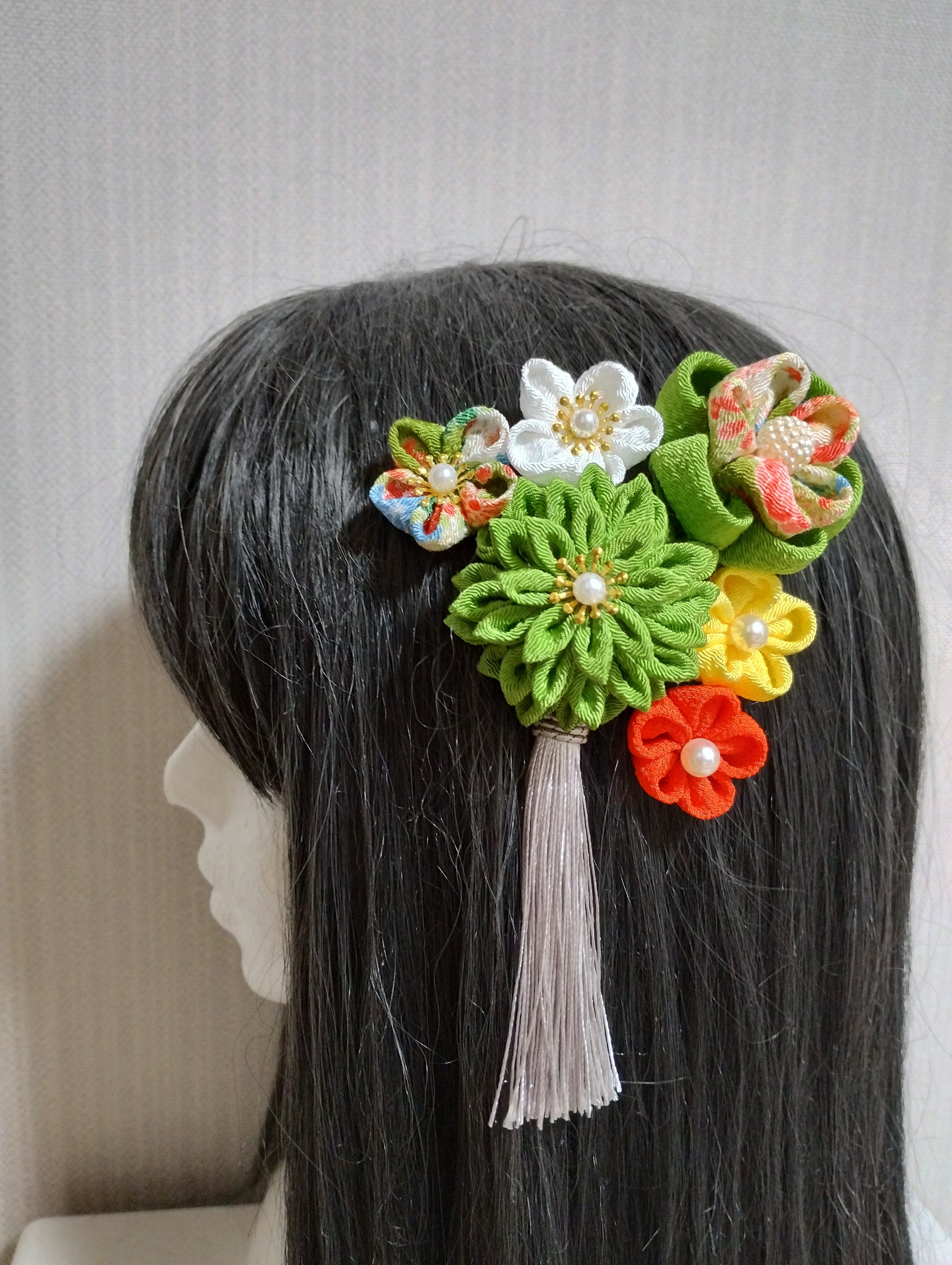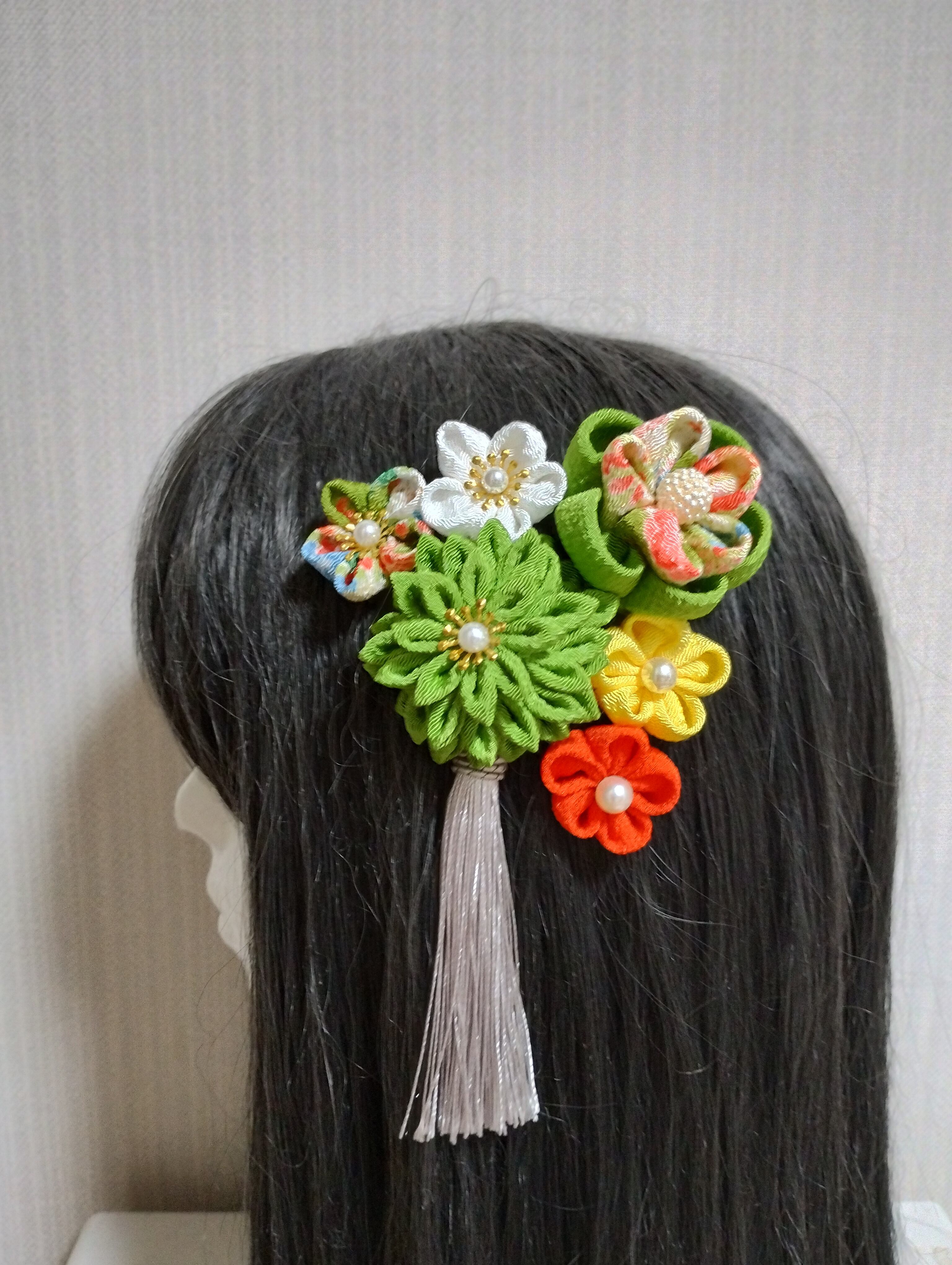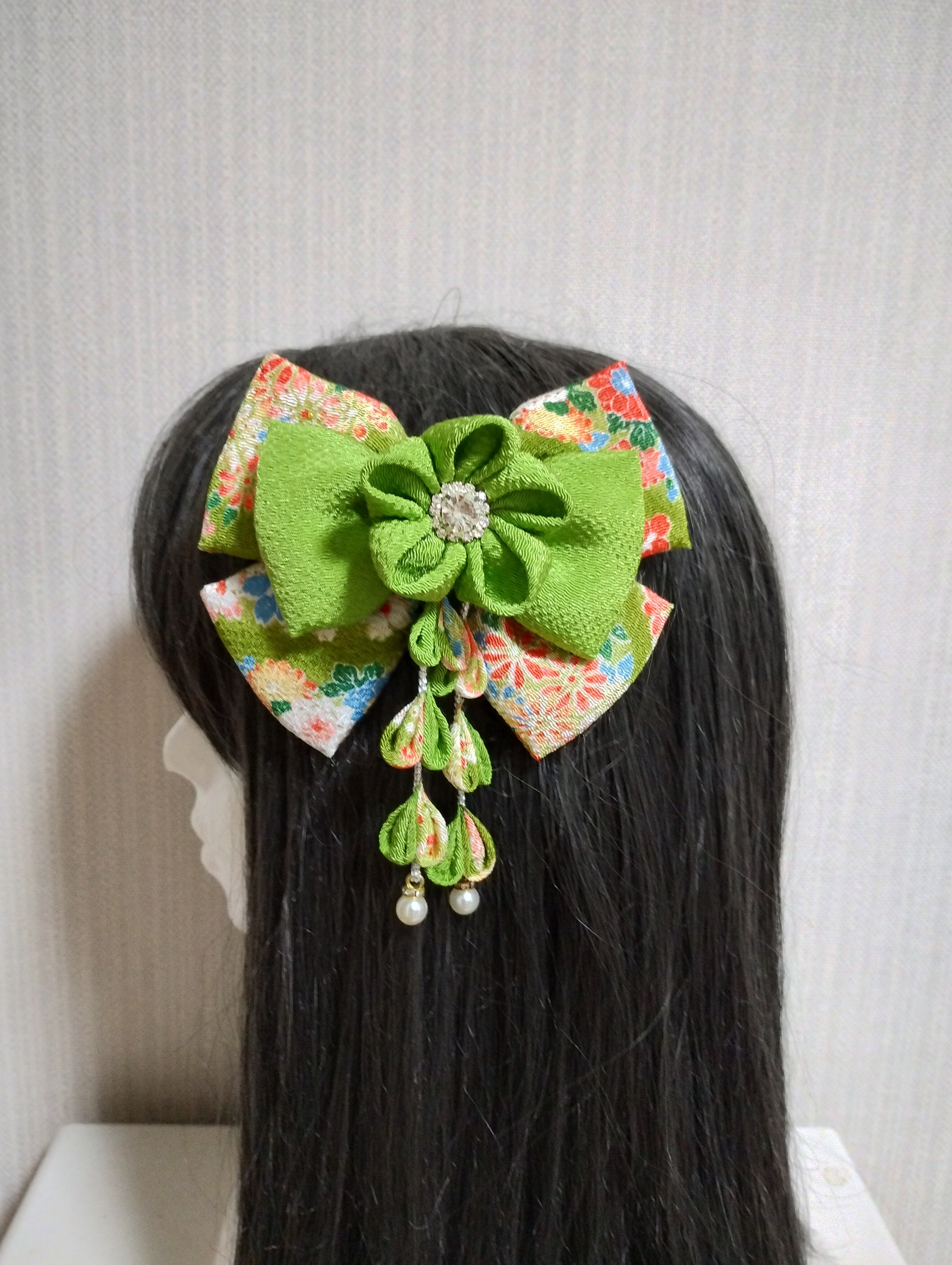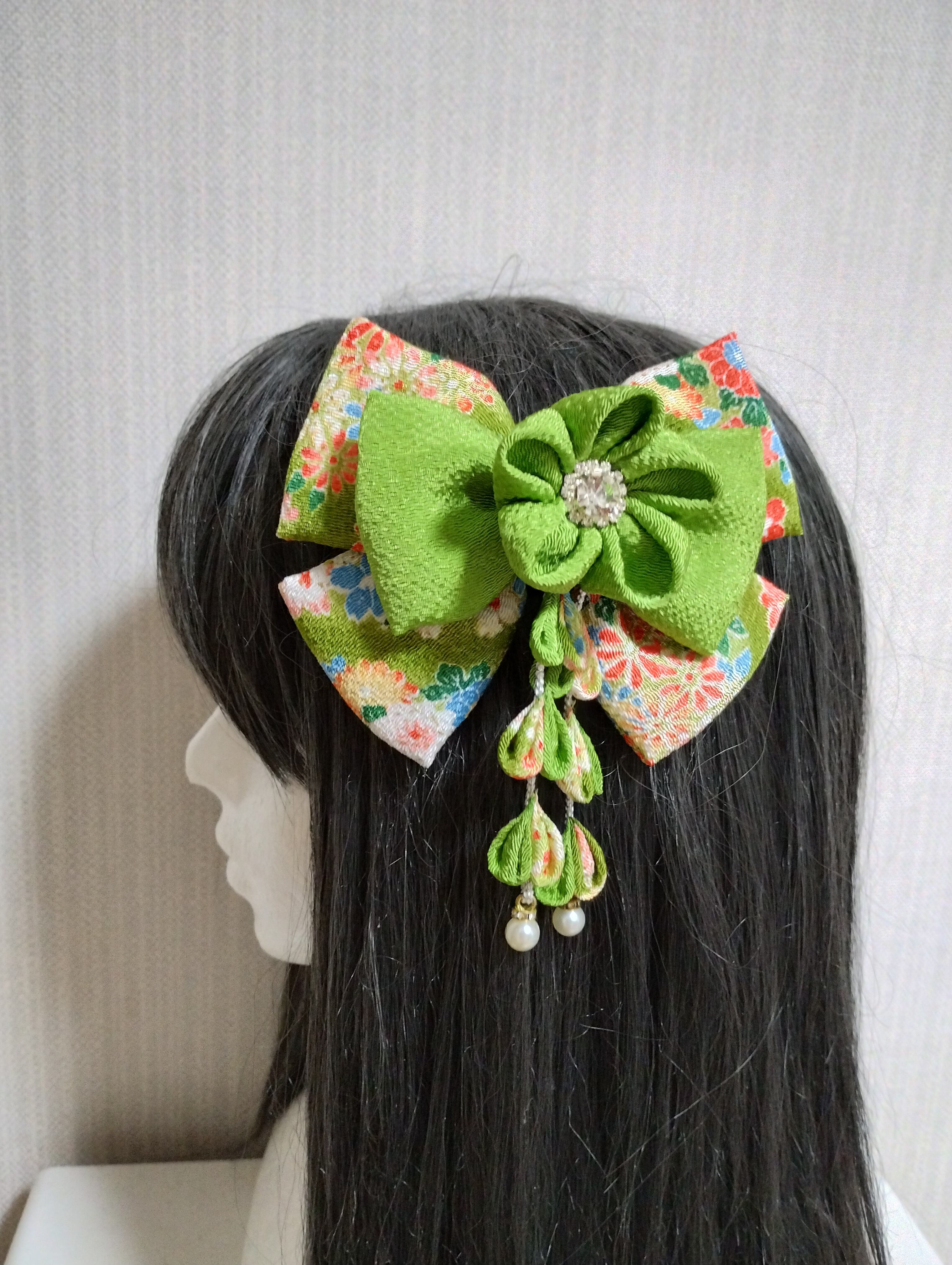 イキイキとした黄緑の色合いが目を惹く髪飾りです。成人式や卒業式、七五三などの特別な日にぴったりのアクセサリーです。手作りのつまみ細工で、繊細なリボンや花が織り成すデザインは華やかさを演出します。髪に留めるだけで、一気におしゃれ度がアップすること間違いなし!晴れやかな日を彩る、特別な一日を演出してくれるアイテムです。