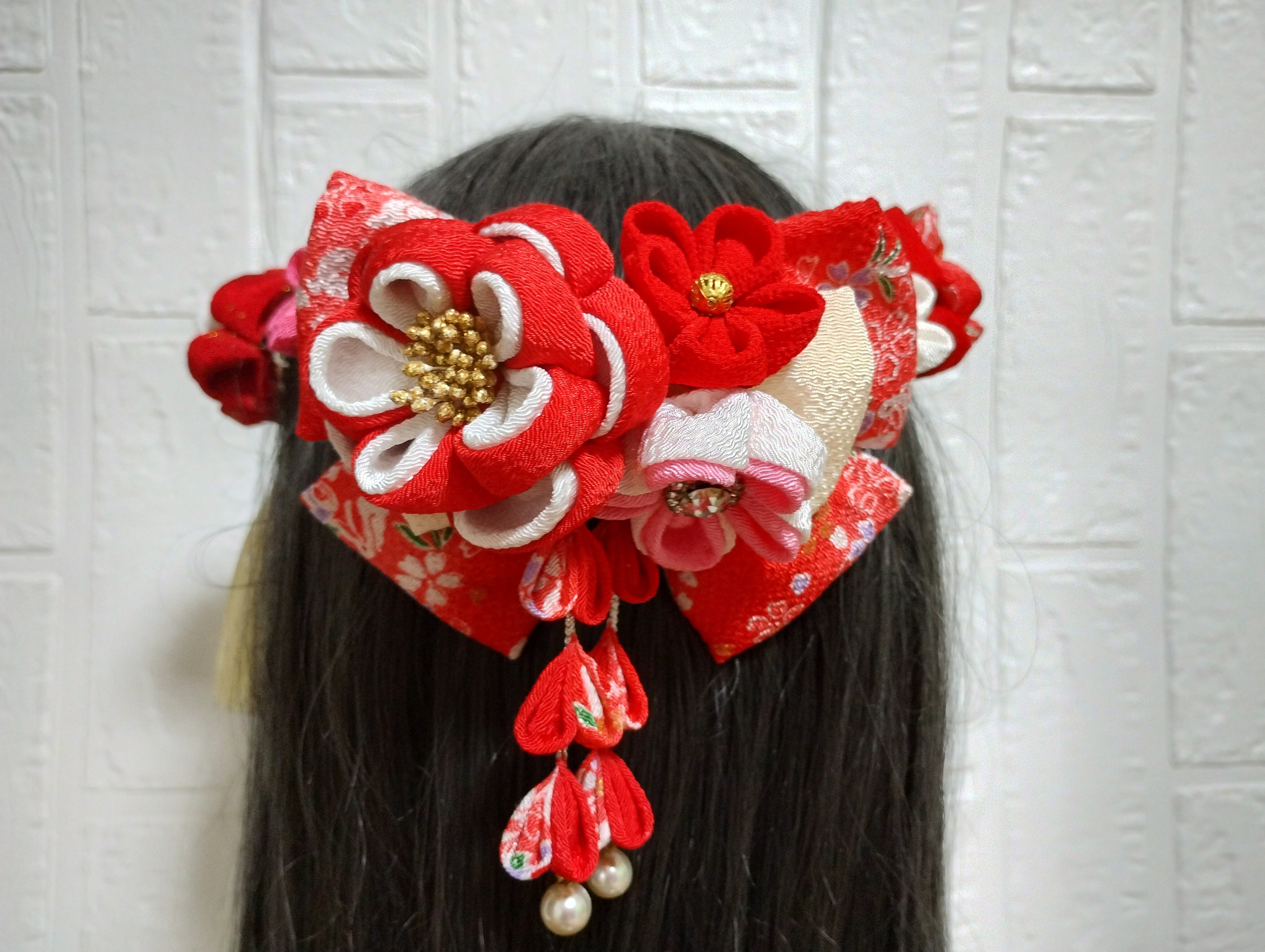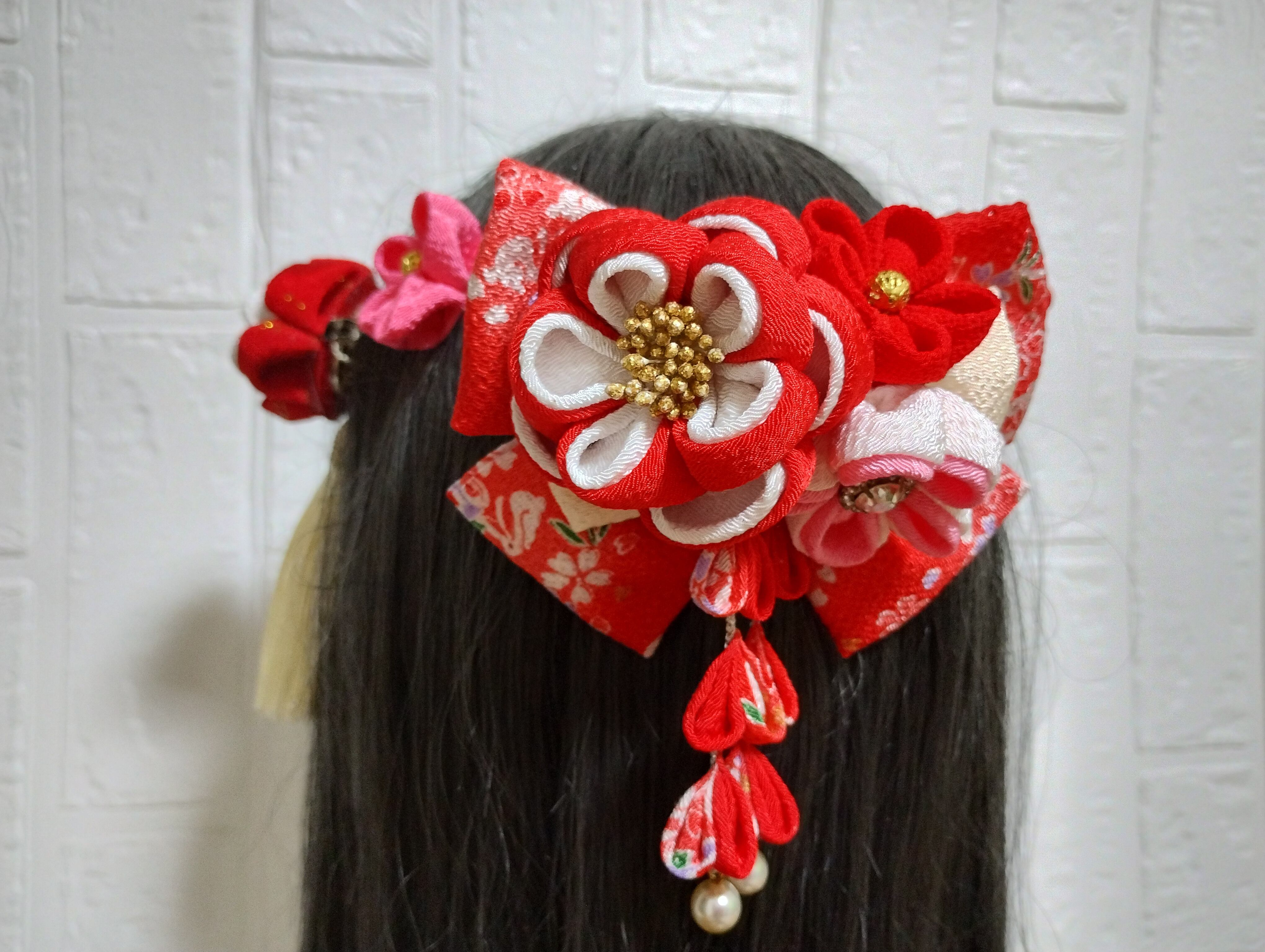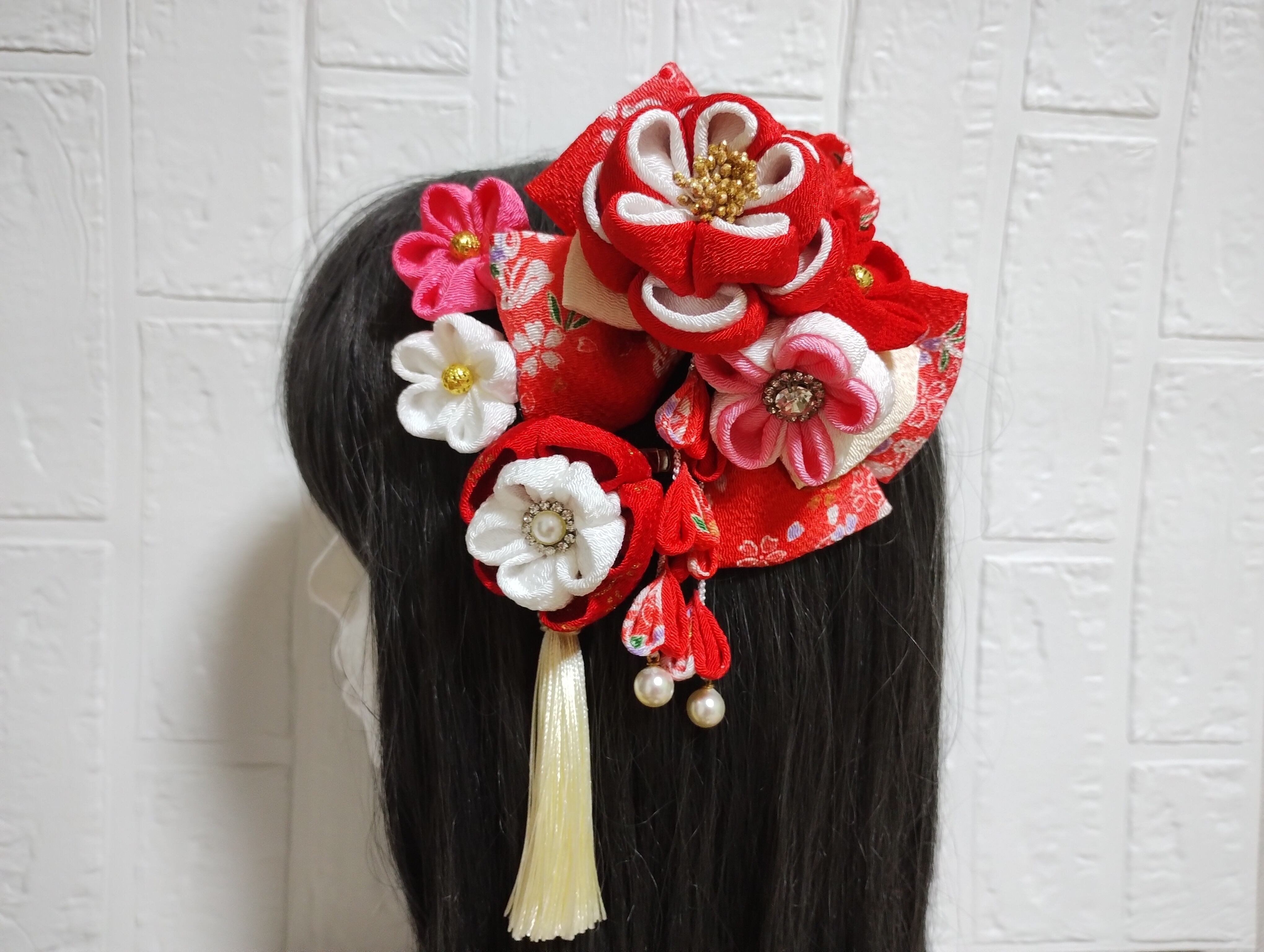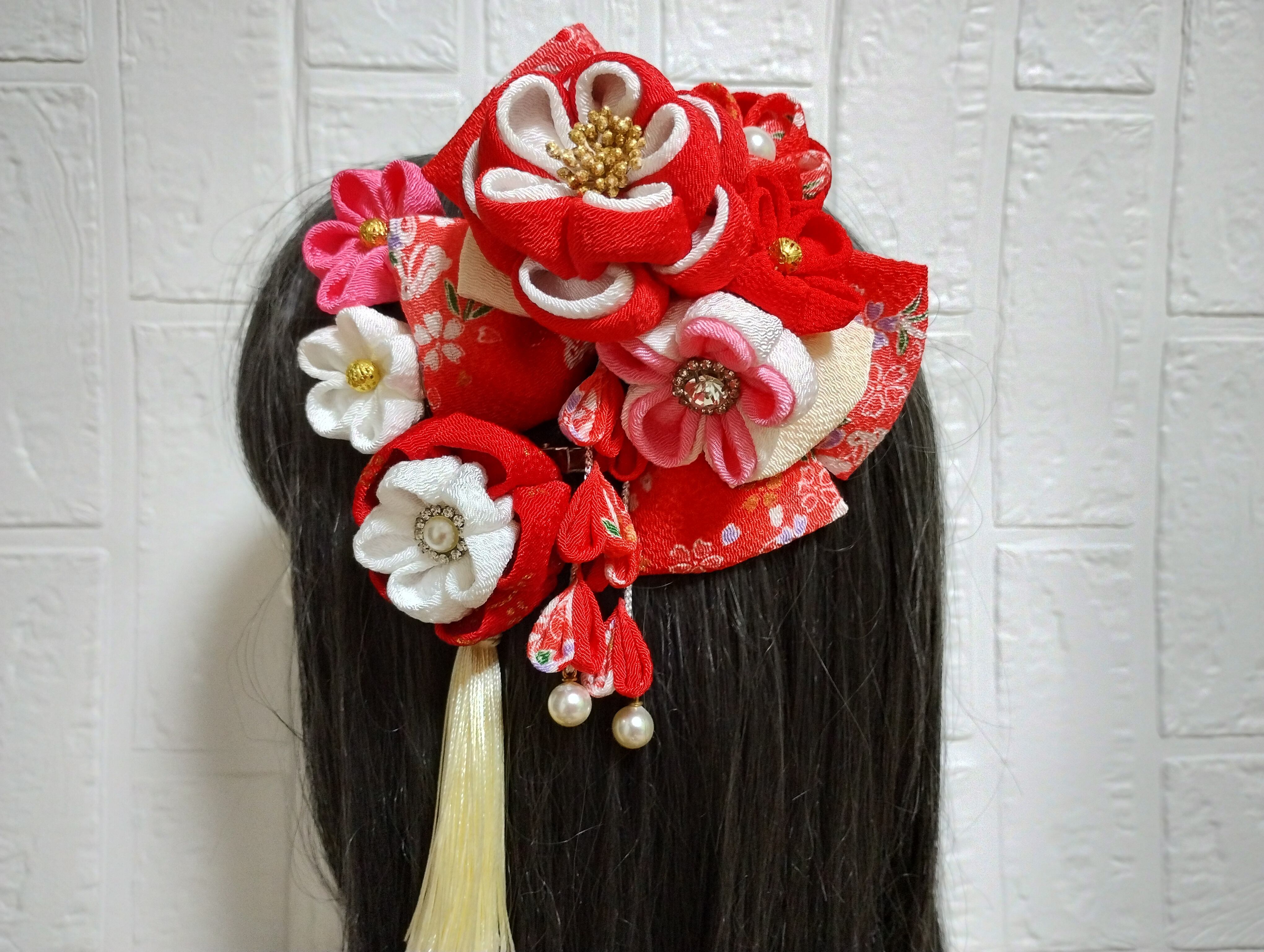 豪華なつまみ細工の髪飾りが新登場!華やかな装いが必要な特別な日にピッタリな一品です。赤いリボンが華やかさを引き立て、着物やワンピースとの相性も抜群!成人式や卒業式、七五三、そして袴姿にも相性抜群です。手作りの温かみが感じられる丁寧なつまみ細工は、まるで花束のような髪飾りがあなたのスタイルを一層引き立てます。