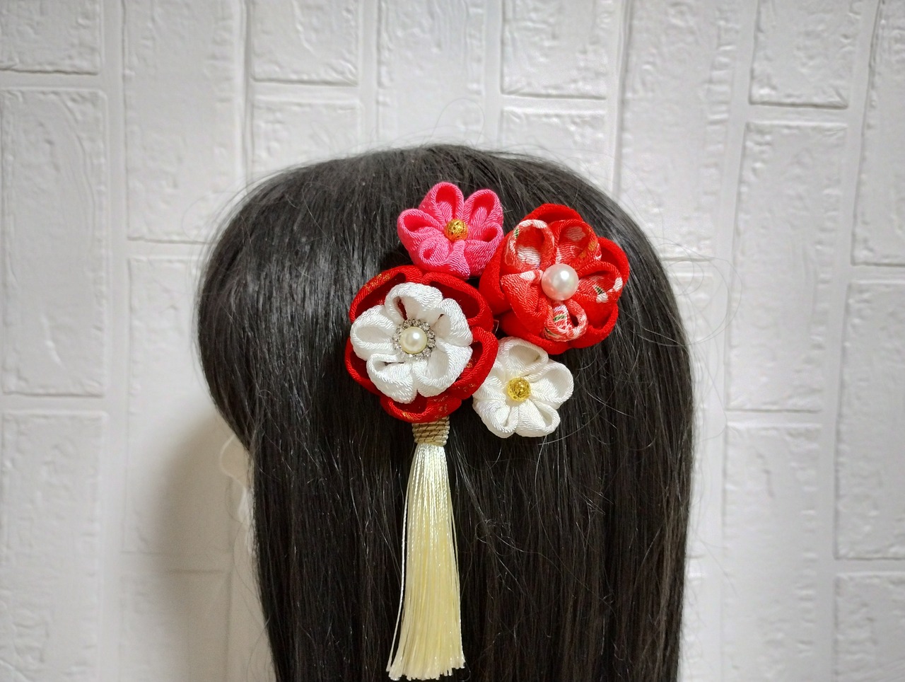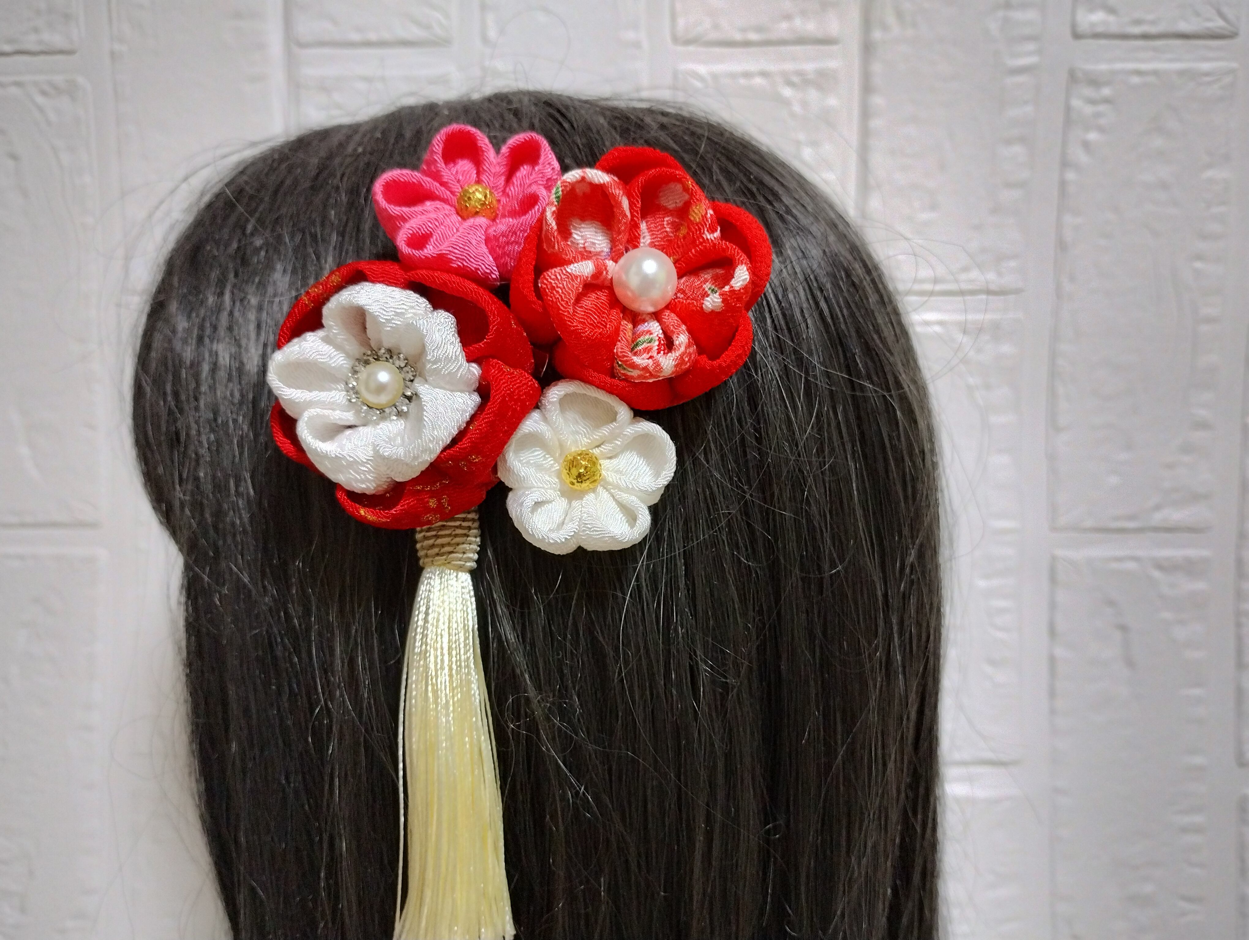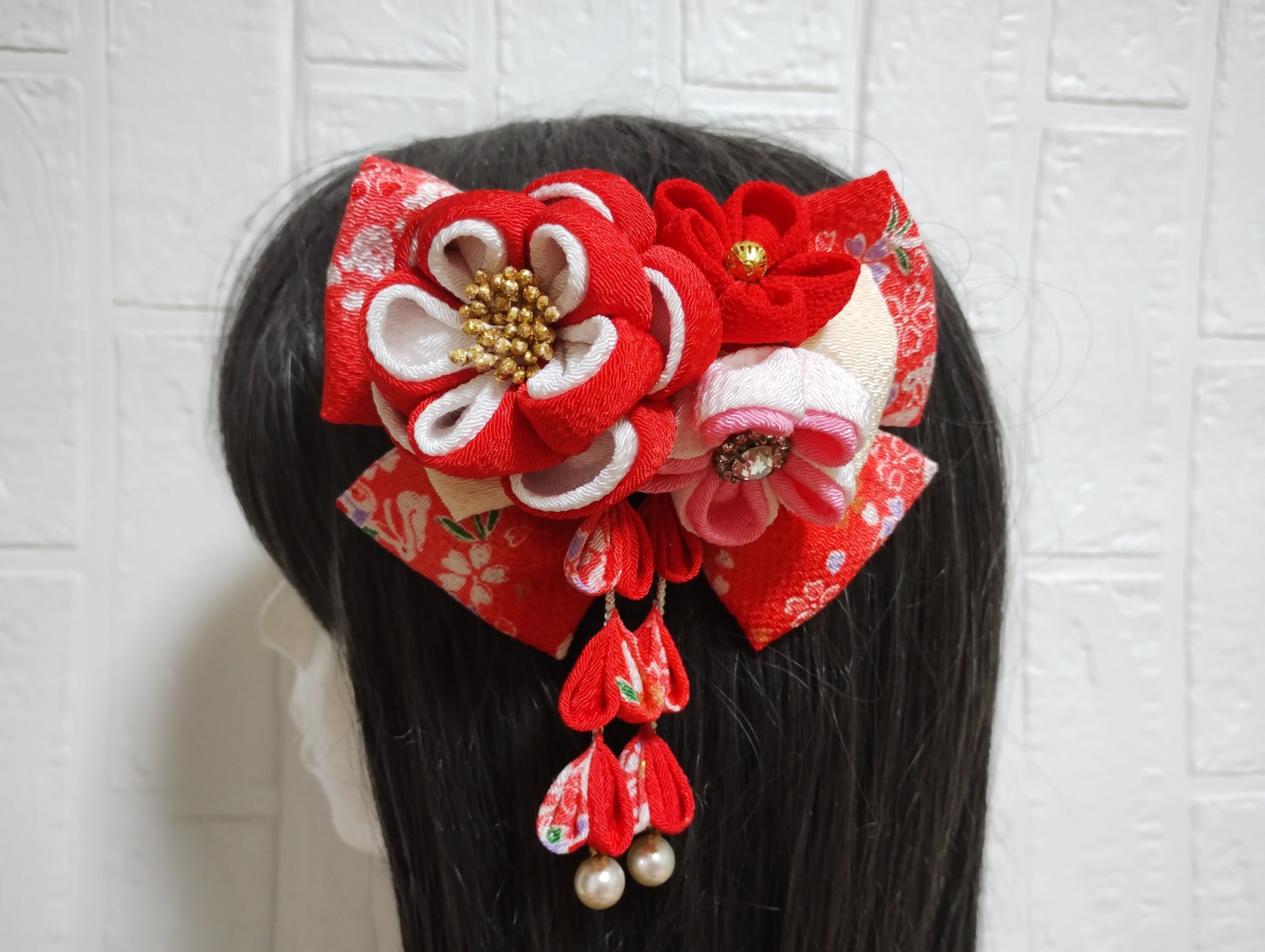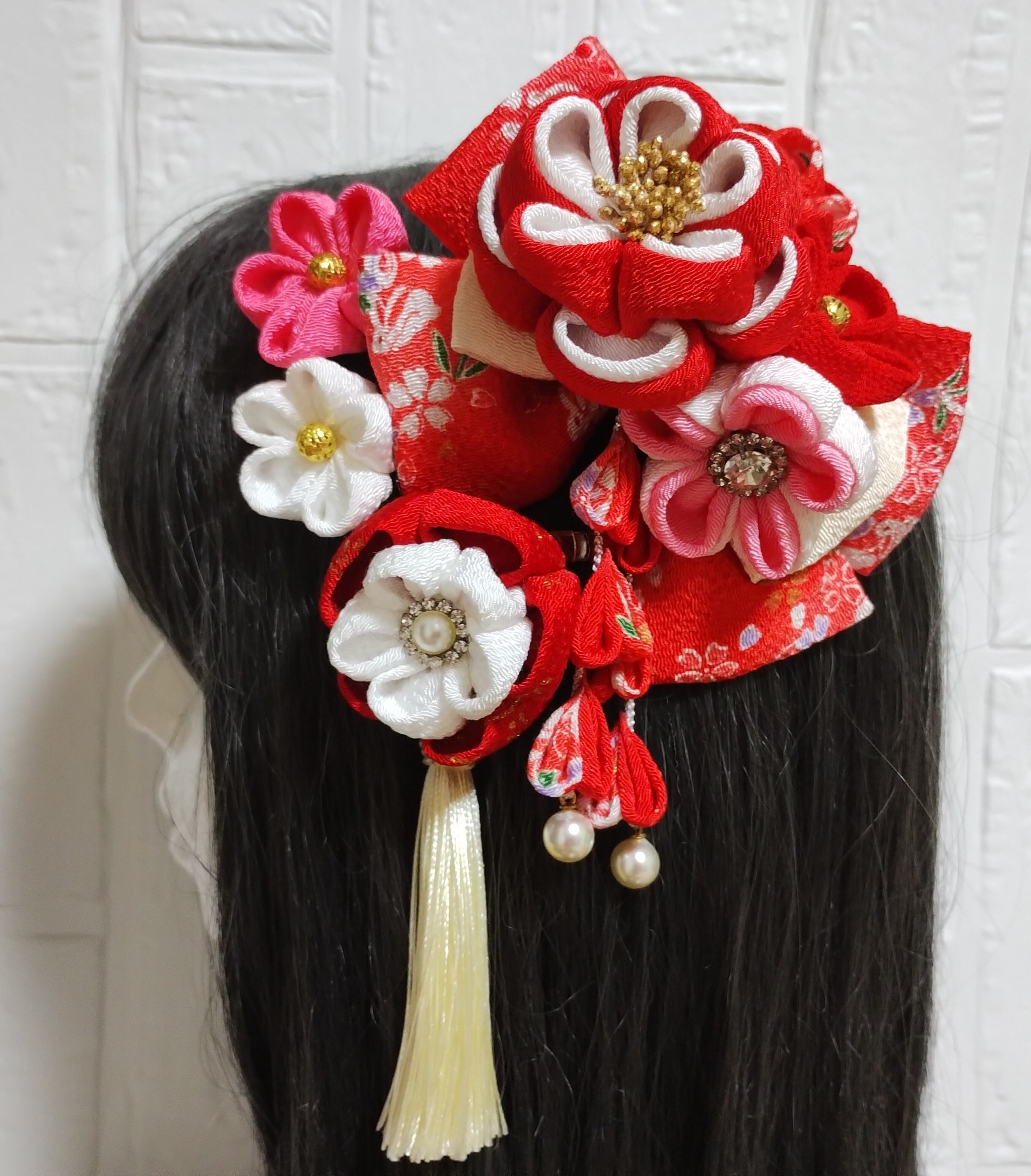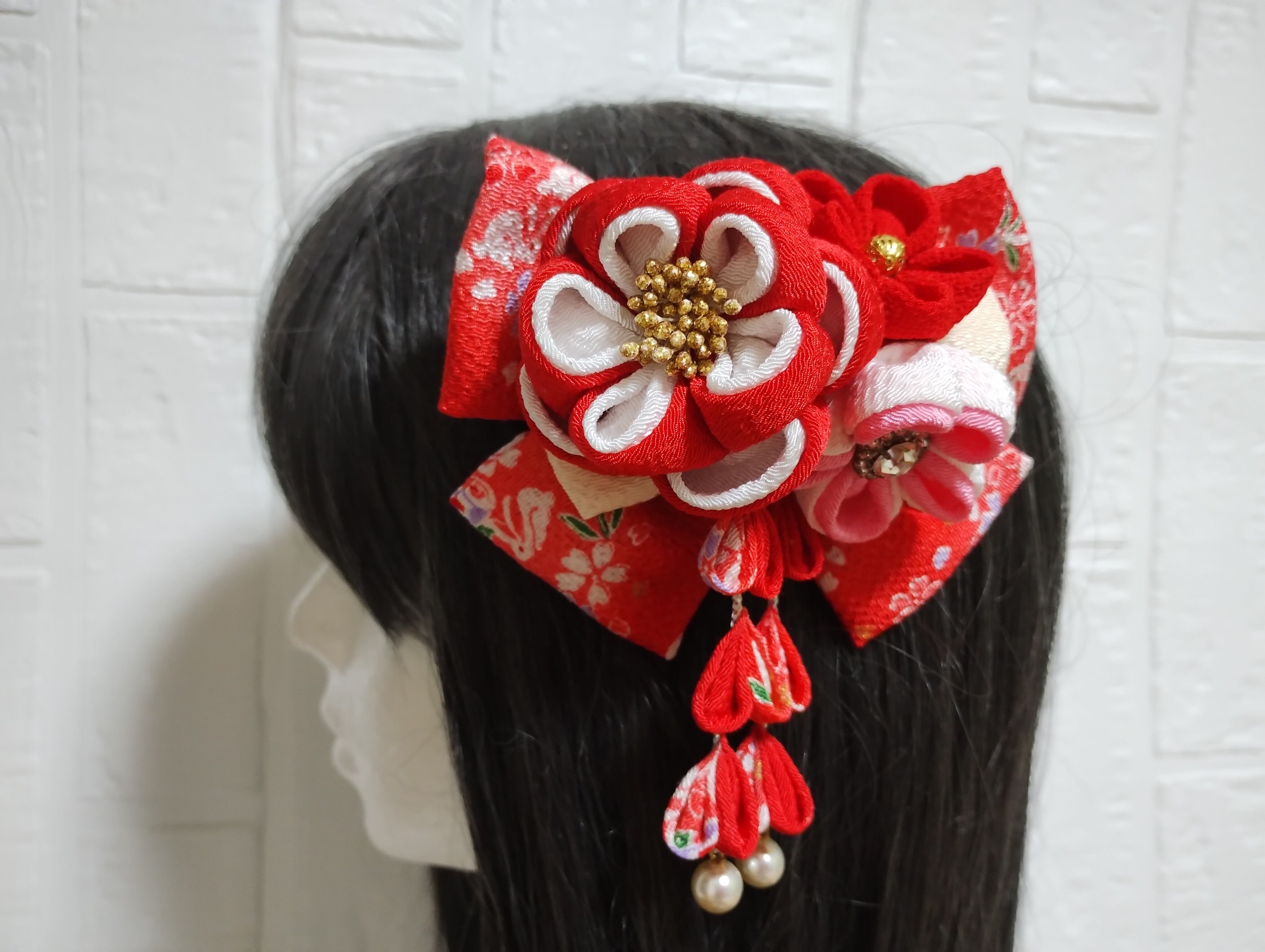 豪華なつまみ細工の髪飾りが新登場!華やかな装いが必要な特別な日にピッタリな一品です。赤いリボンが華やかさを引き立て、着物やワンピースとの相性も抜群!成人式や卒業式、七五三、そして袴姿にも相性抜群です。手作りの温かみが感じられる丁寧なつまみ細工は、まるで花束のような髪飾りがあなたのスタイルを一層引き立てます。