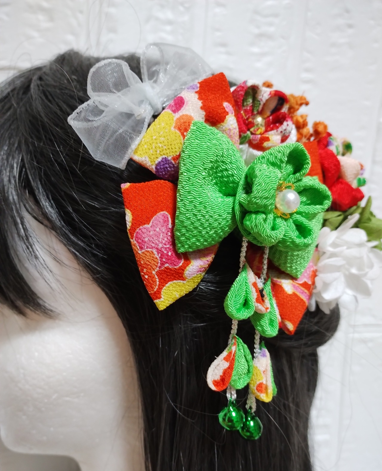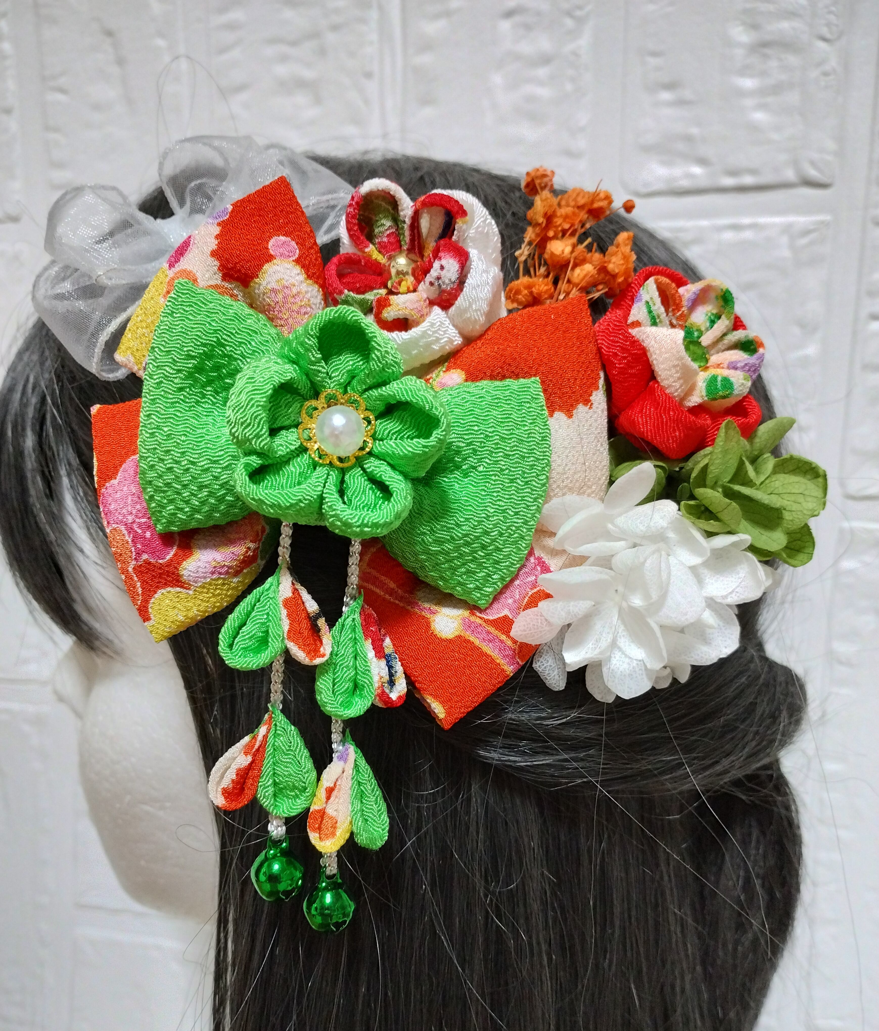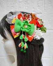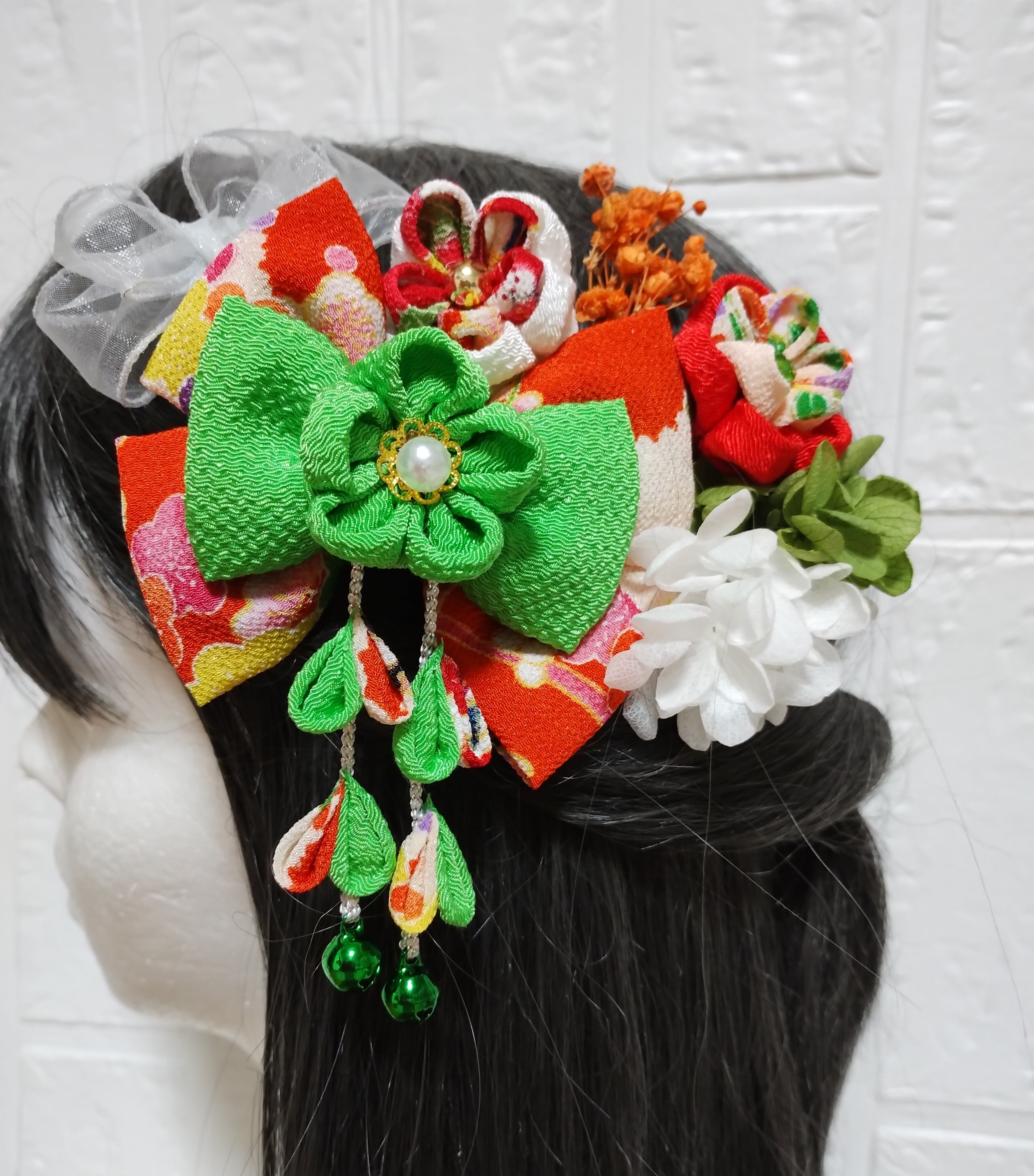 髪飾りオレンジ、黄緑色のリボンが可愛らしい七五三髪飾り。大切な日のための特別なアクセサリーです。帯に着せるプチプチ刺繍つまみ細工髪飾りで、華やかな装いを演出します。七五三、成人式、卒業式などのお祝い事にぴったりのアイテムです。手作りで丁寧に作られた一品で、存在感があります。髪を上品に彩り、記憶に残る日にしてくれますよ。大切な日のためのオシャレなアクセサリーを是非、ご利用ください。