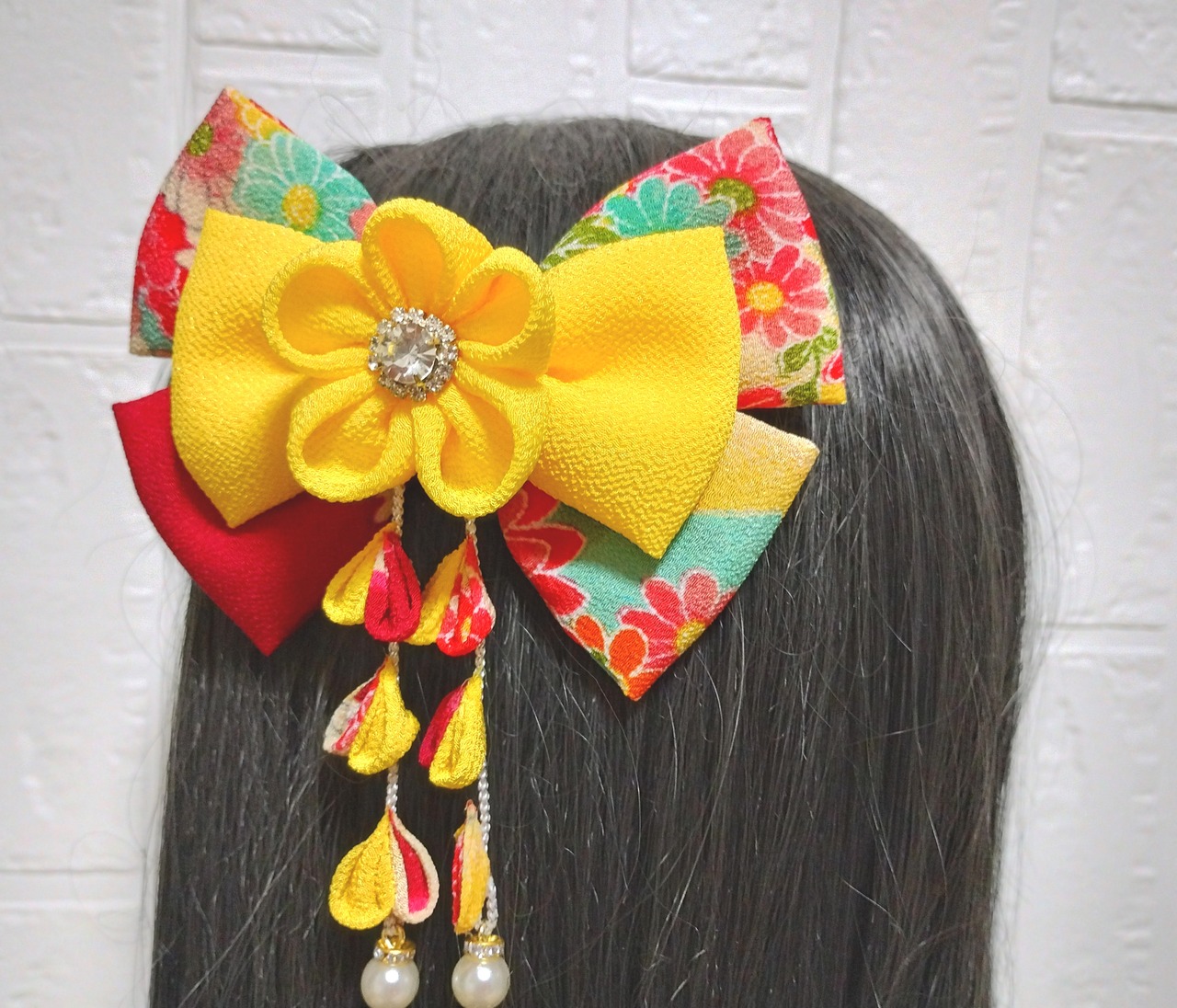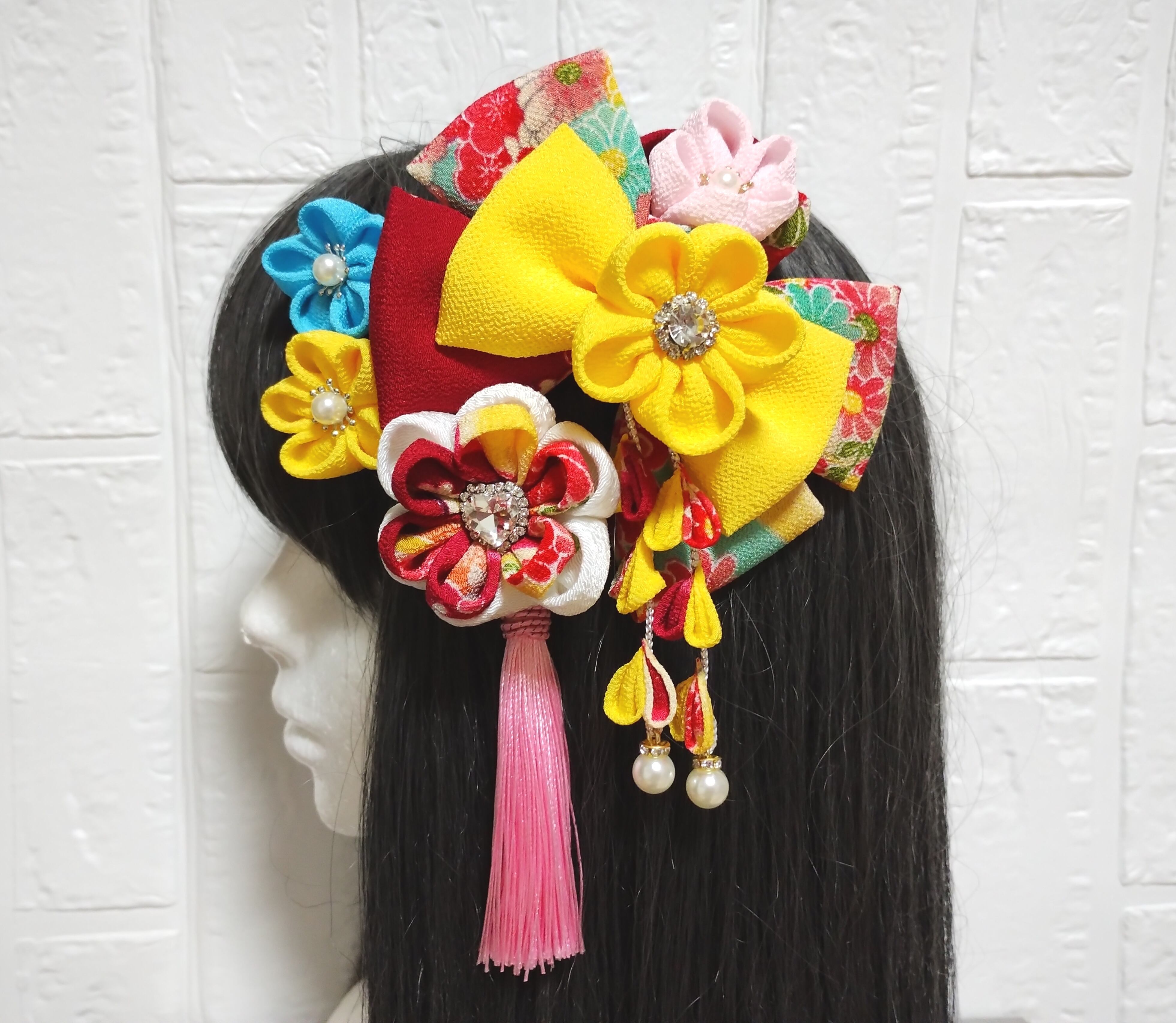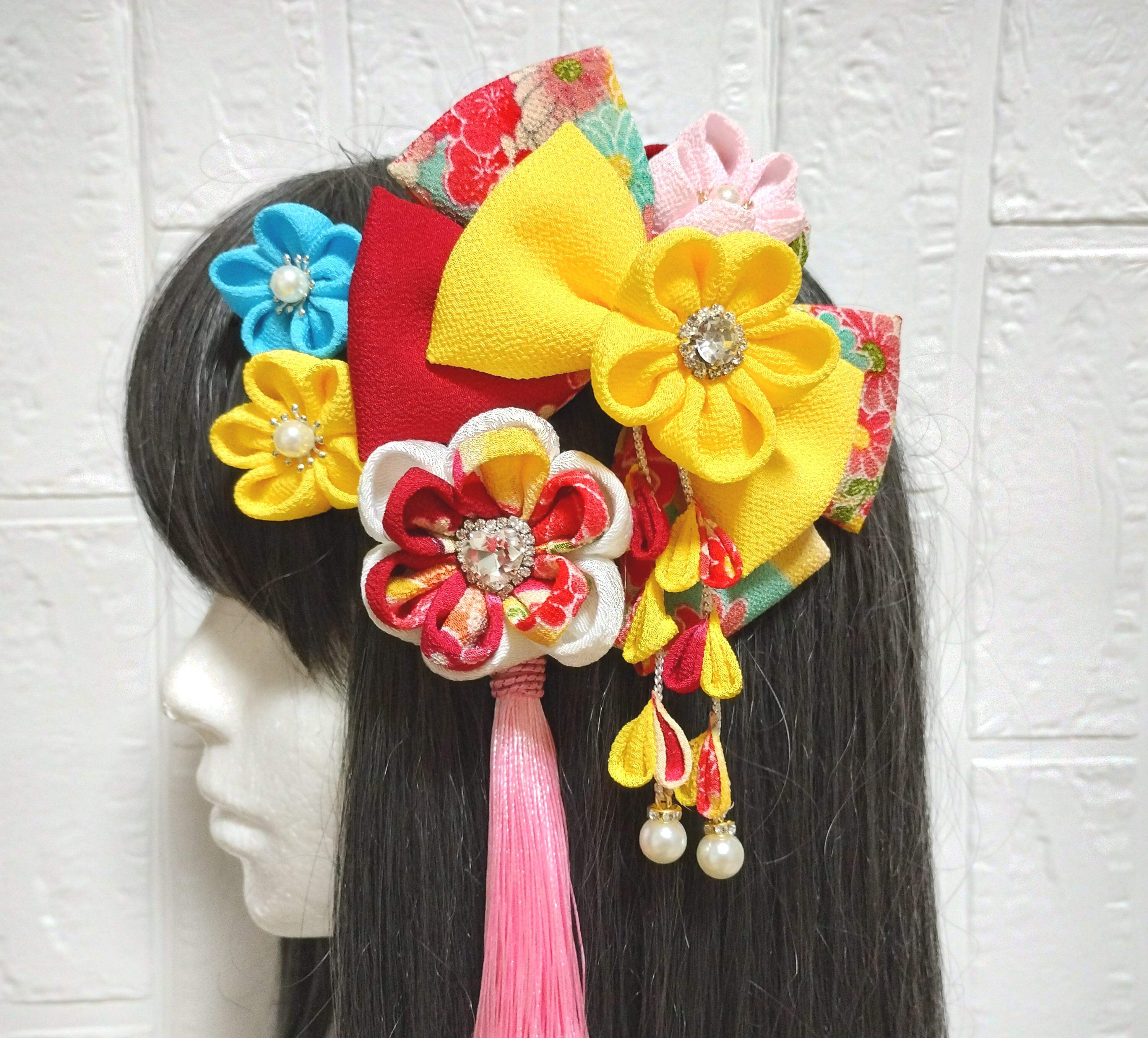 こちらは華やかなリボンと繊細なつまみ細工で作られた髪飾りです!ピンクやイエローのカラーが楽しめ、成人式や卒業式、七五三など特別な日の装いにピッタリなアイテムとなっています。