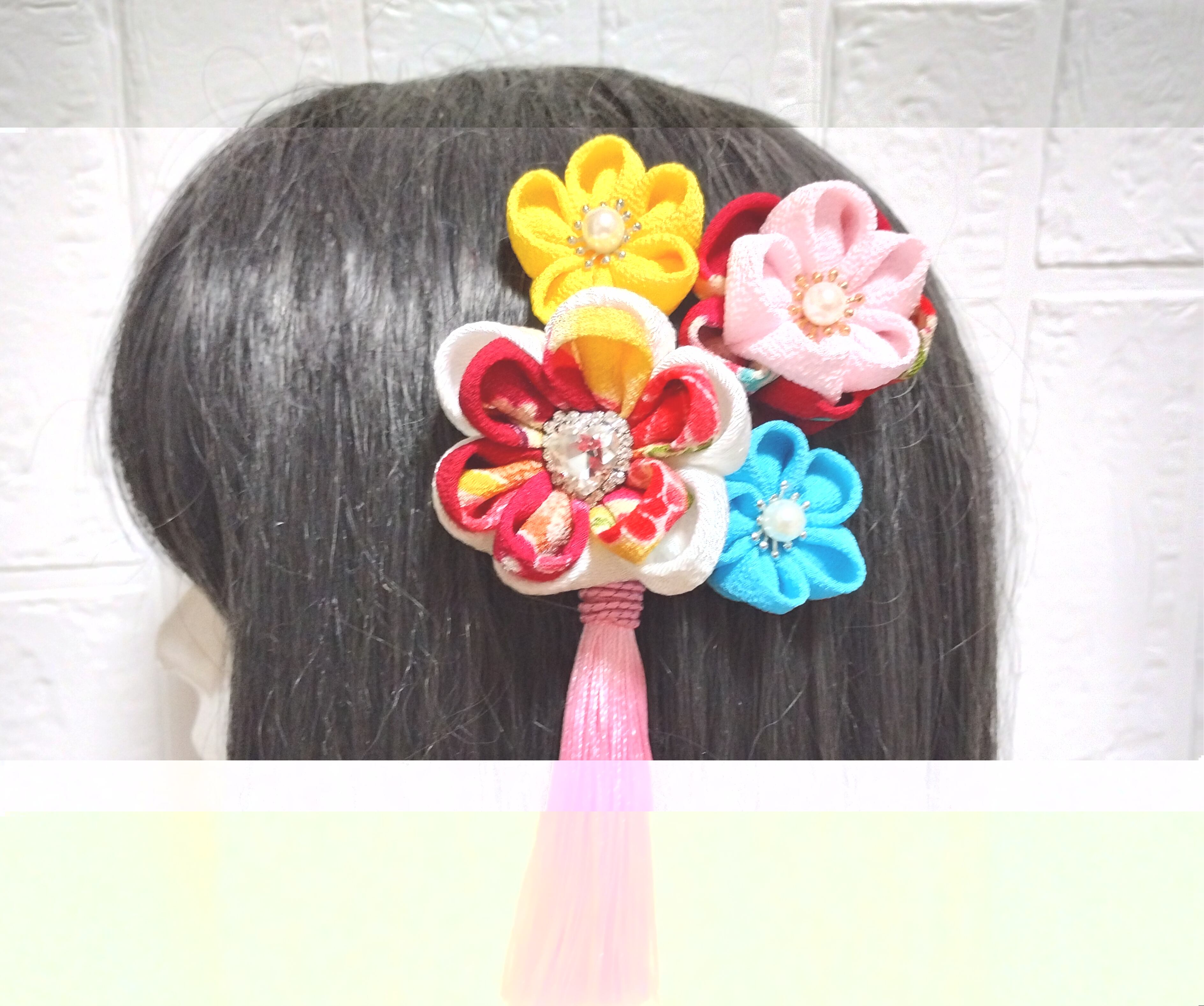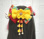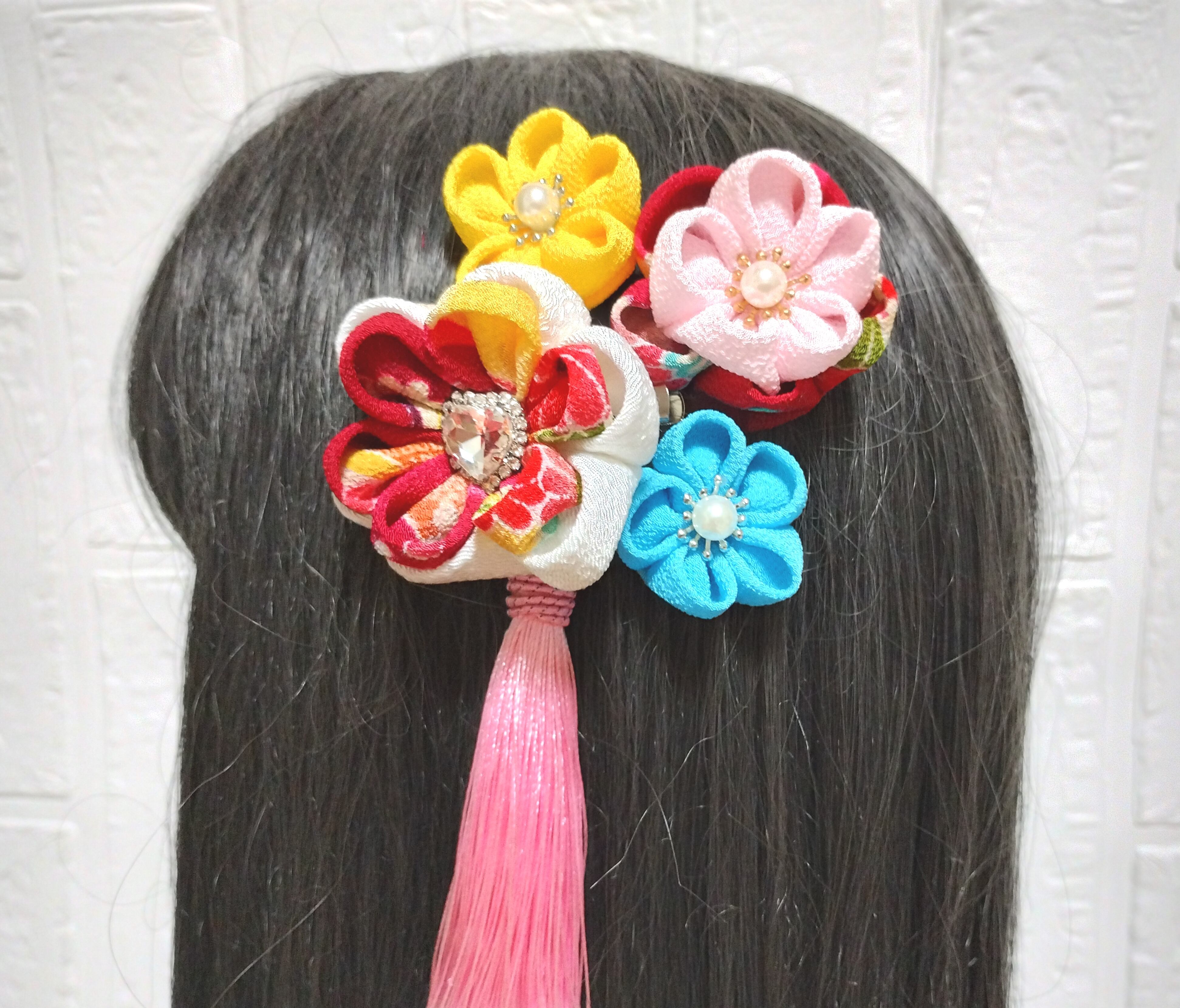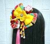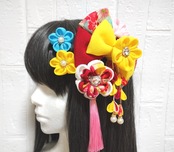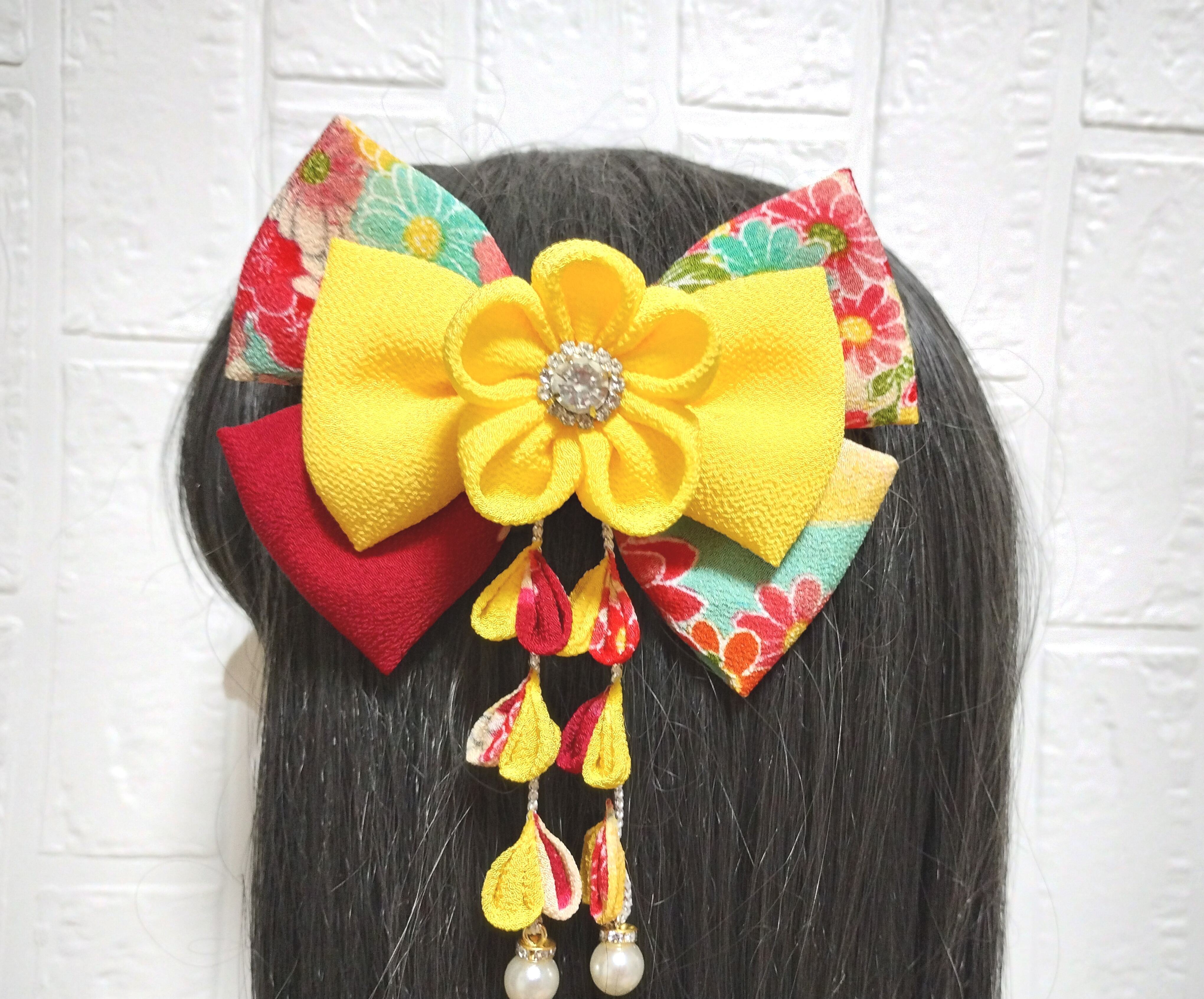 こちらは華やかなリボンと繊細なつまみ細工で作られた髪飾りです!ピンクやイエローのカラーが楽しめ、成人式や卒業式、七五三など特別な日の装いにピッタリなアイテムとなっています。