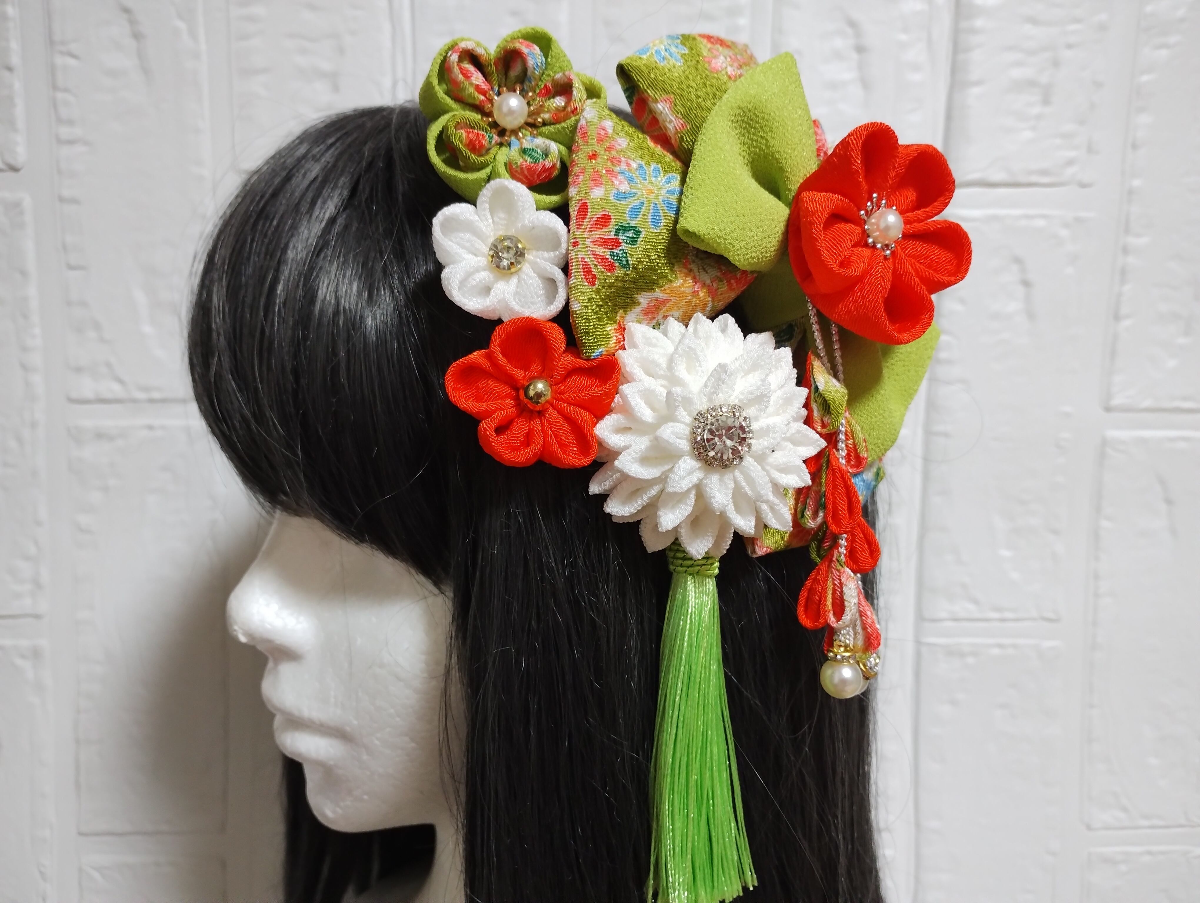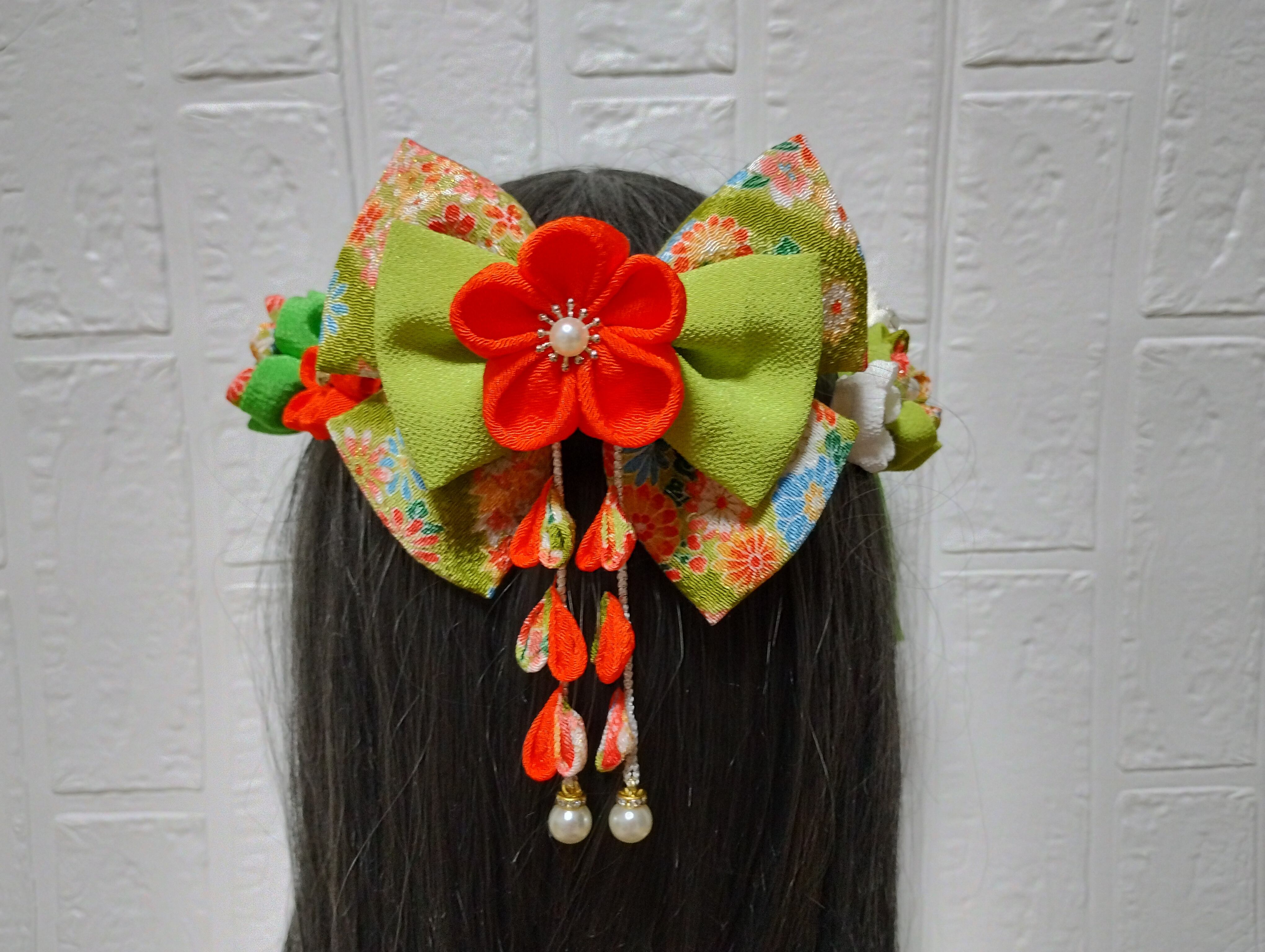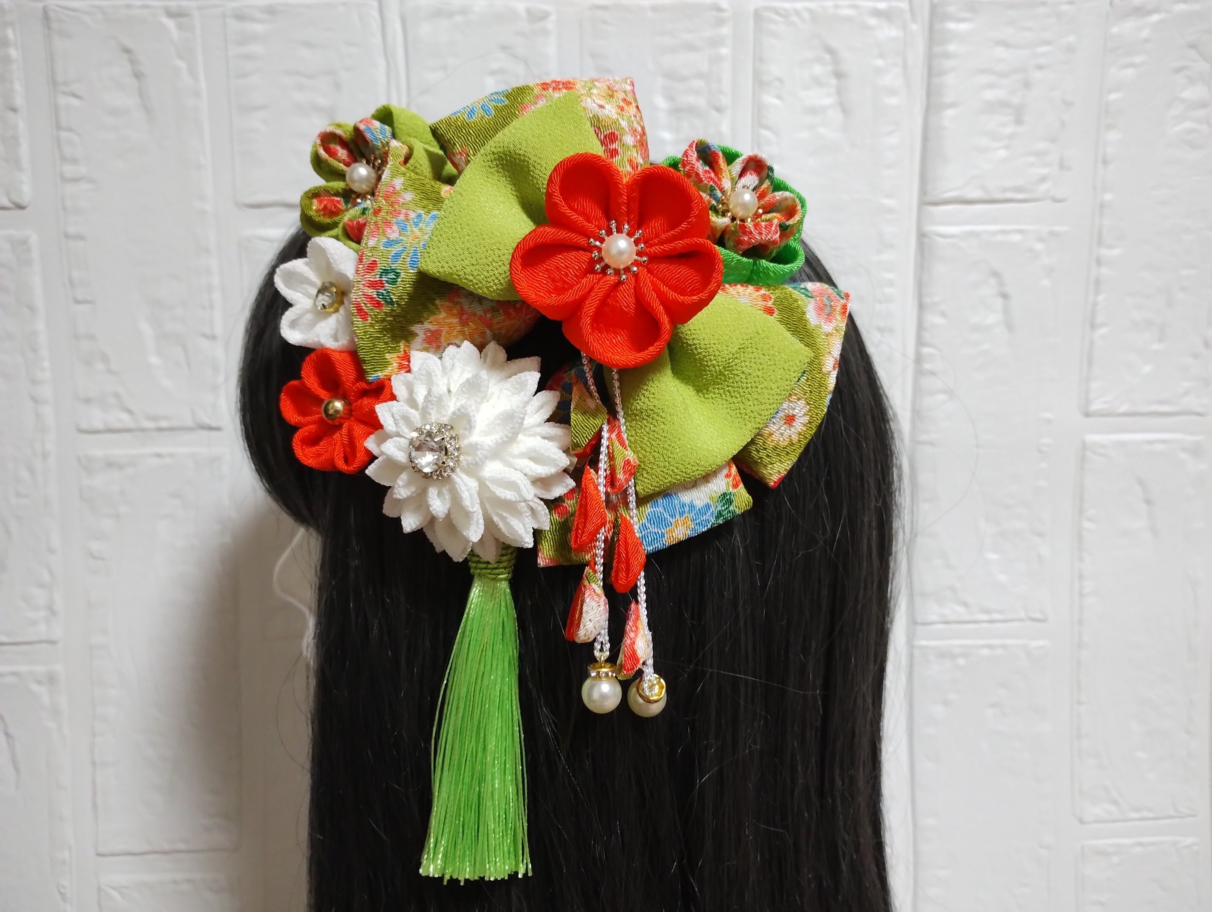 こちらは、華やかなグリーンとオレンジを基調とした髪飾りです!成人式や卒業式、七五三など、特別な日の装いにぴったりなアイテムとなっております。繊細なつまみ細工で一つ一つ丁寧に作られており、和装に彩りを添えて、あなたの美しさを際立たせます。