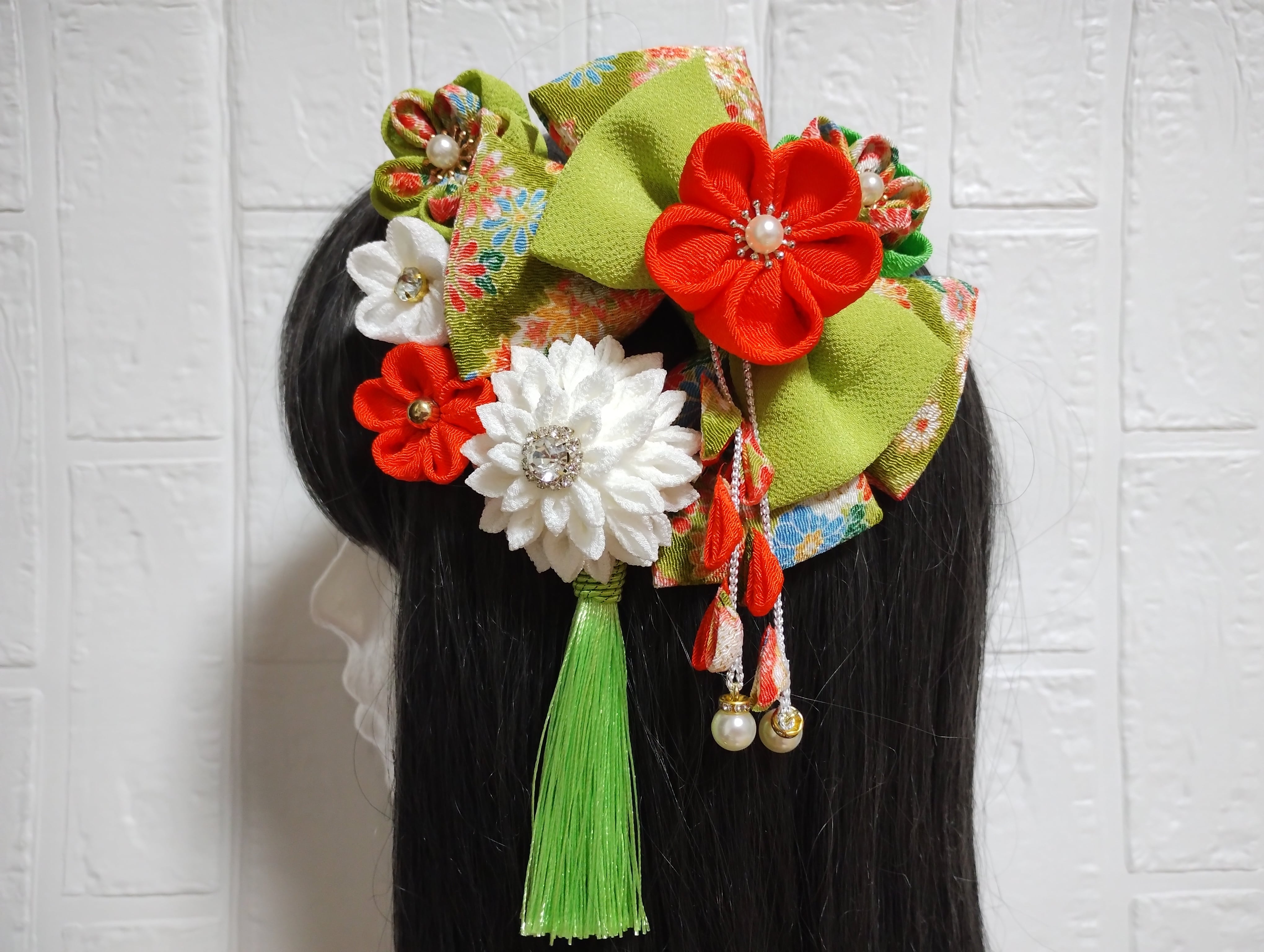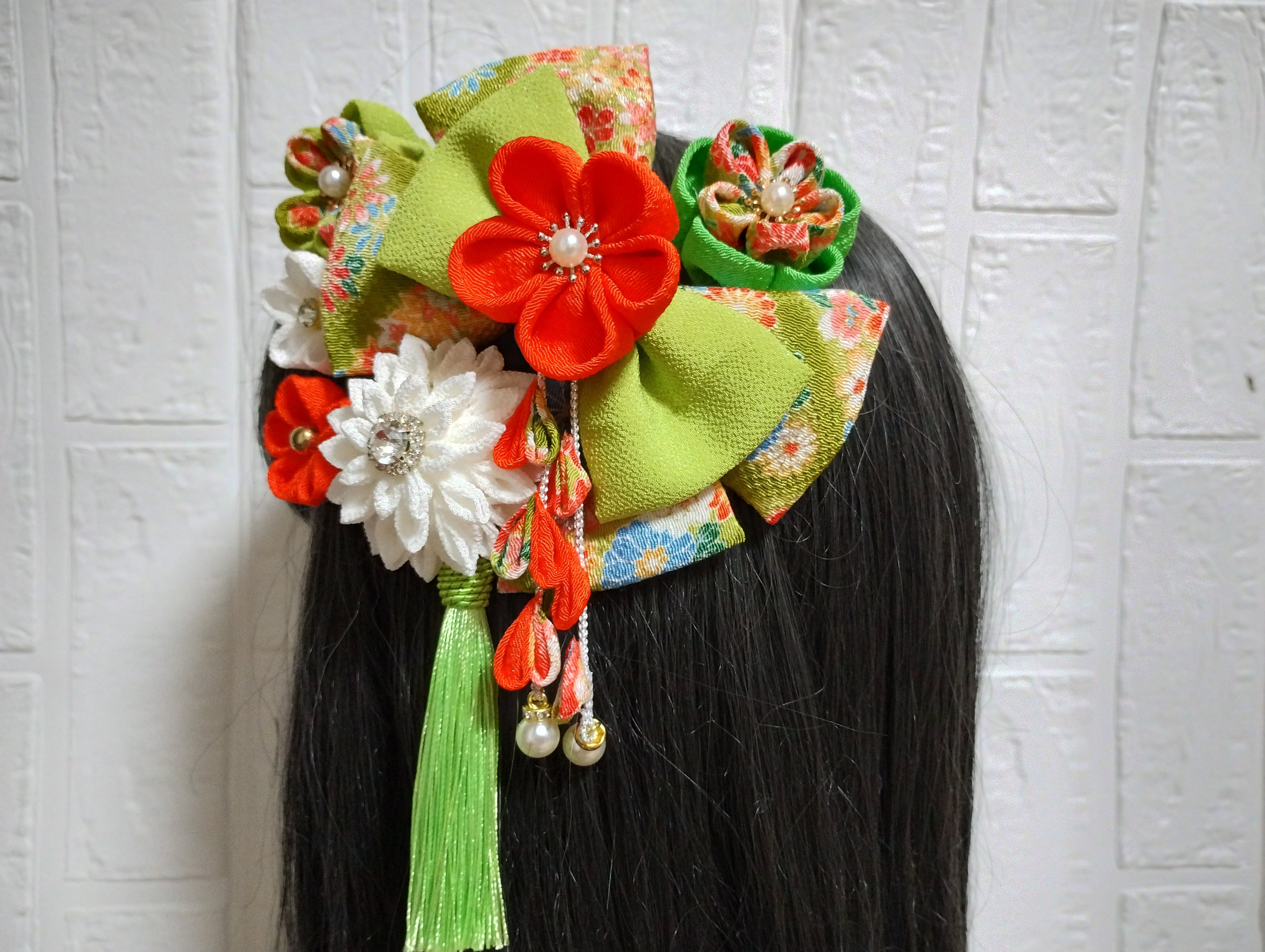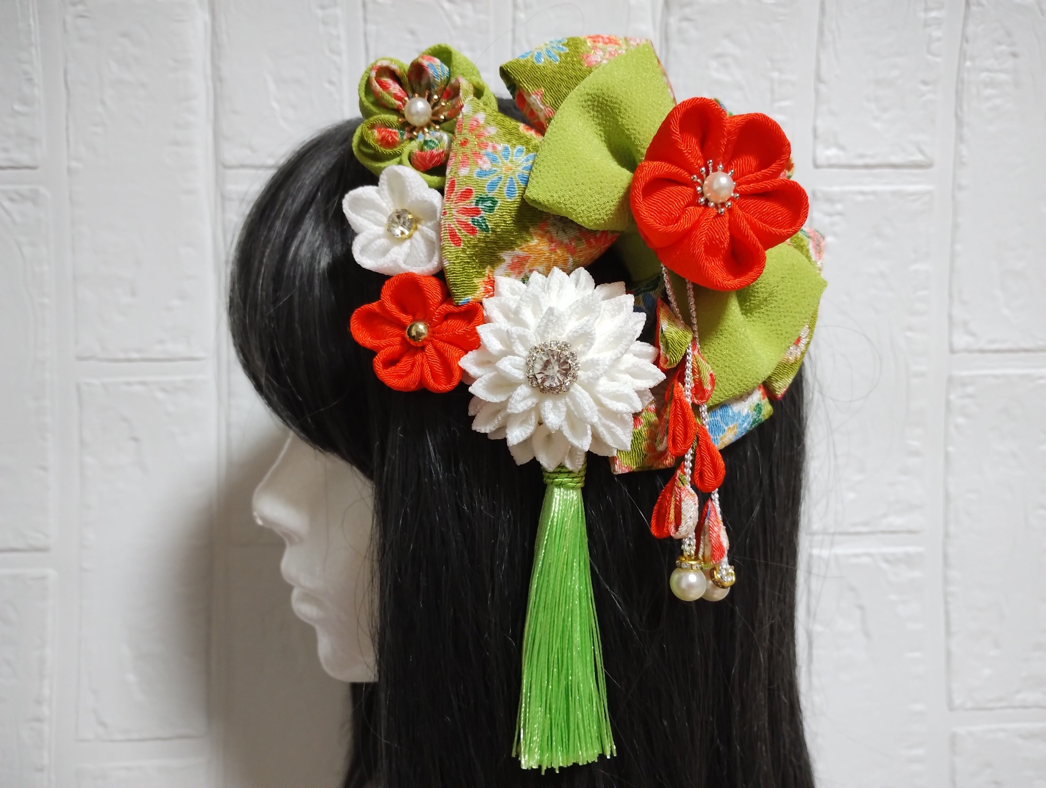 こちらは、華やかなグリーンとオレンジを基調とした髪飾りです!成人式や卒業式、七五三など、特別な日の装いにぴったりなアイテムとなっております。繊細なつまみ細工で一つ一つ丁寧に作られており、和装に彩りを添えて、あなたの美しさを際立たせます。