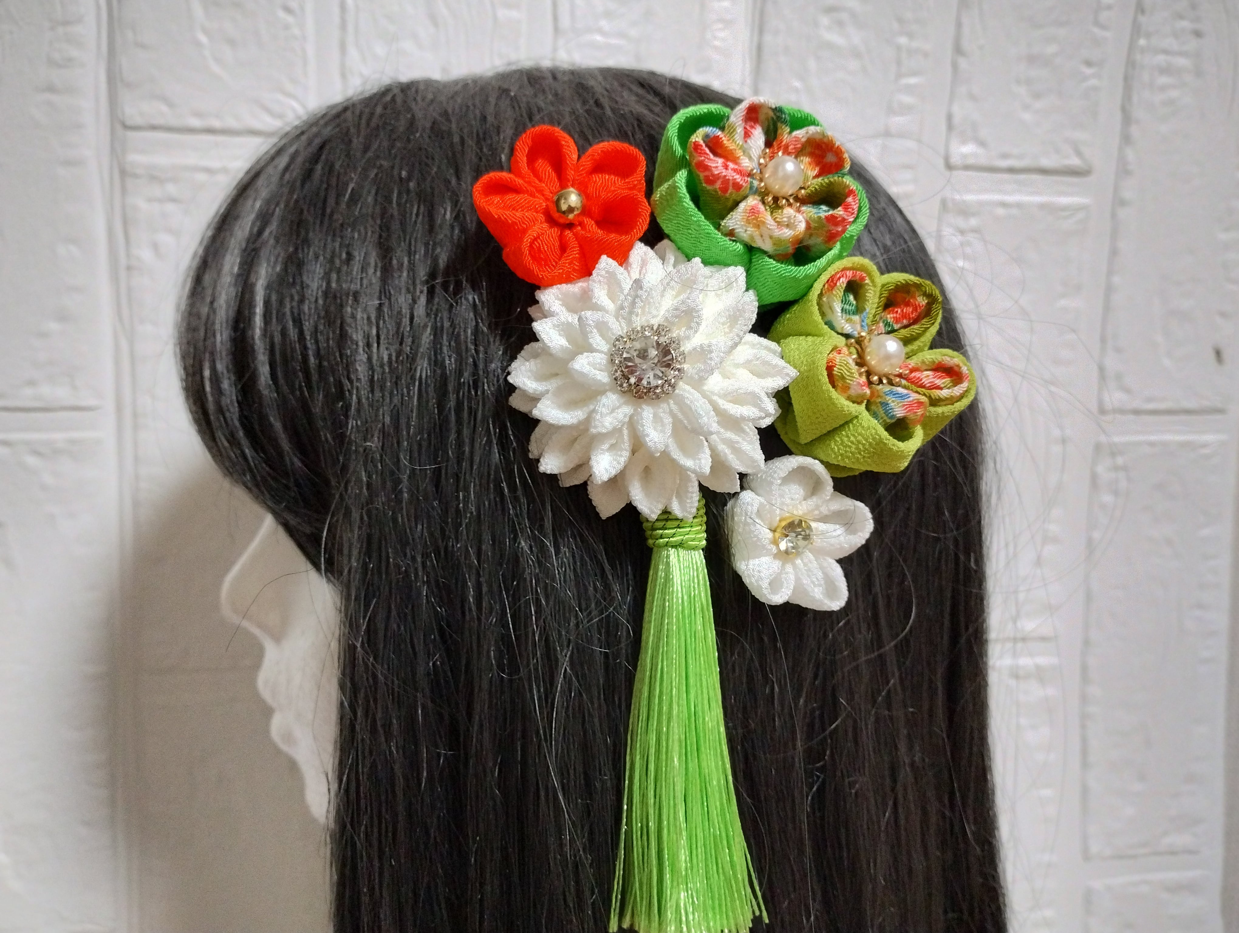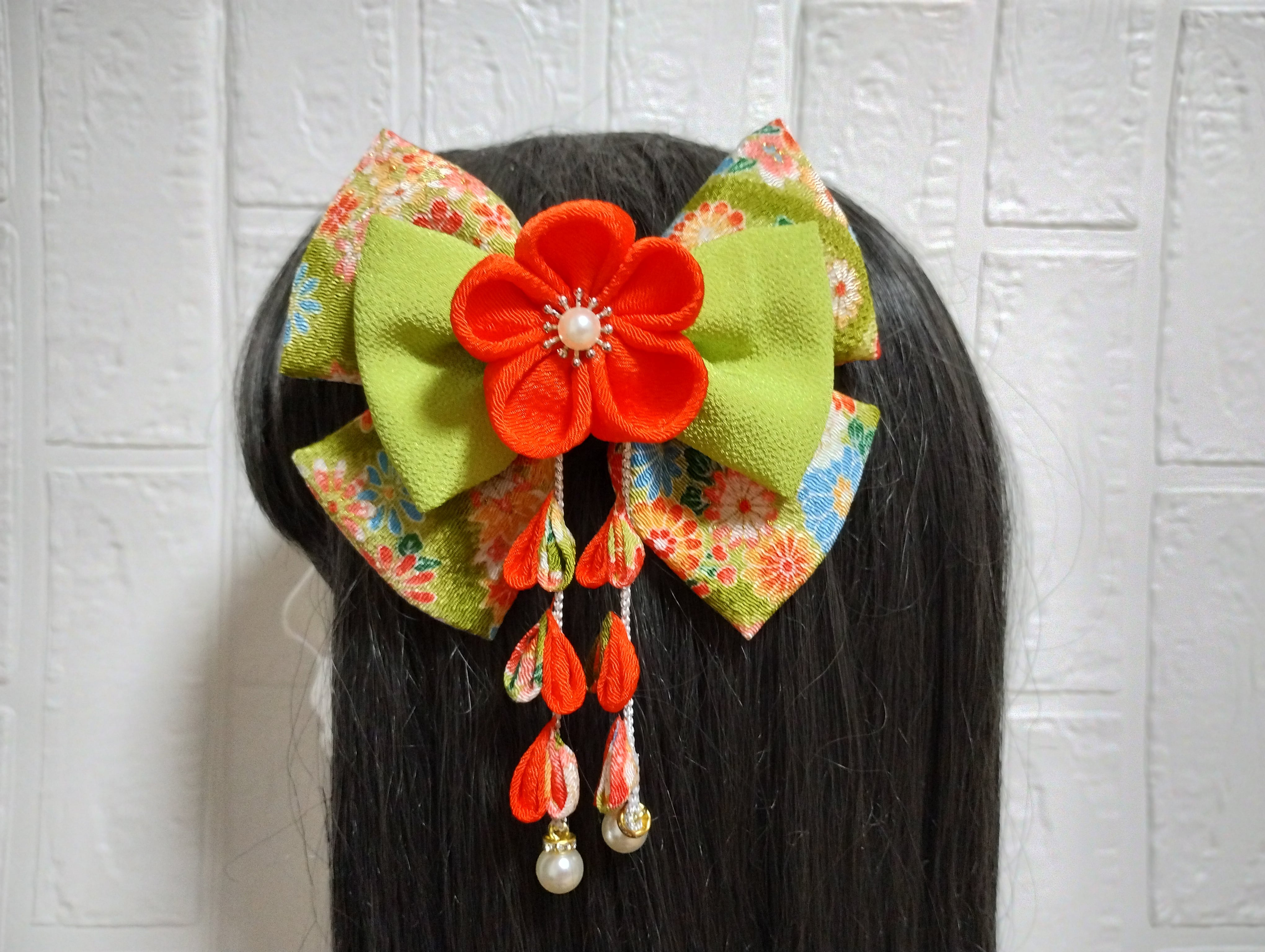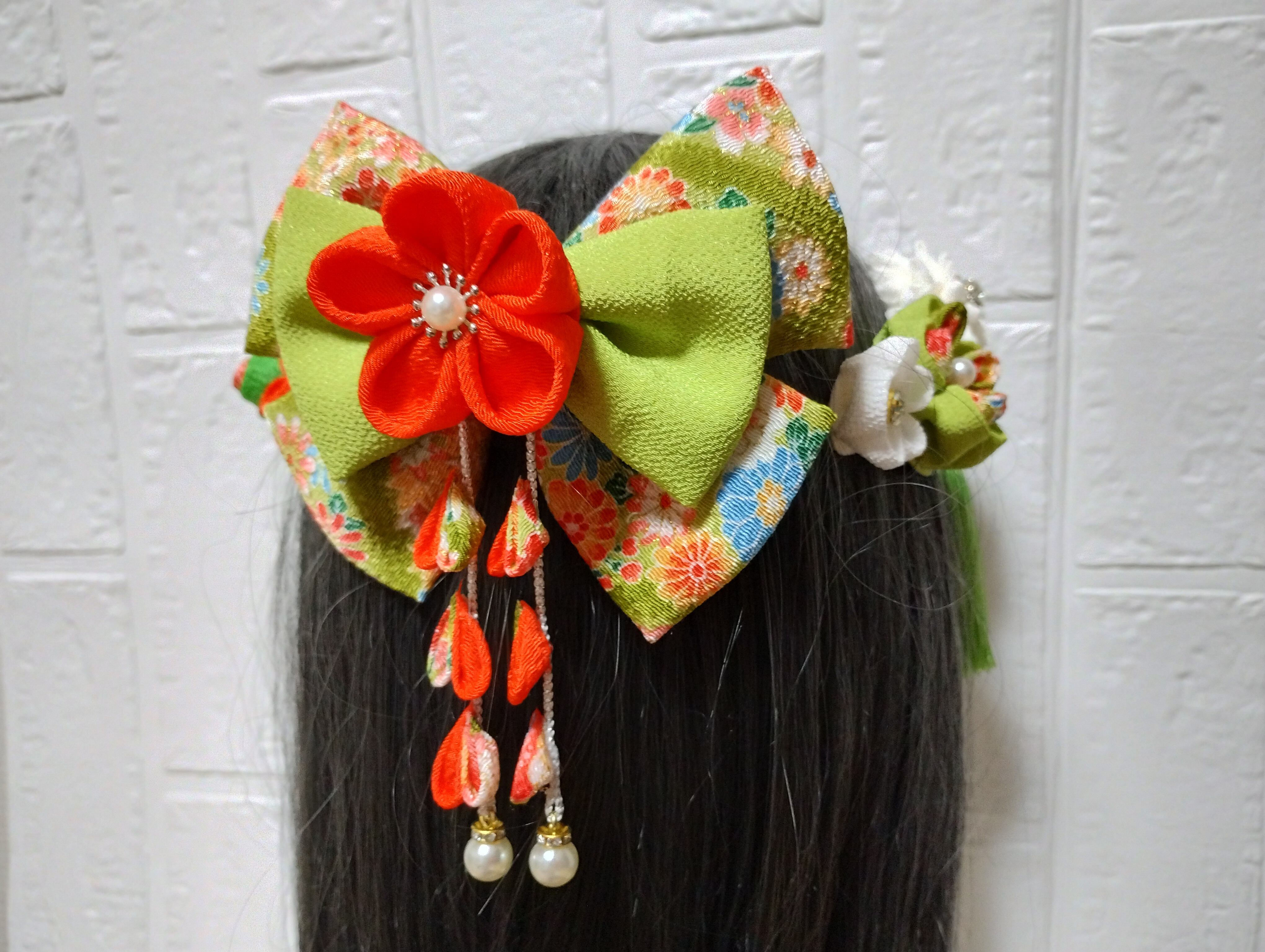 #成人式 #成人式髪飾り #卒業式髪飾り #七五三髪飾り #和装小物 #ヘアアクセサリー #ハンドメイド #つまみ細工 #髪飾り #グリーン #オレンジ